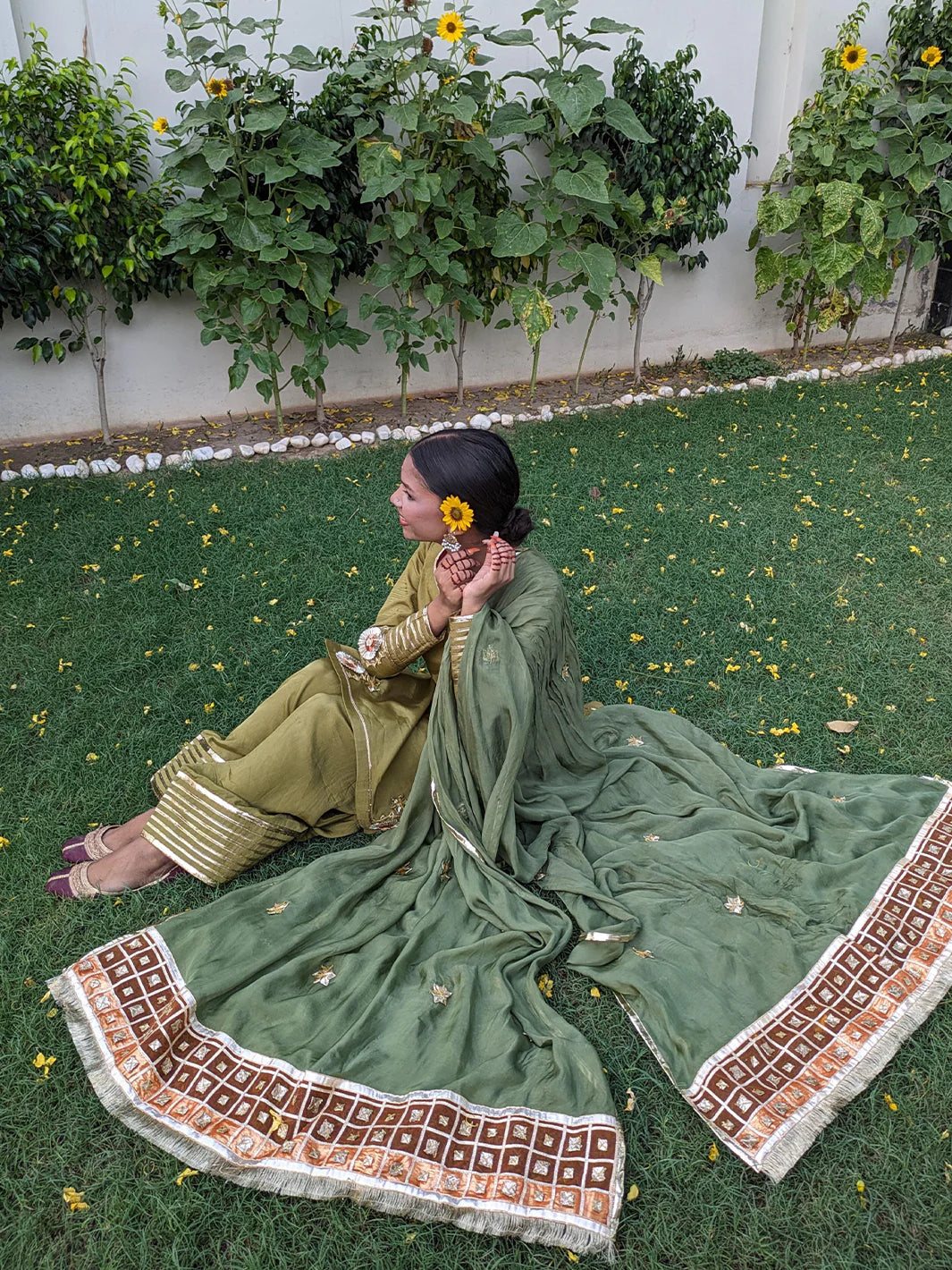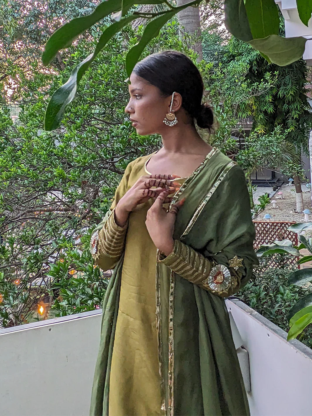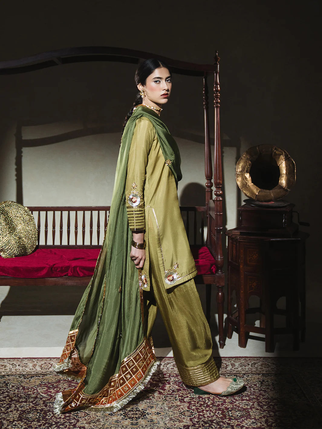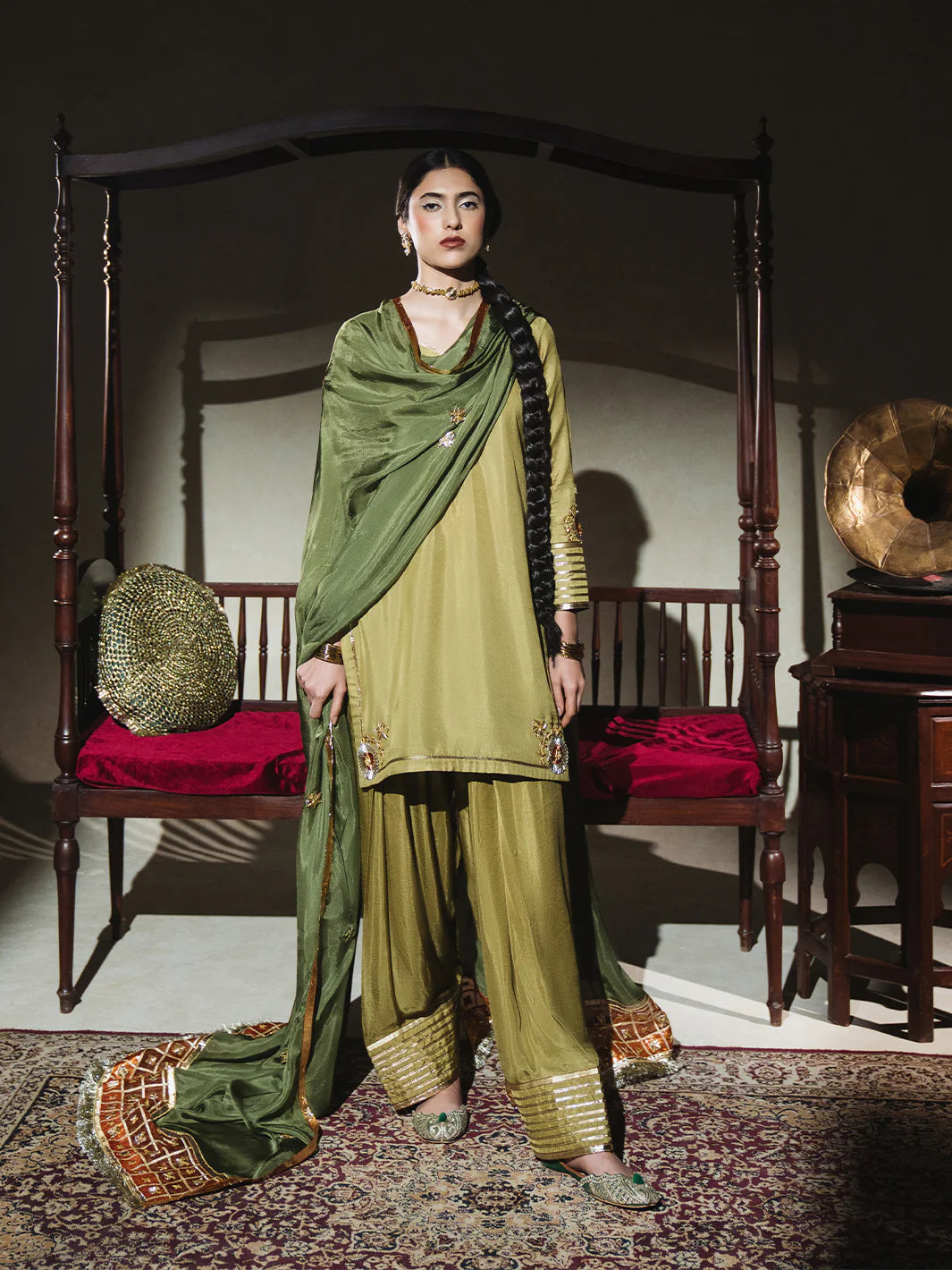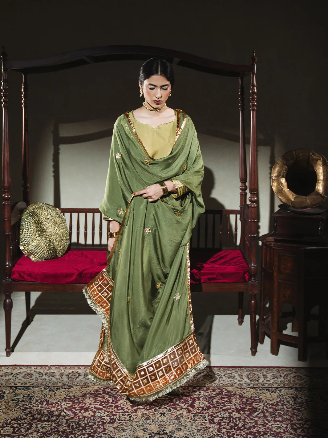 A soft zaitooni grip fabric kurti paired with a classic farshi shalwar, both detailed with subtle gota work and finished with traditional cuts. The kurti features a diya neckline and champak-inspired gota patti motifs, while the farshi shalwar adorned with gota kinari pauncha. The look comes together with a kaayi sabz silk dupatta, designed with a contrasting narangi organza pallu, barfi-shaped gota accents, and a sunehri kiran border — understated, festive, and full of old-world charm.