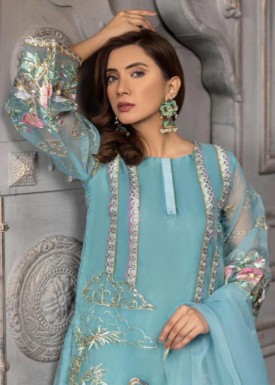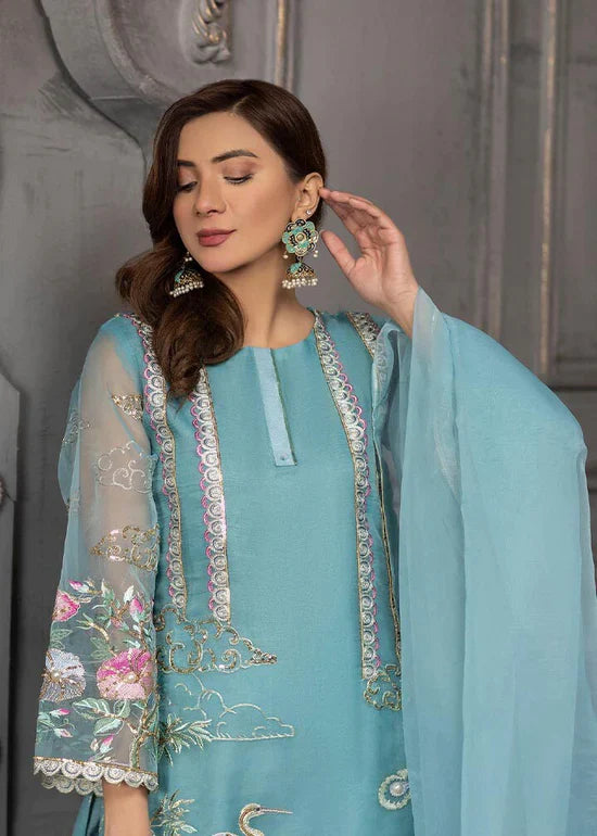Description: The ravishing Sea Green Organza shirt has perfectly distributed hues of coral Blush, Fuchsia Rose, Electric Blue and Honey Gold,i ts beautifully embroidered with resham and metallic threads and sequins. details: Sea Green organza shirt has Pearl tessels on Neckline with Scalloped Hemline and Sleeves. The Embroidered Organza Palu and Modern Boot-cut draped completing the Perfect look of the Garment. * Shirt Length : 38 This is 3 Piece stitched outfit