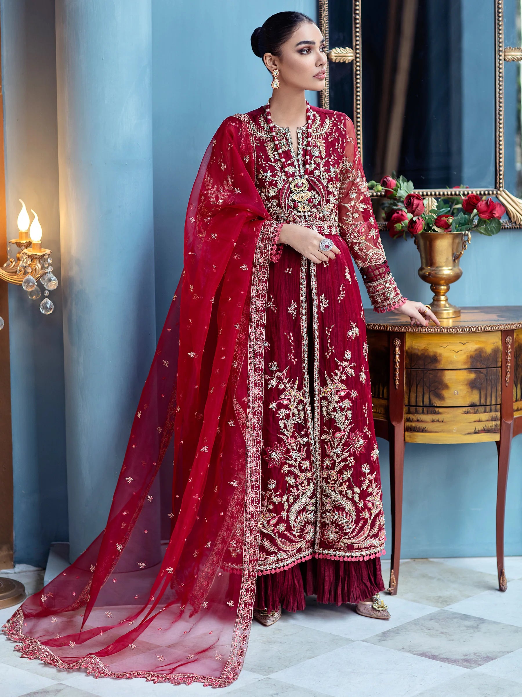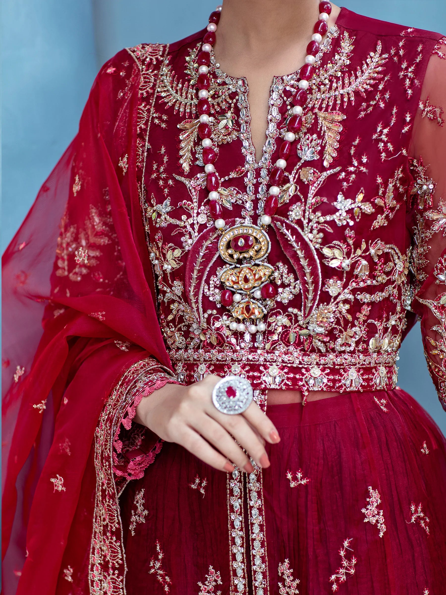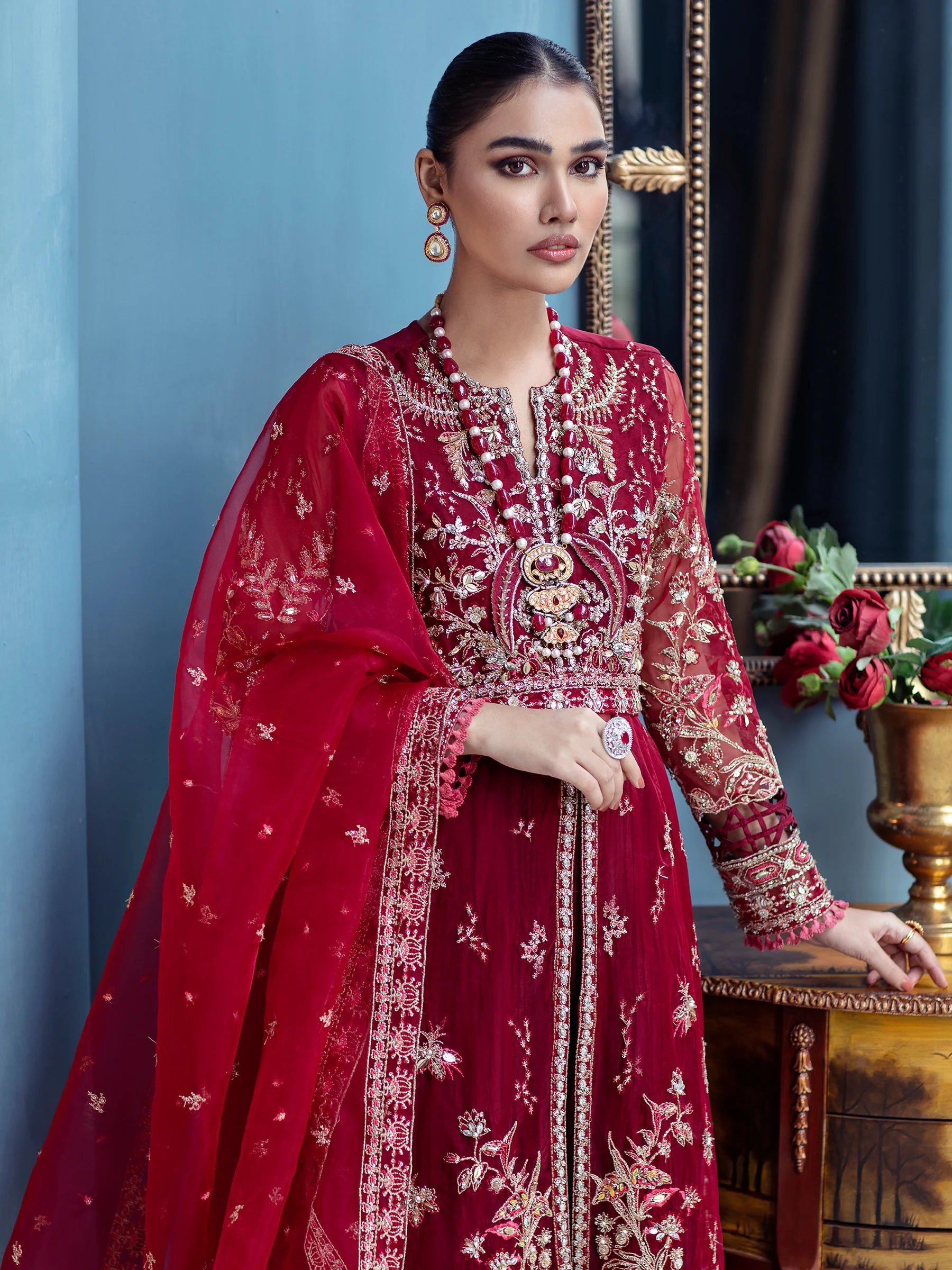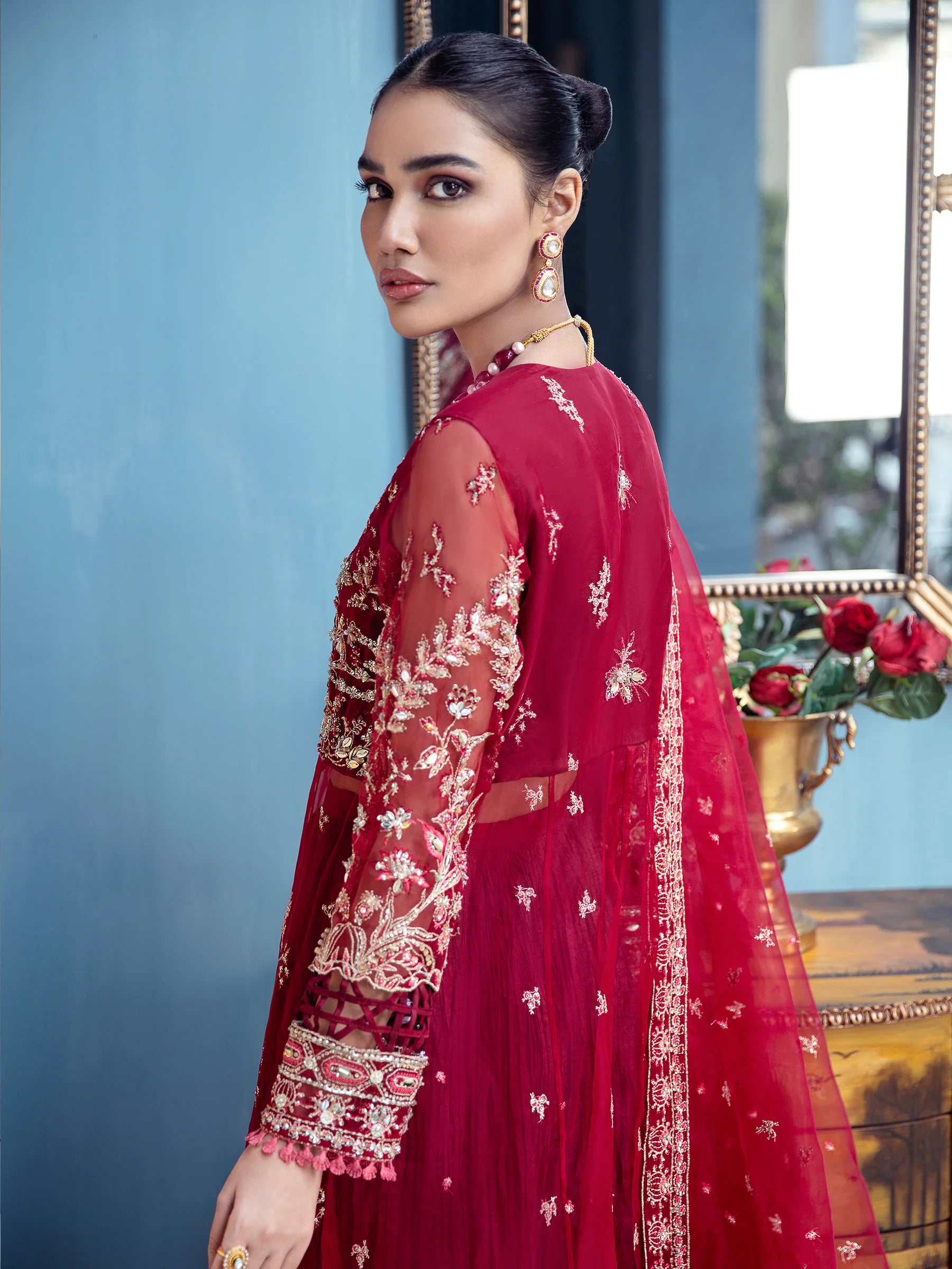 Make a statement in our striking red ensemble “Gul Mohar,” – giving the traditional organza a modern cut; this piece has intricately embroidered motifs, enhancing the beauty of the fabric. Pair the look with the signature crushed flair pants.