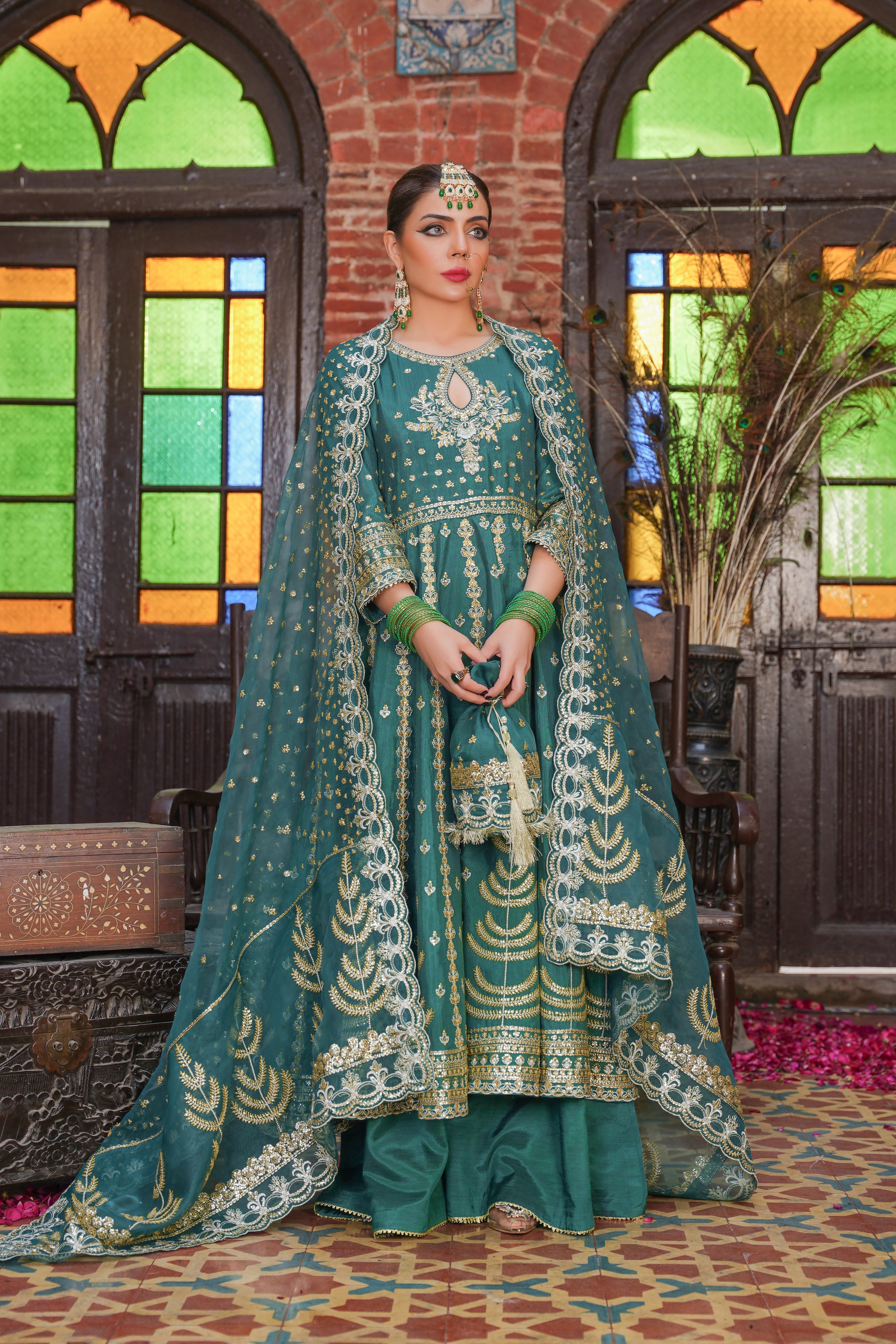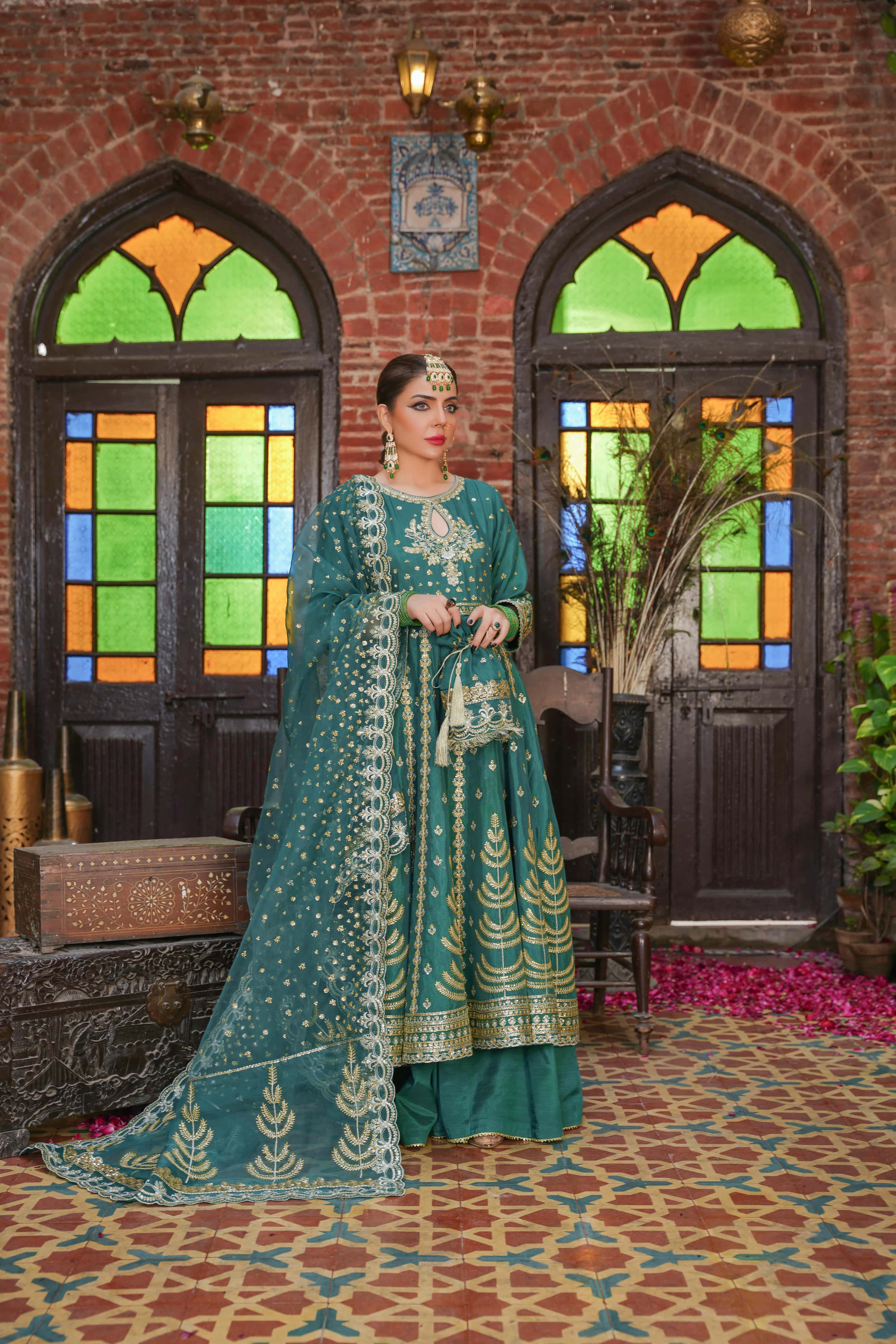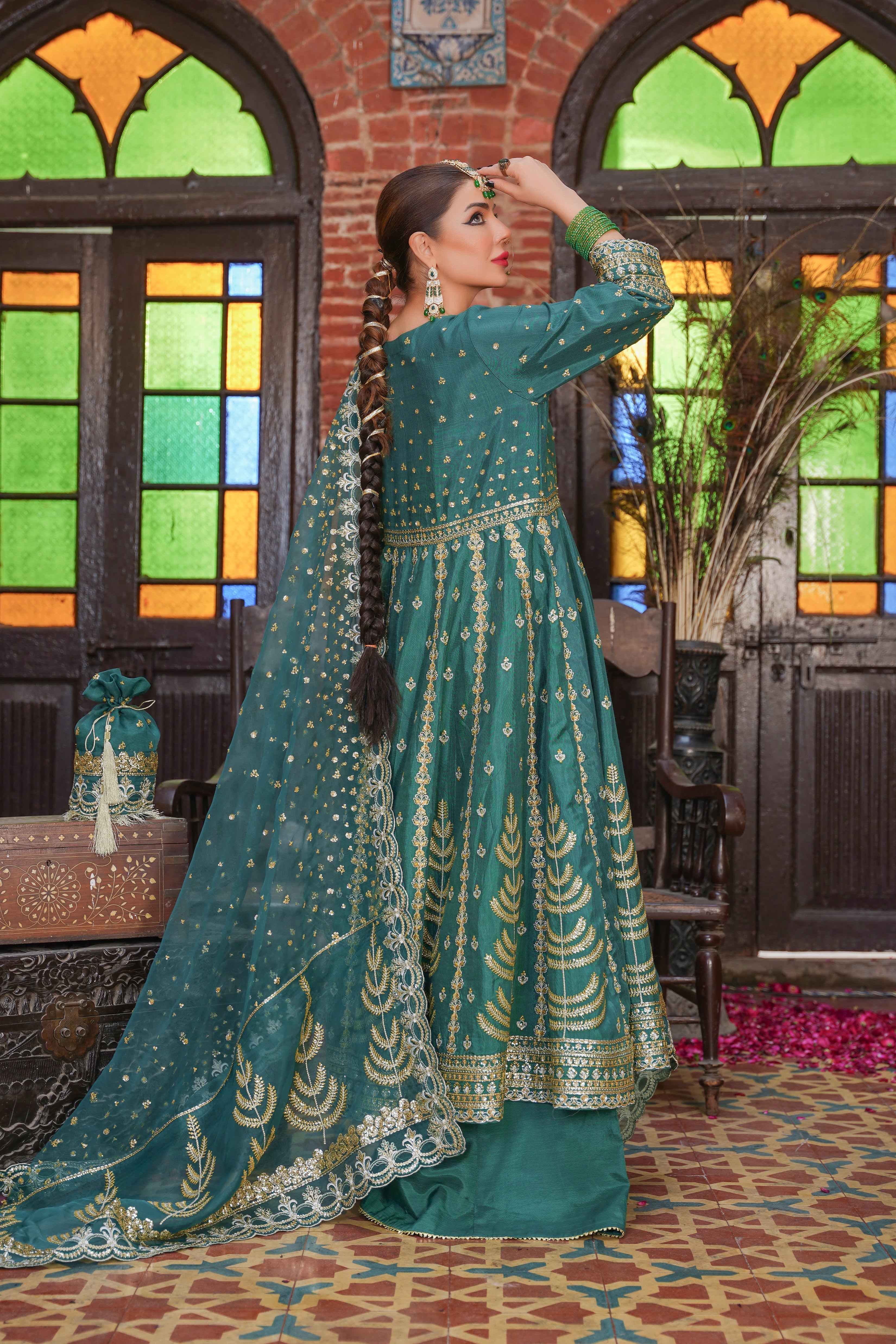 This exquisite Gull Bahar raw silk pishwas is a perfect blend of luxury and elegance, featuring heavily embroidered panels that enhance its regal charm. The ensemble includes a front and back blouse, both adorned with intricate embroidery, complemented by a delicate organza neckline patch for added sophistication. The blouse’s sleeves are crafted from sheer organza, also embellished with fine embroidery, offering a soft yet opulent touch. Paired with this, the organza dupatta boasts a heavy palloo and a four-sided embroidered border, adding a symmetrical and graceful finish to the entire look, making it an ideal choice for a grand celebration or wedding.