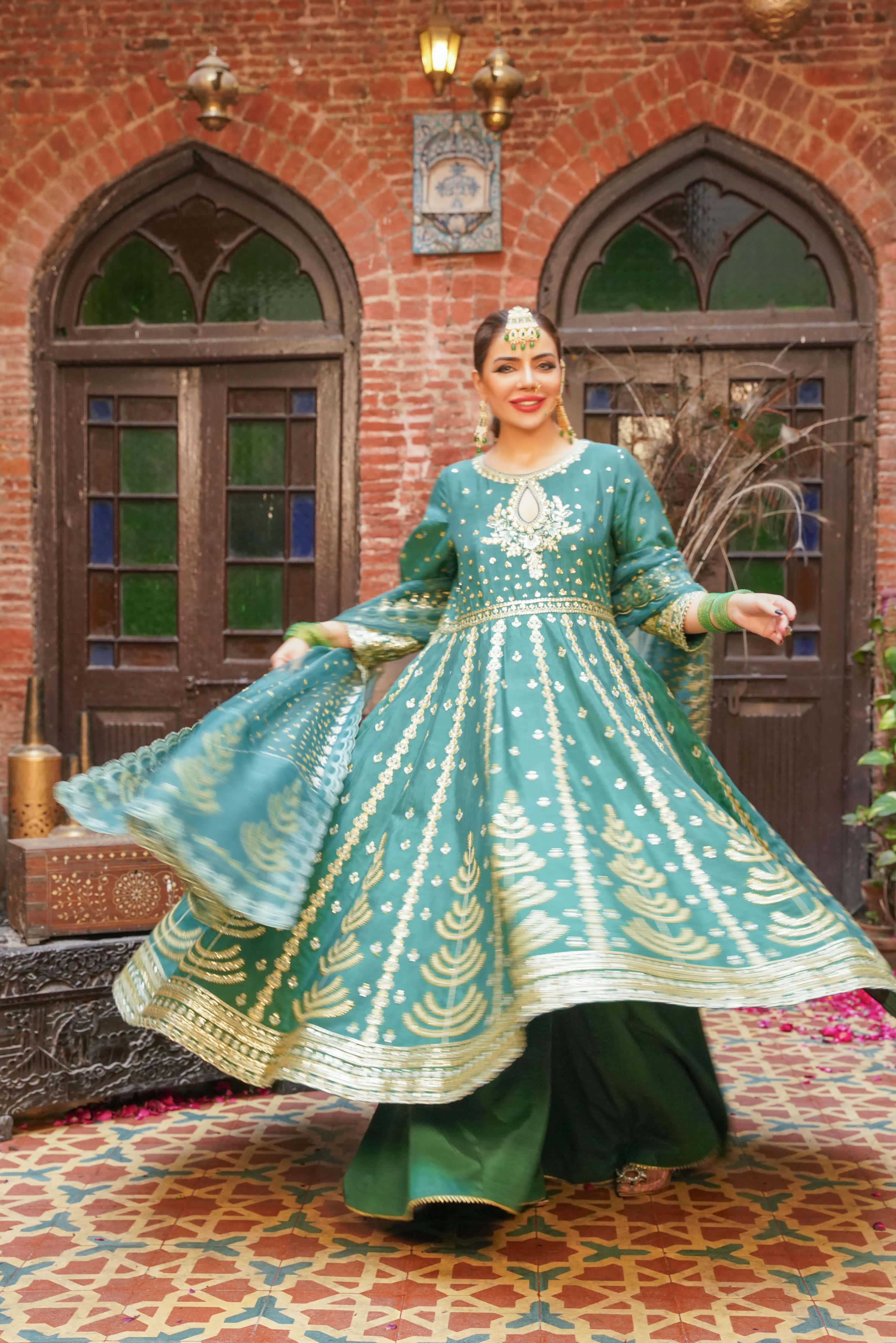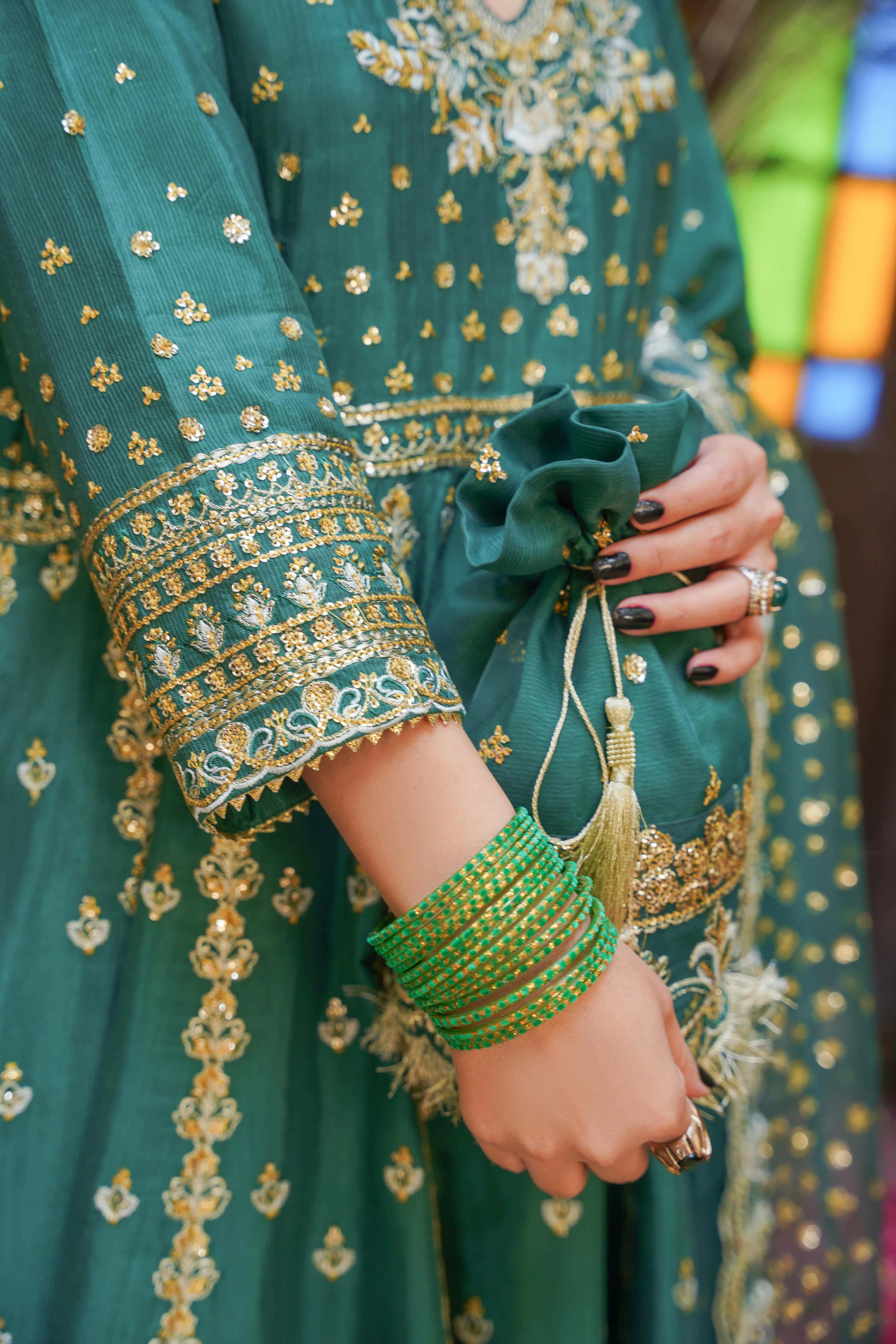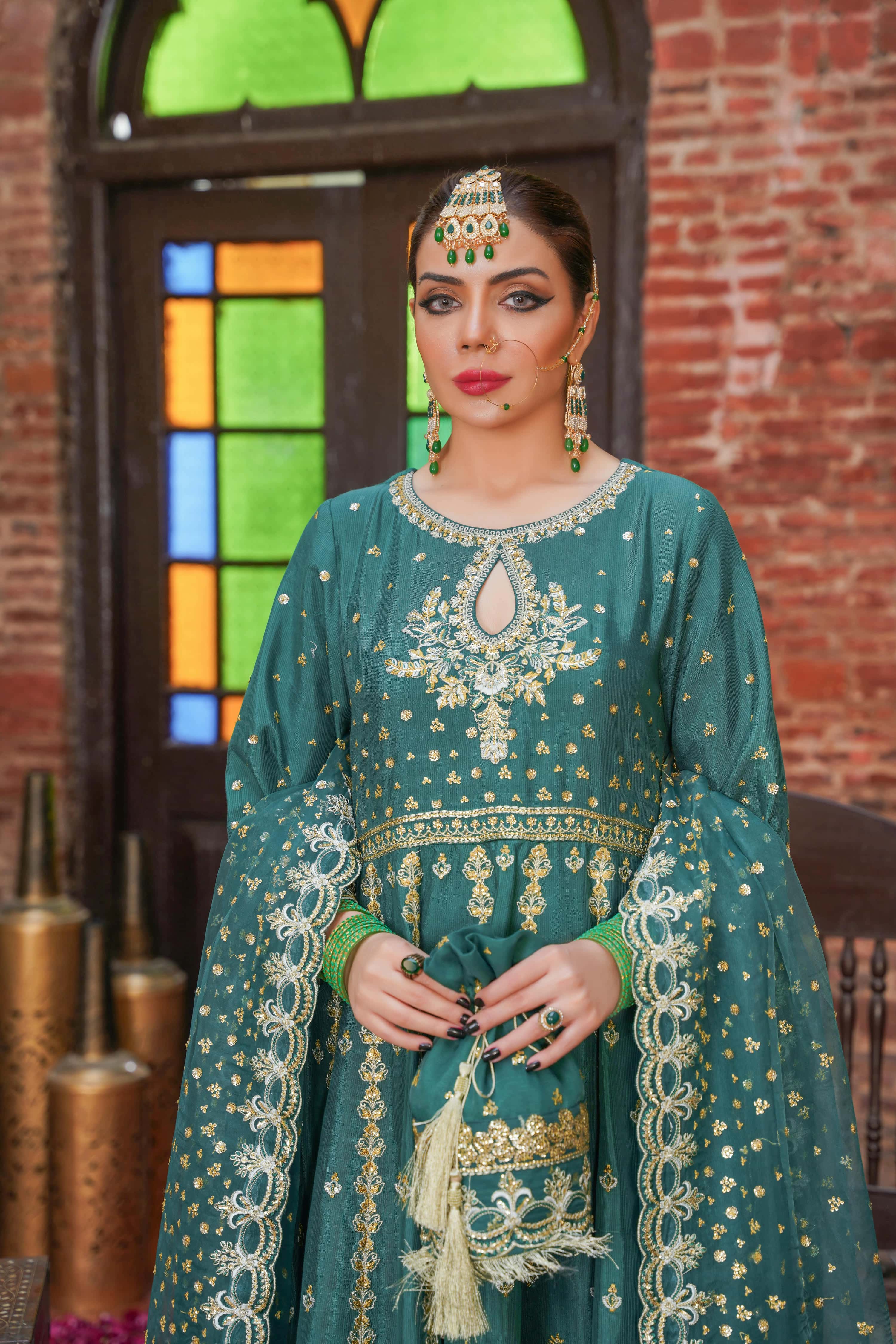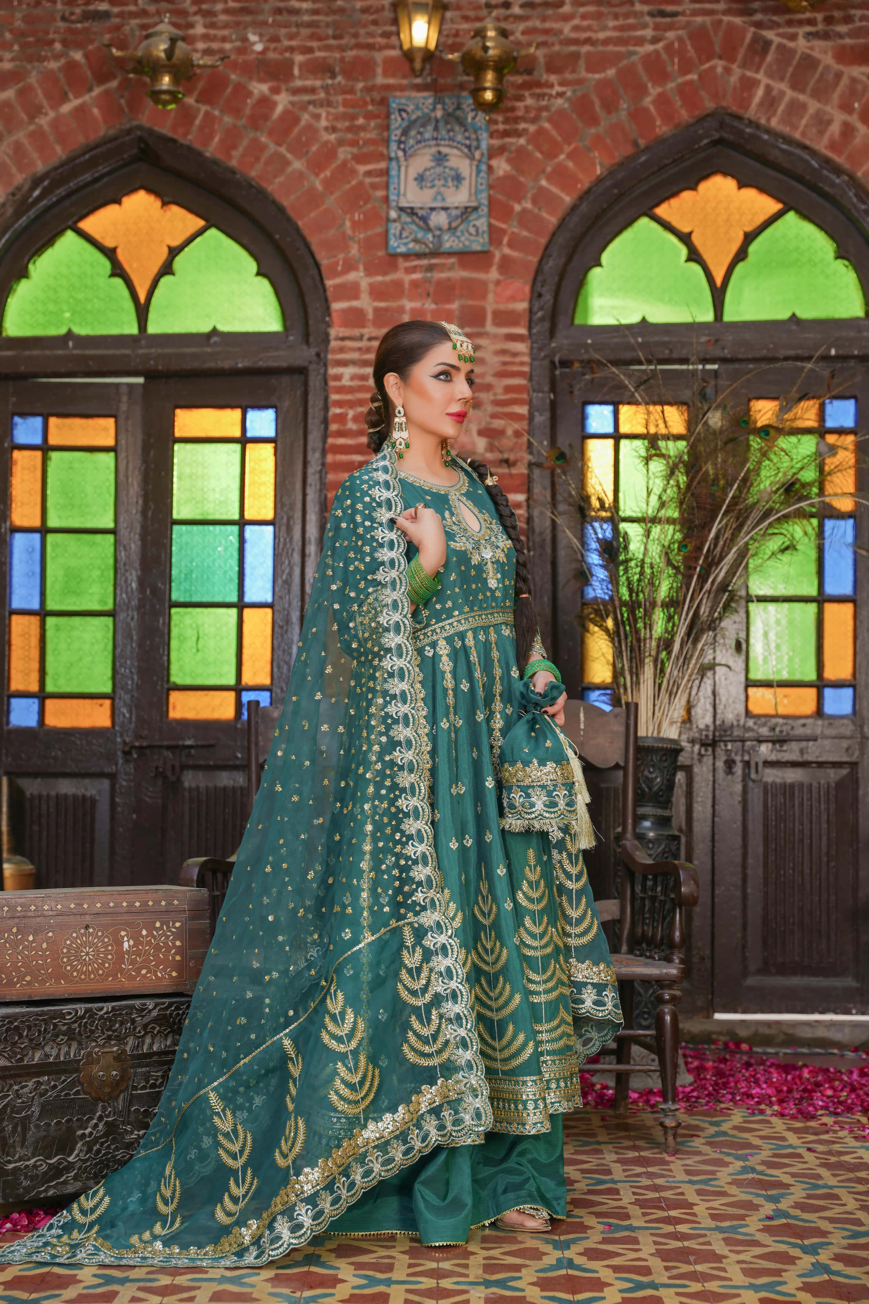 This exquisite Gull Bahar raw silk pishwas is a perfect blend of luxury and elegance, featuring heavily embroidered panels that enhance its regal charm. The ensemble includes a front and back blouse, both adorned with intricate embroidery, complemented by a delicate organza neckline patch for added sophistication. The blouse’s sleeves are crafted from sheer organza, also embellished with fine embroidery, offering a soft yet opulent touch. Paired with this, the organza dupatta boasts a heavy palloo and a four-sided embroidered border, adding a symmetrical and graceful finish to the entire look, making it an ideal choice for a grand celebration or wedding.
