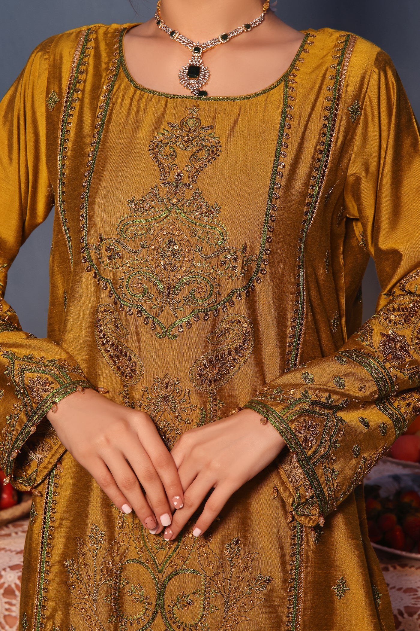 Behold the captivating allure of the summer season with our three-piece embroidered raw silk suit. Curating a mesmerizing composition with meticulous threadwork, kora, sequins, moti, and crystals. It comes with a delicate sequin-embroidered dupatta and dyed trousers, resplendent in munsell yellow shade, delivering perfect sophistication to bloom this season.