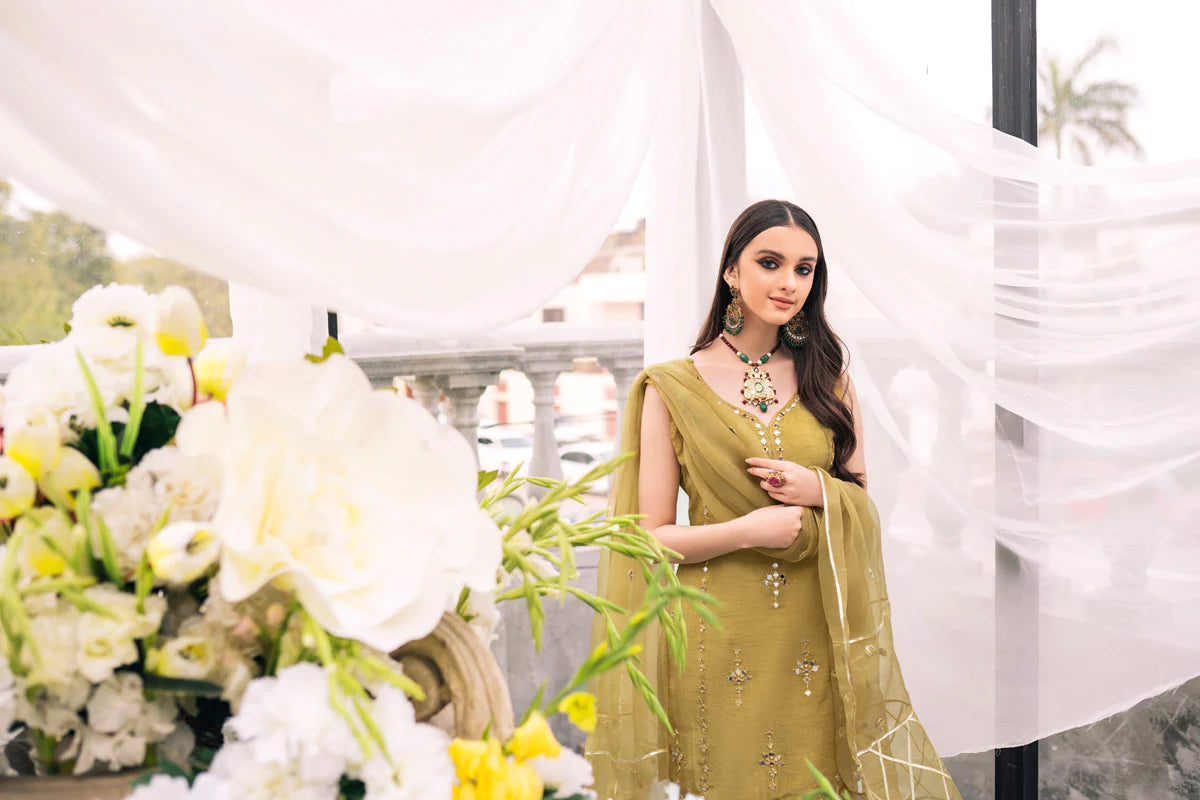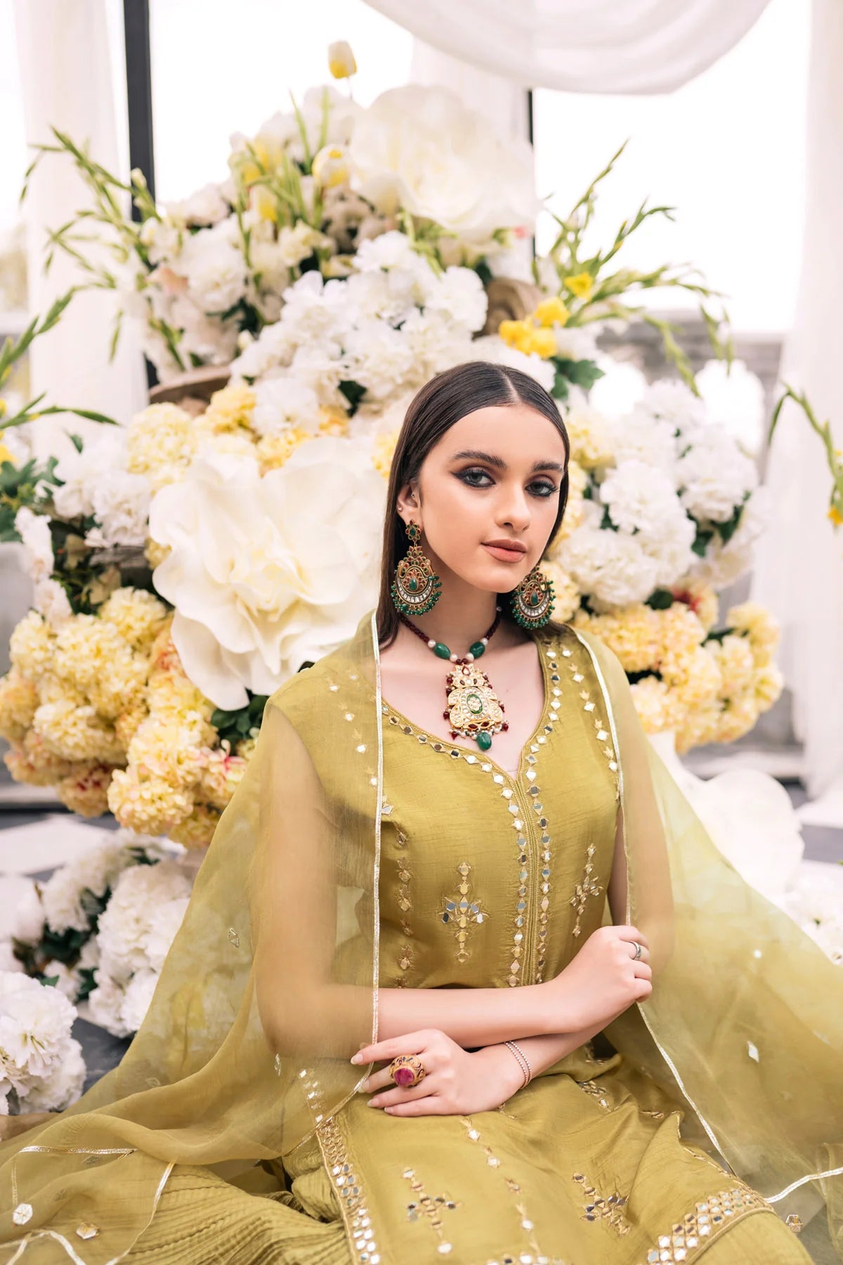 This Golden Saviour Affair is a perfect fit for a festive event. The Korean raw silk shirt is encrusted with mirror and golden threadwork emanating elegance. The bottom is a crosh medium silk sharara that radiates the ideal gilt shade. The organza dupatta with gold gotta and mirror chatta embellishments complete the absolute fashion look