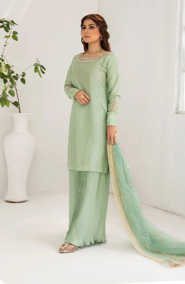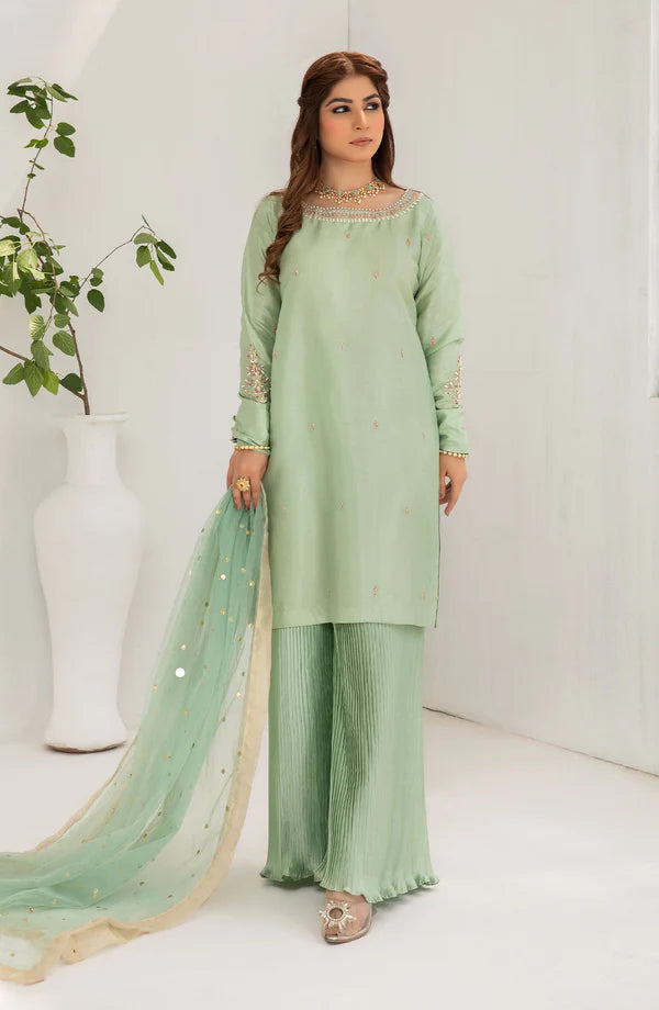 A straight raw silk shirt with. Having hand embroidery and hand embellishment on neckline and sleeves . Beautiful crushed silk trouser and net kiran dupatta gives you trendy and traditional look for aftar dinners and eid.