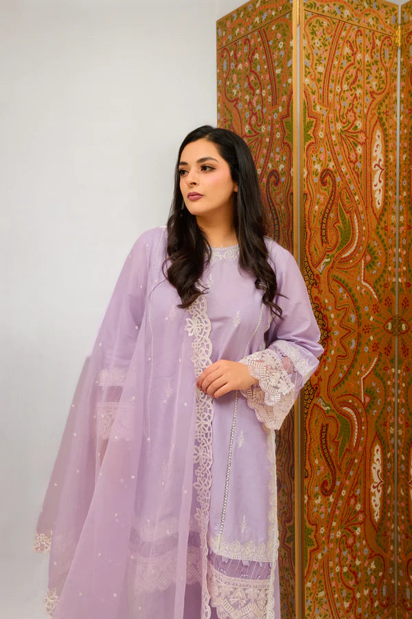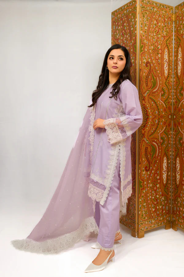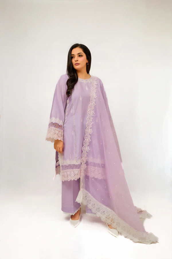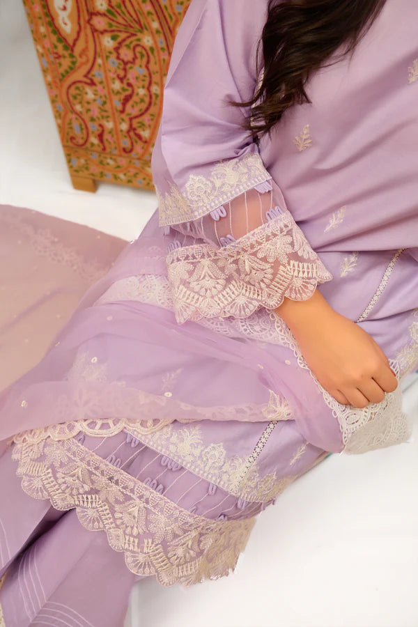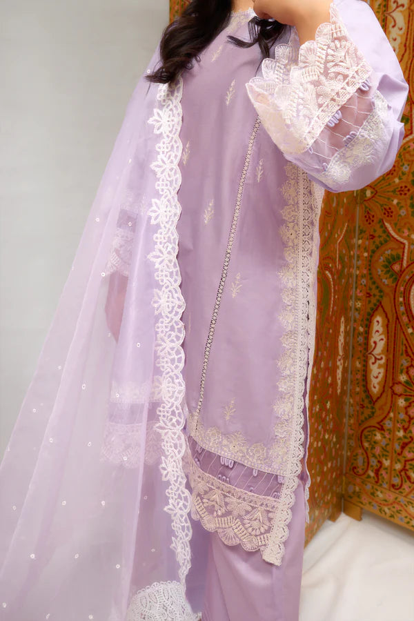 This exquisite design is a delightful combination of lilac hues. Made with light breezy cambric straight shirt with side with side embroidered borders that provide a contemporary twist. Adorned with scattered boti embroidery and delicate ivory thread. The back is also not ignored. It comes with an organza dupatta that is completely covered in white embroidery with scallop on the sides. Further the hem embroidery completed the combination, lending a touch of elegance and charm to the whole appearance.