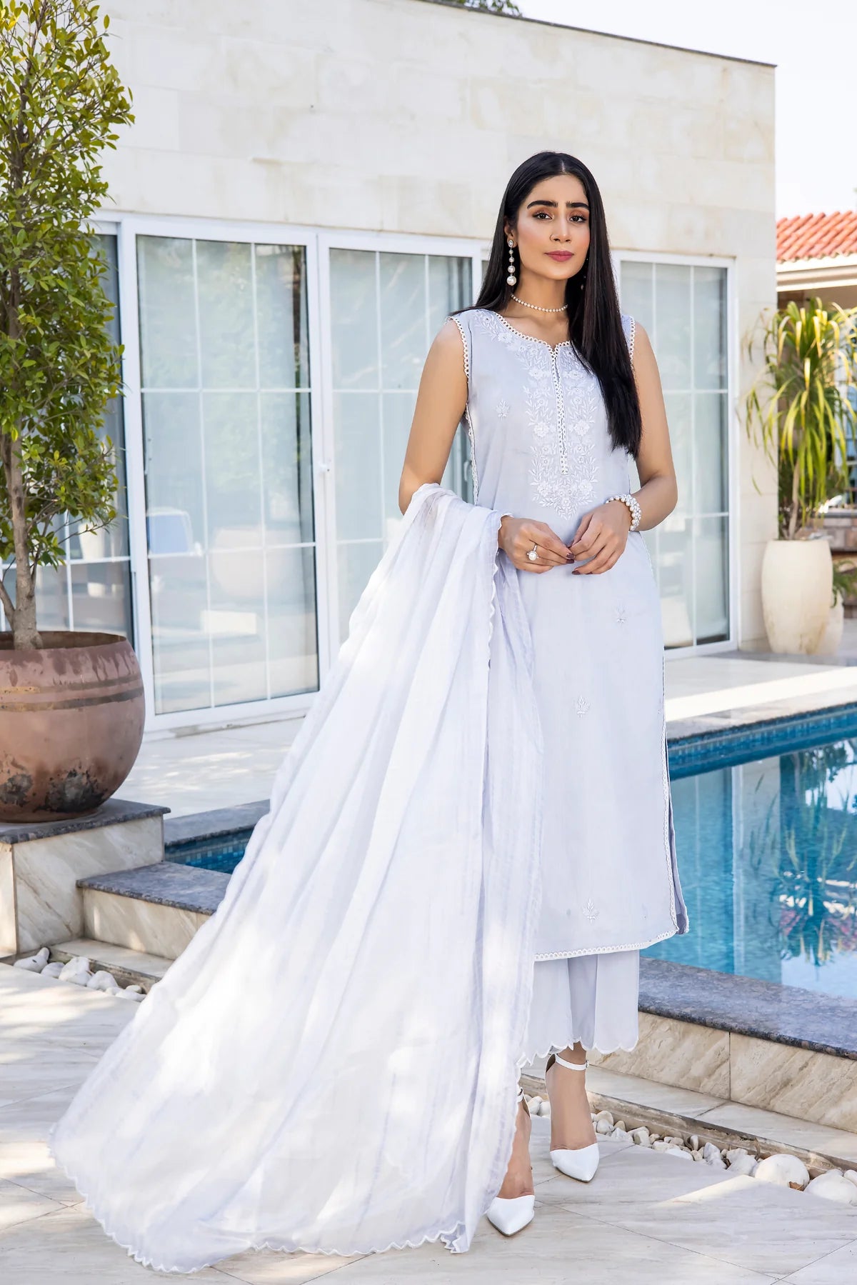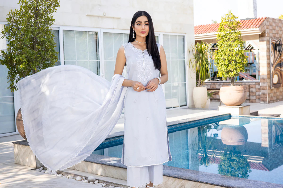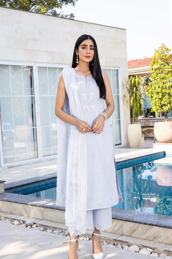 This Doriya Lawn outfit in a soft and elusive shade of powder blue is most certainly the belle of the wardrobe. The shirt is wrapped up in stone embellished floral embroidery and Chatta at the neckline and at regular spaces along the length exhibiting a drop-dead gorgeous look for the summers. The borders of the entire shirt piece are lined with encircling lacework manifesting intricacy. It comes with a pair of scallop harboring culottes. Tie and dye silk dupatta with scallops can be added separately to the outfit.