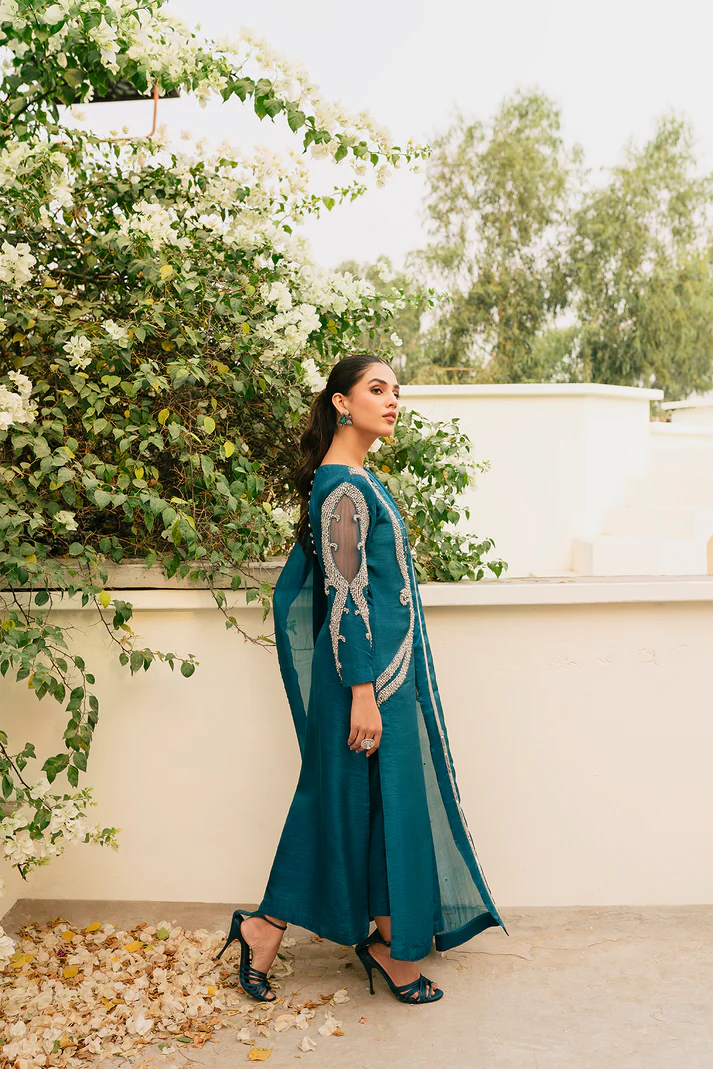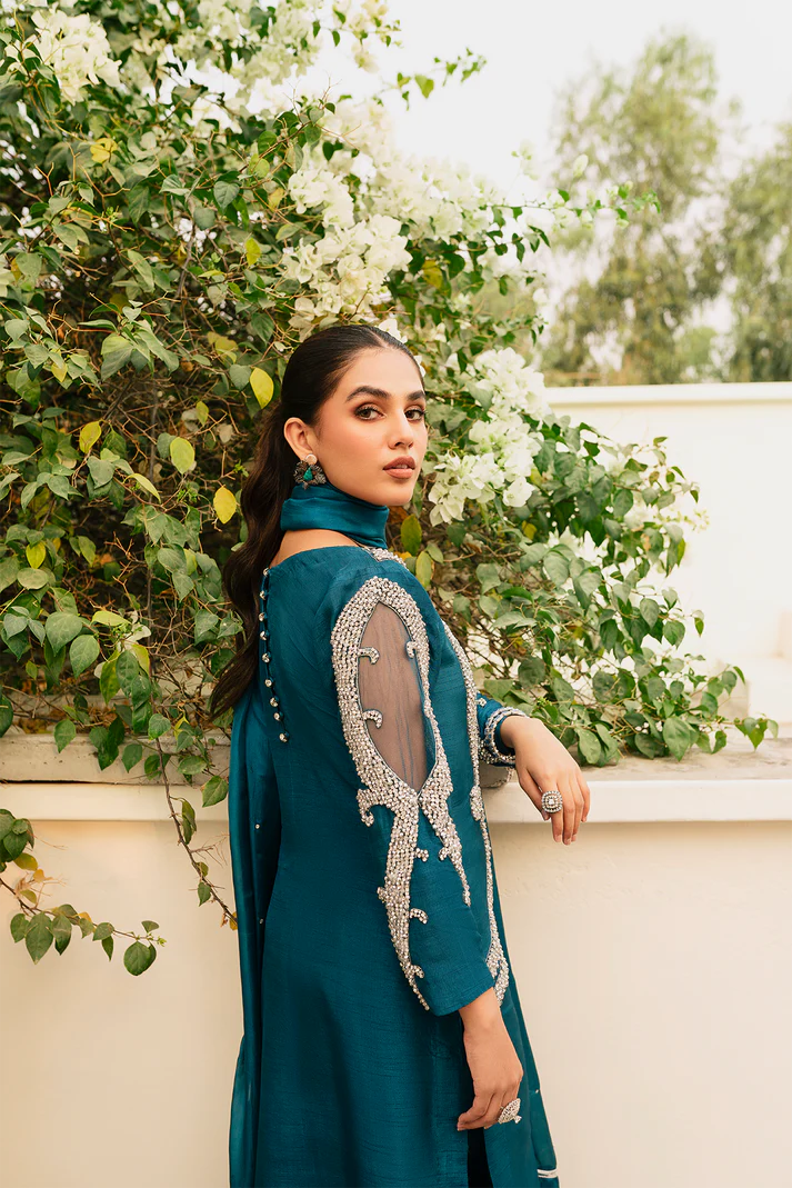 The tranquility of teal is presented in a long raw silk shirt paired with raw silk pants and a silk dupatta. It’s a trendy outfit covered in statements of eye-catching silver-hued rhinestones, crystals, and Moti work.