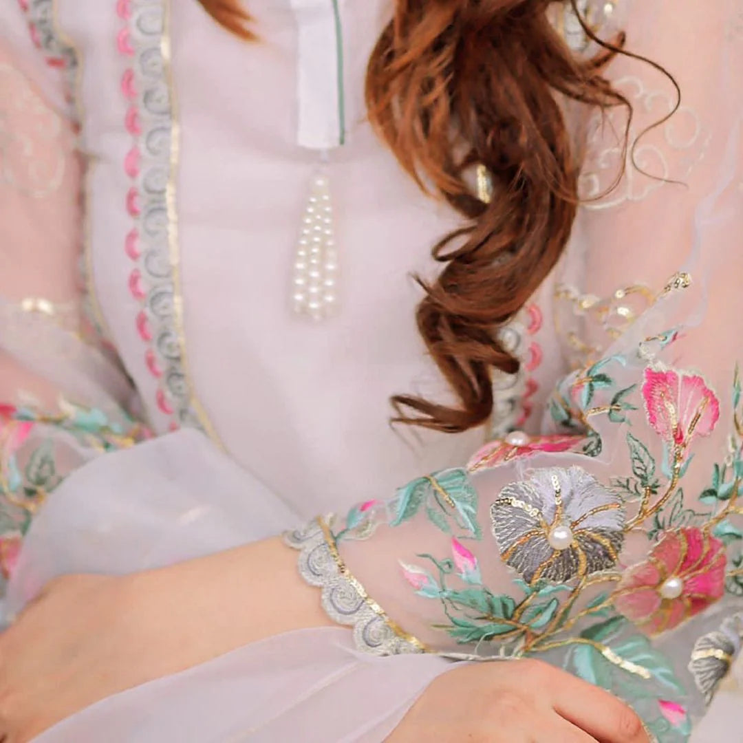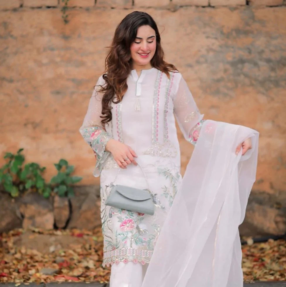 Description: The white organza shirt has beautiful bird and flower embroidery. The neckline is decorated with Pearl tassels and Scalloped Hemline and Sleeves make it more beautiful and elegant. The Gotta on borders and Embroidered Palu Organza Dopatta and paired with Modern Boot-cut draped pants. Look ravishing in our budget-friendly attire! Exquisite designs and high-quality materials at affordable prices