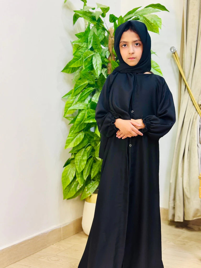 Whether for Eid celebrations or a special occasion, this abaya adds a sophisticated flair to your little one’s modest wardrobe—with just the right touch of whimsy.