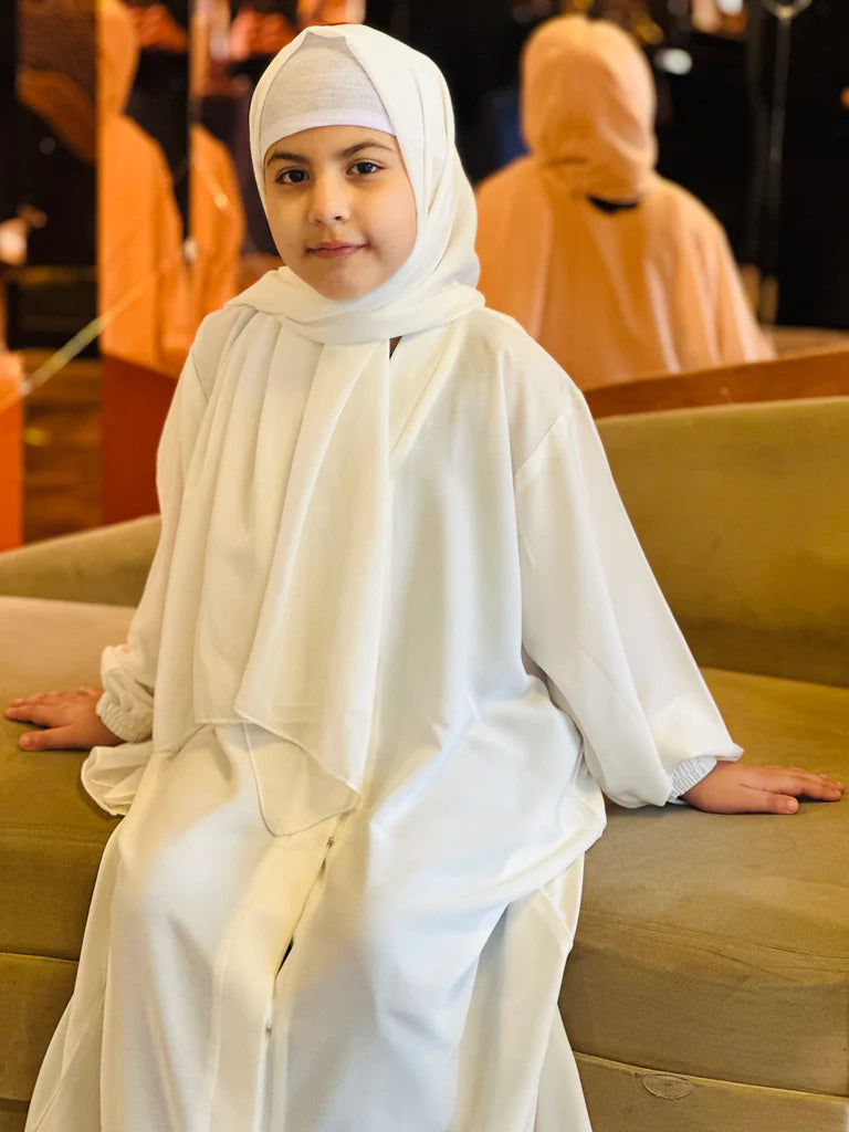 A pristine white abaya designed for timeless elegance, featuring a flowing silhouette and paired with a matching headscarf for a serene, graceful look. Perfect for spiritual gatherings and formal occasions.