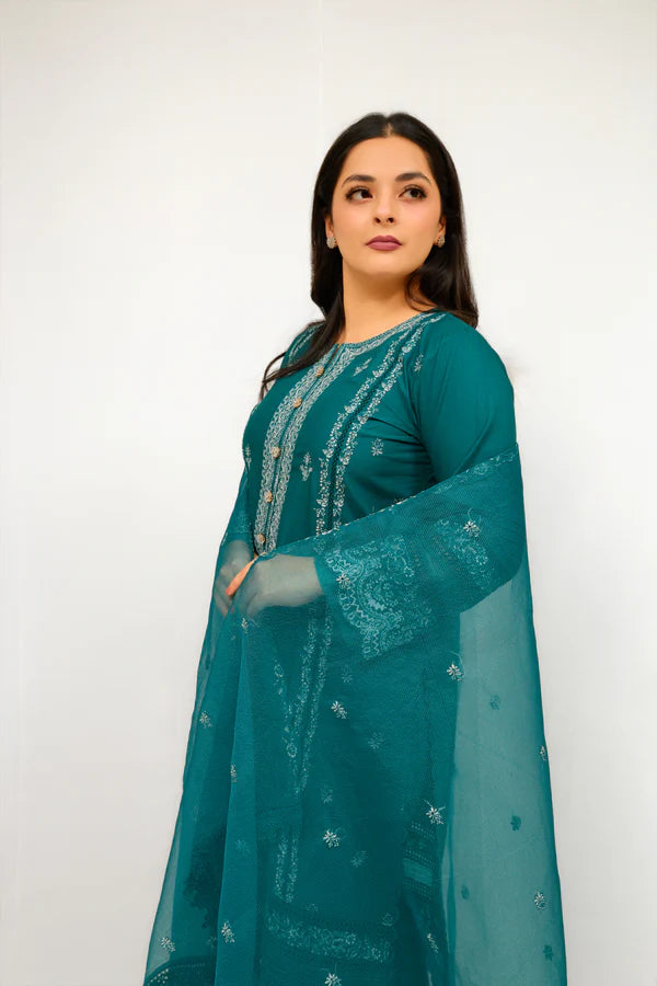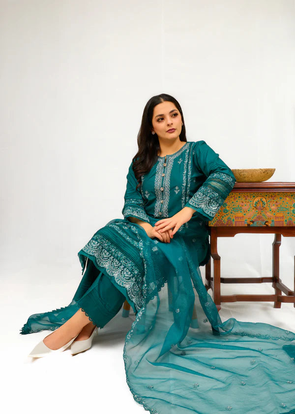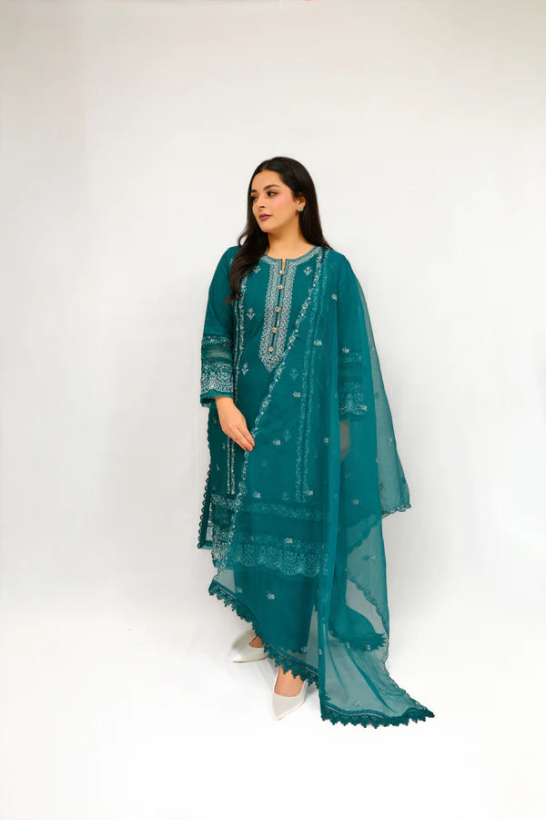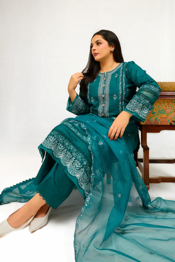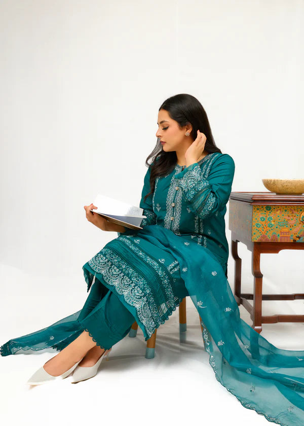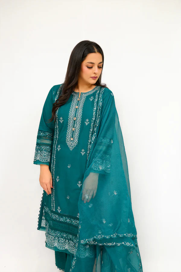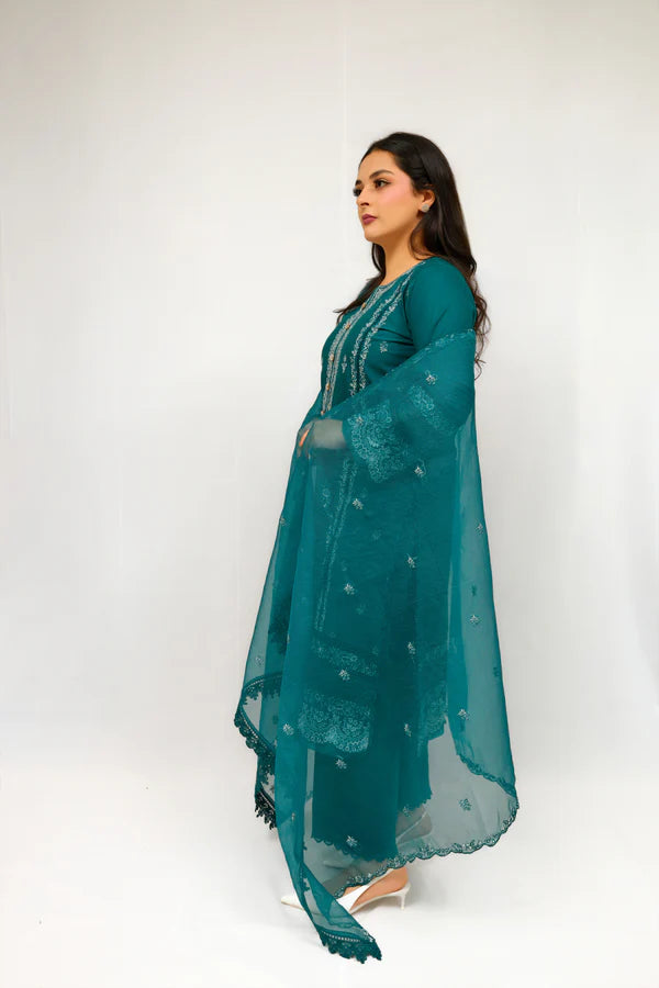 'Livia' is a work of art that emphasises exquisite flower embroidery in a harmonious combination of cream and ivory, with subtle emerald green threads. The piece is beautifully exhibited on a rich, dark emerald green canvas, highlighting delicate and feminine details. This sophisticated style, which radiates a subtle elegance and timeless appeal, is perfect for mid-season daytime events when paired with an embroidered cotton net dupatta.