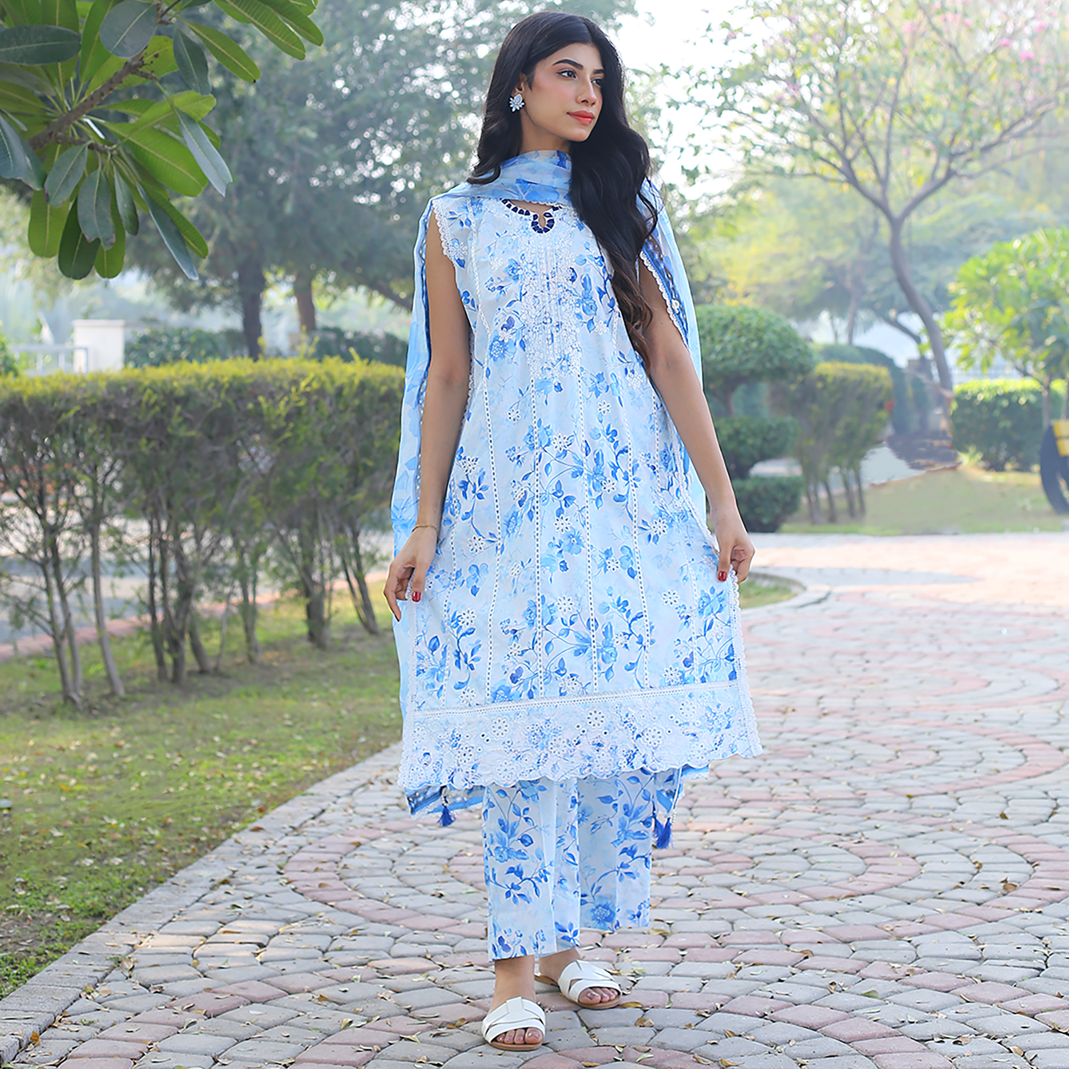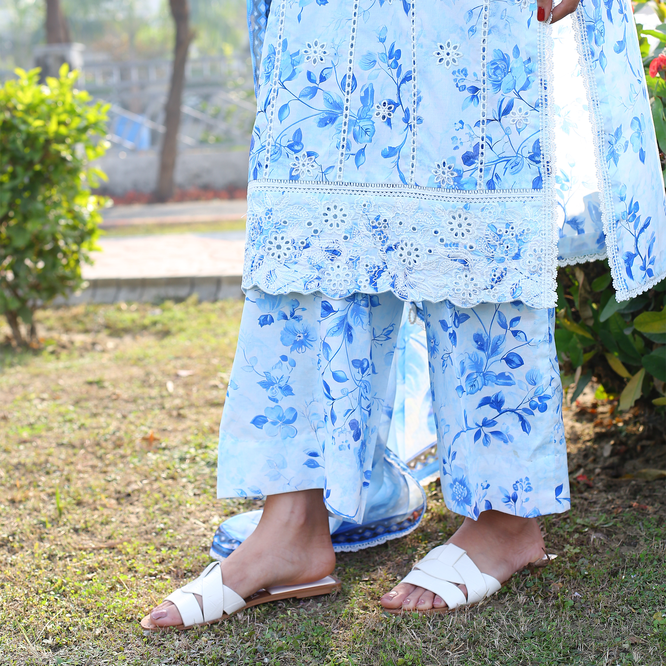Elevate your wardrobe with this serene ice-blue ensemble, showcasing intricate schiffli embroidery and delicate linear details.
