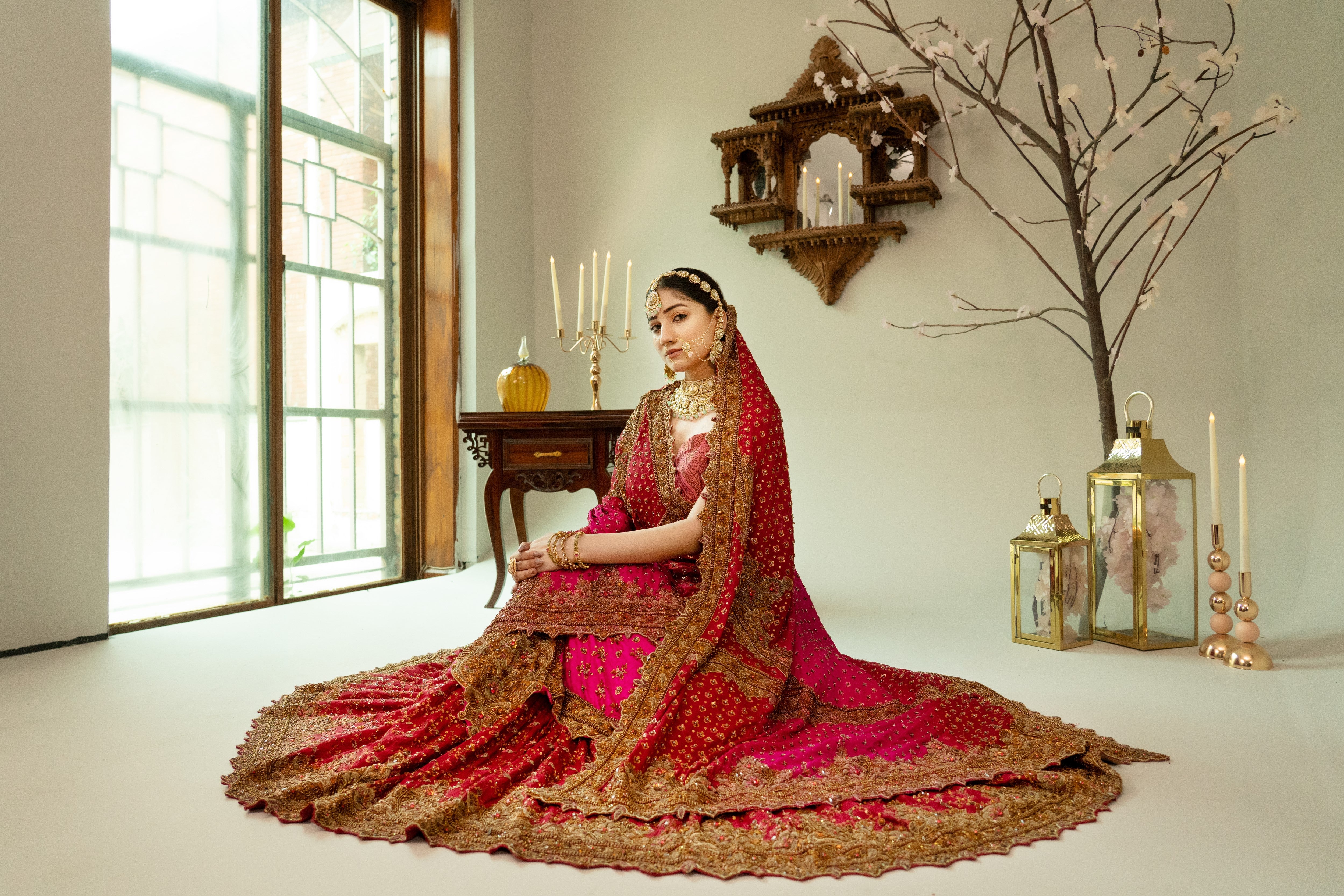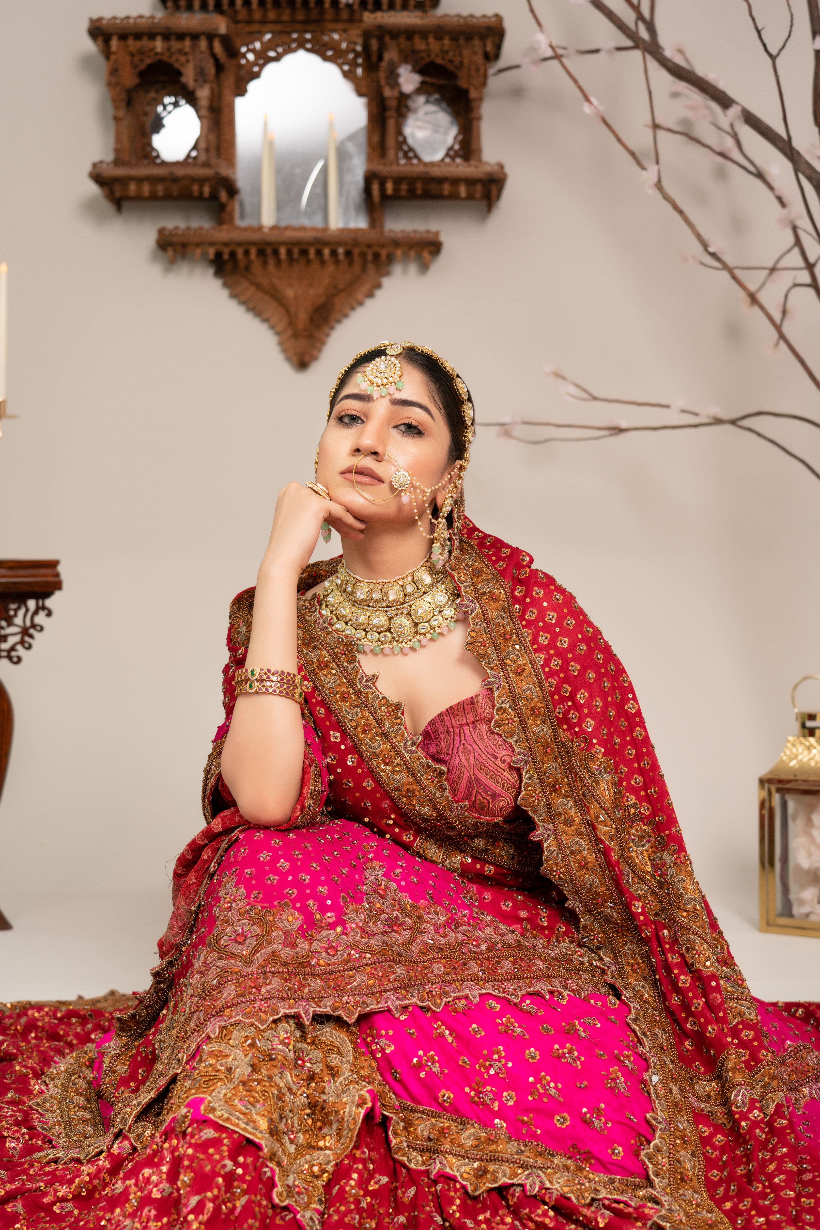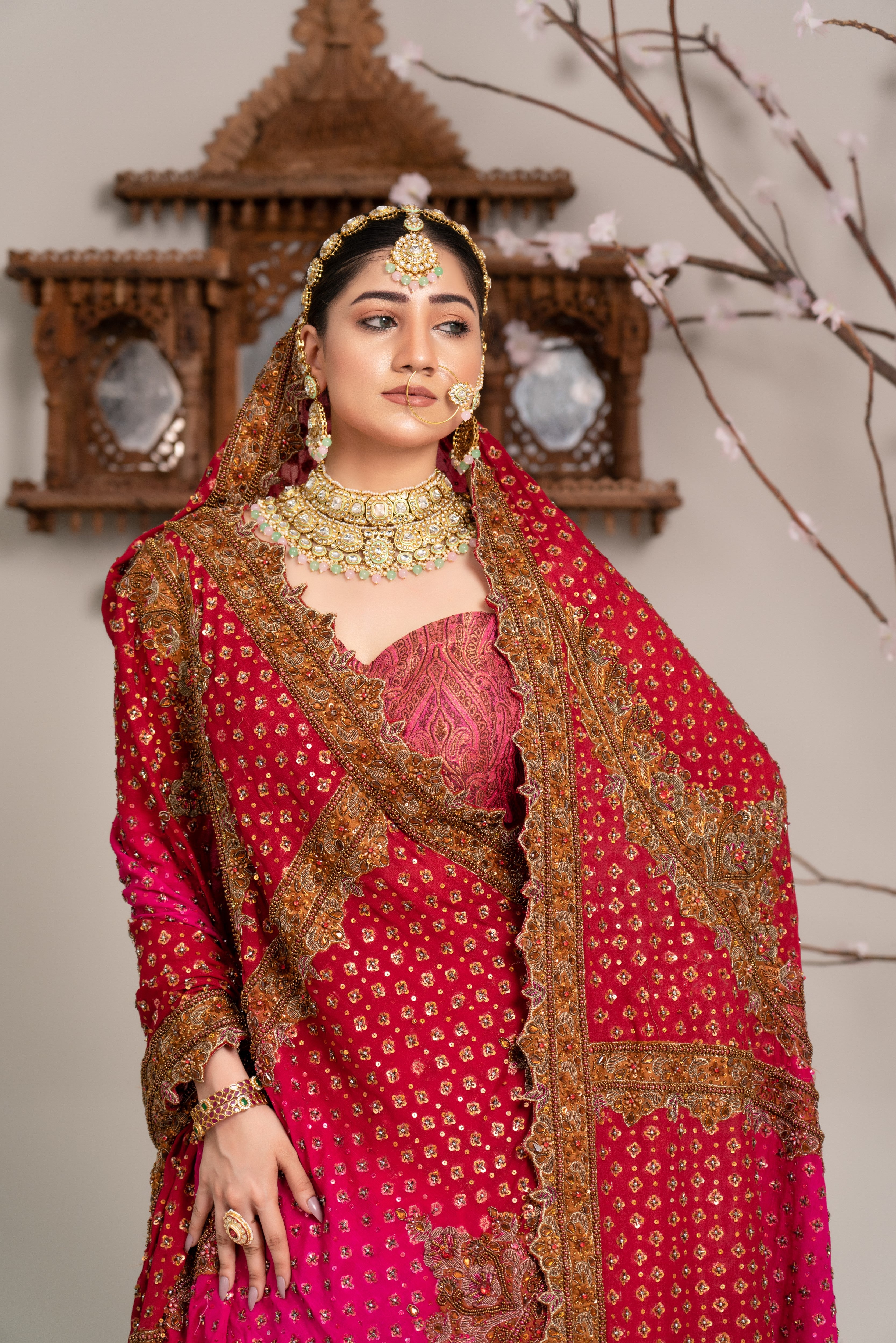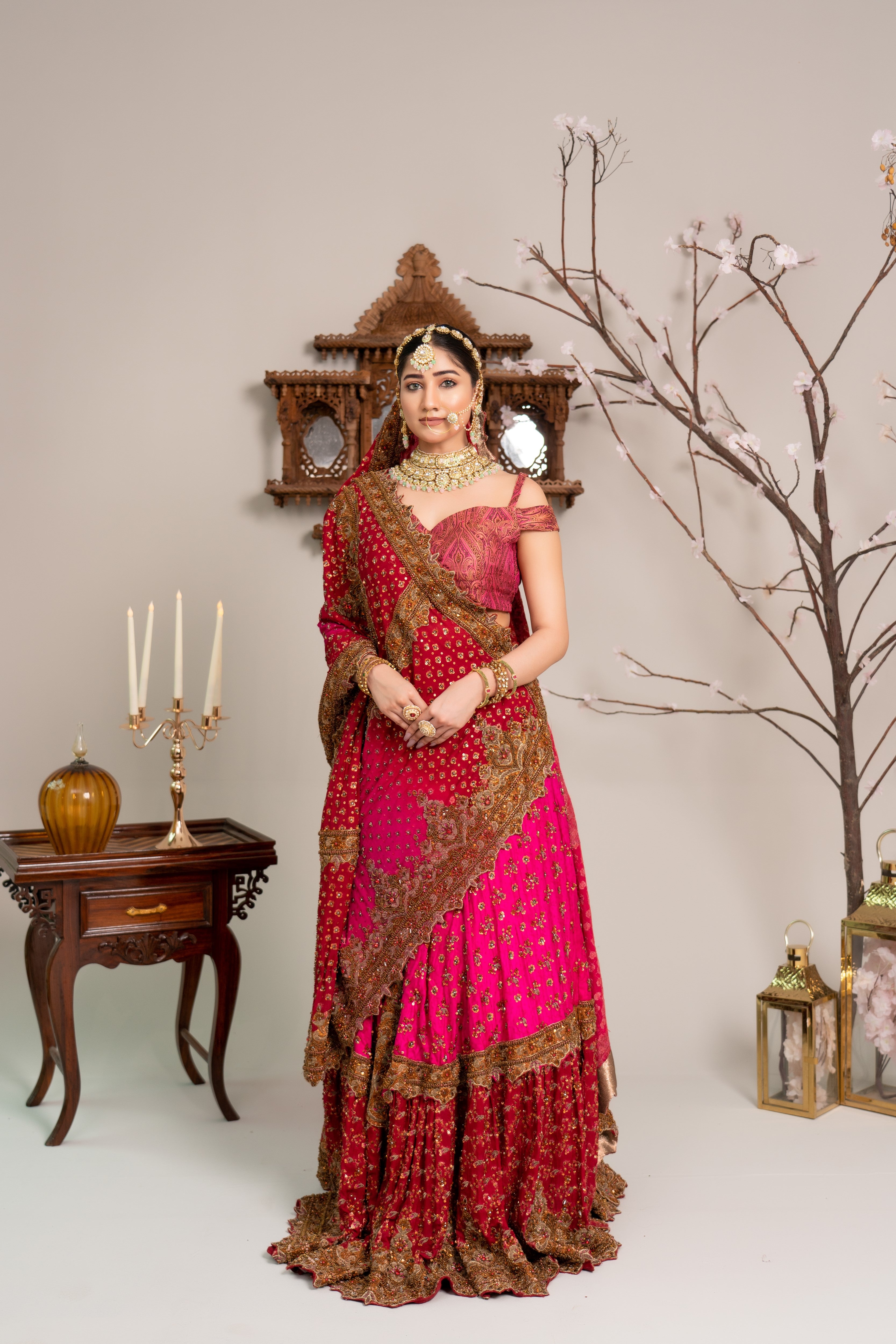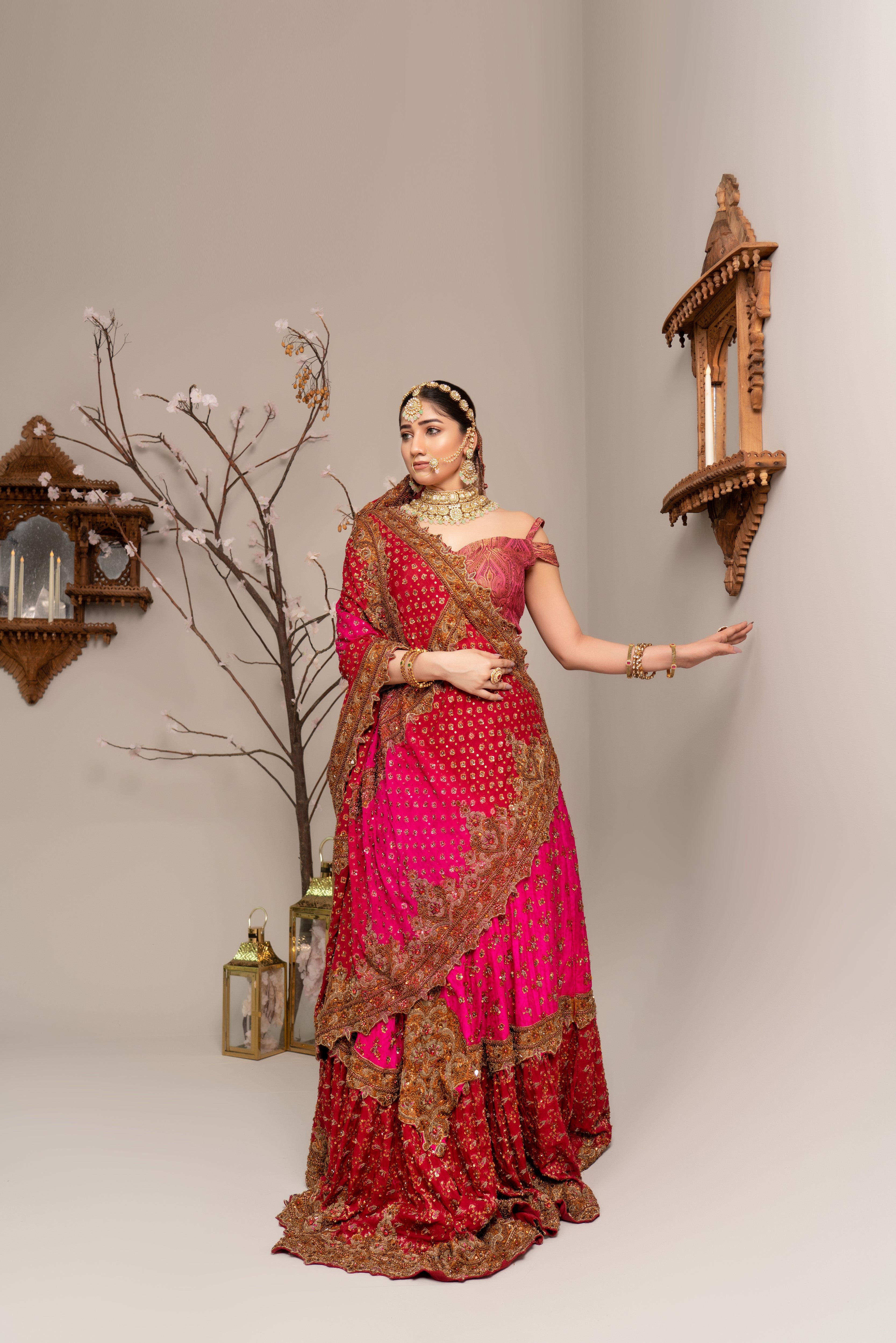 A voluminous layered lehenga with jamawar yolk , paired with a deep pink and maroon heavily embroidered lehenga with a heavy embellished chiffon dupatta. Finished with antique gold zari, dabka, and Mughal-inspired motifs for a regal bridal look.