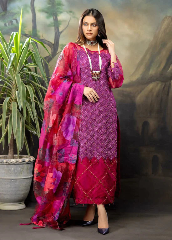 Description: MAGNOLIA outfit with its sleek and modern design adds a touch of elegance.Its design is thoughtfully crafted to enhance your appearance and personality.its an embroidered organza Long shirt,Dopatta is printed brochia organza , pants raw silk. adorned with sequins and beautiful fabric manipulation at ghaira of shirt.