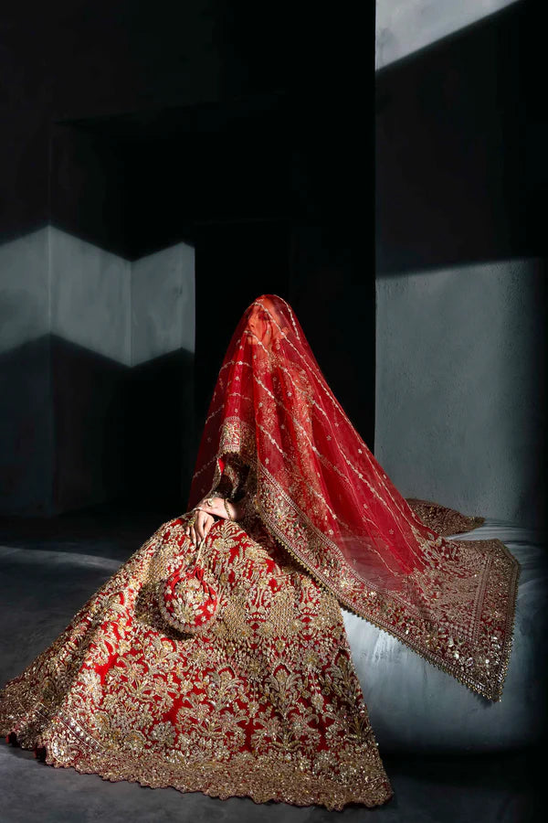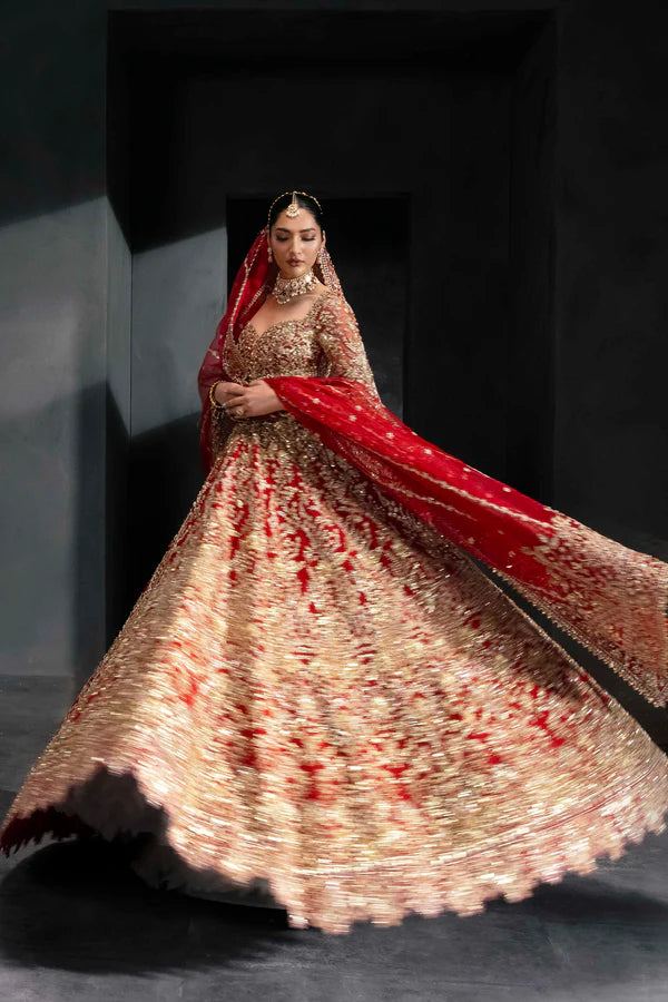 Celebrate tradition in its grandest form with this classic red bridal lehenga by Akbar Aslam. Lavishly adorned with intricate gold embroidery, resham detailing, and hand embellishments, the ensemble features a sculpted sweetheart neckline and full sleeves that balance structure with elegance. The voluminous lehenga showcases ornate floral and paisley motifs, while the heavily embroidered dupatta adds a majestic finish. Paired with a matching handcrafted pouch, this look is designed for the bride who embodies timeless grace and cultural richness on her big day.