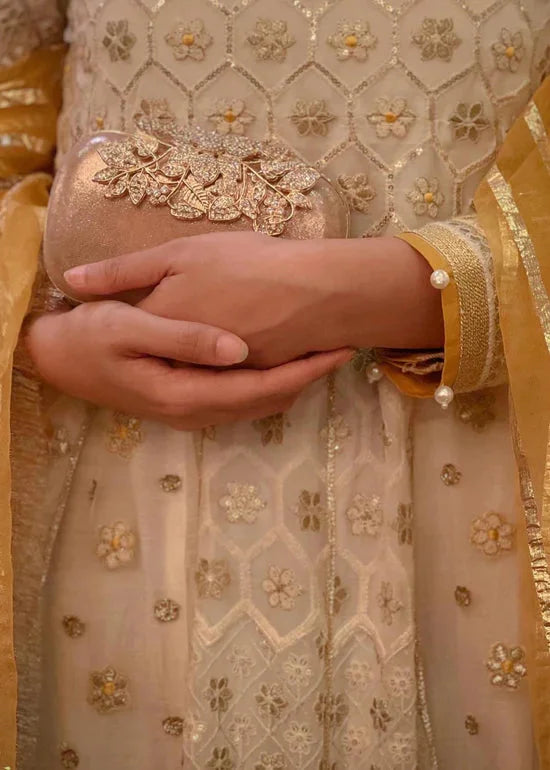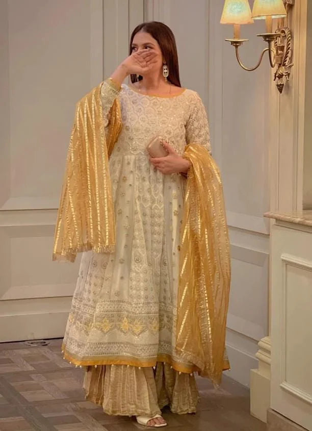 It’s a 3 piece Ready to Wear Peshwas. Embroidered off-white Chikankari organza stitched in a fitted at waist flair Peshwas, it’s embellished with ivory and yellow Reshm threads and golden sequins embroidery and pearl hangings at ghaira and adorned with Gotta stripes at Peshwas panels and yellow silk facings. Paired with lightly crushed atlas golden sharara and yellow organza zari striped dupatta with Kiran on borders,