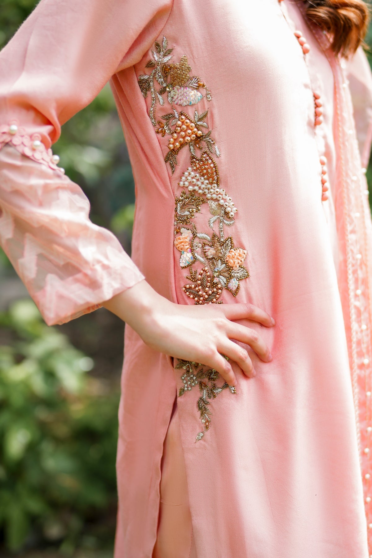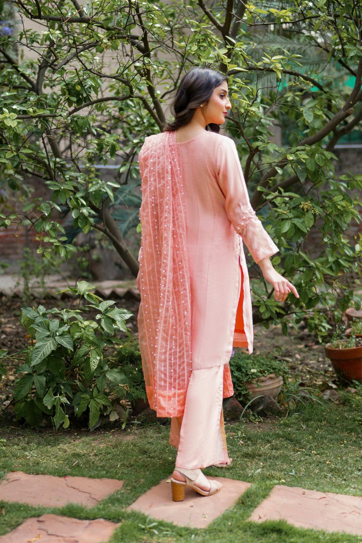 A gorgeous shirt with sleek organza sleeves laced with pearls and floral embroidery on the sides. It is paired with a pair of matching culottes and a sheer dupatta dusted with delicate embellishments.