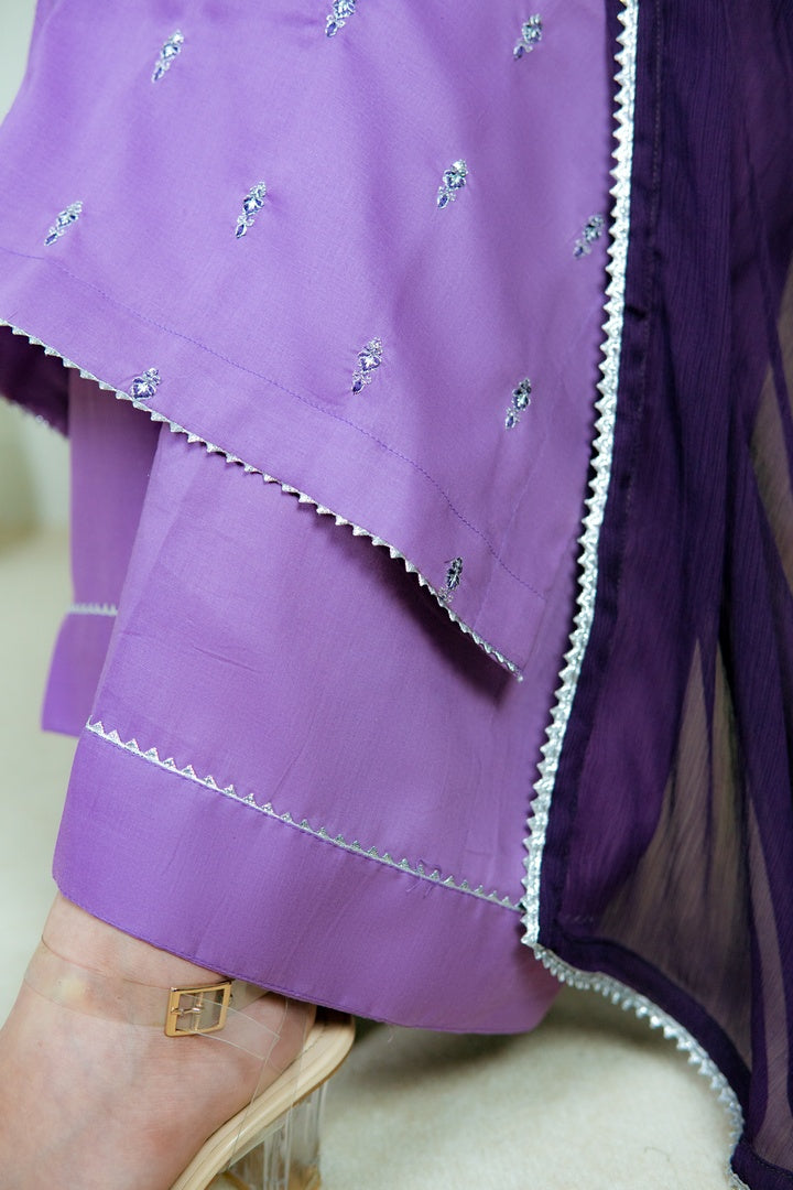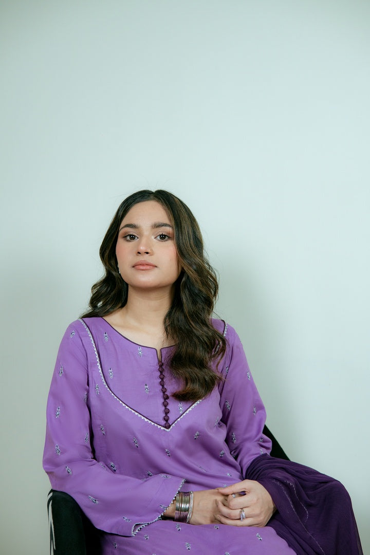 ‘Meras’ is an article in light purple with an overall embroidered long shirt and plazo in cotton fabric. In contrast, we’ve used dark purple and created a unique neck design embellished with buttons and samosa lace. This elegant ensemble is completed with a matching dark purple dupatta.