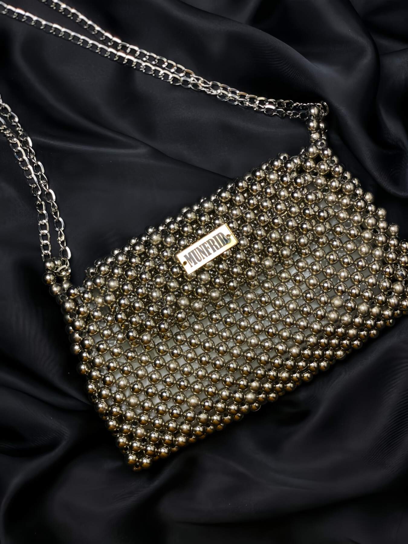 Artisan plastic pearls and metallic chain detailing on a setting Unlined