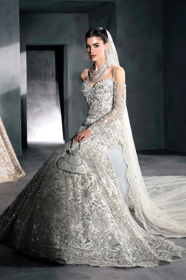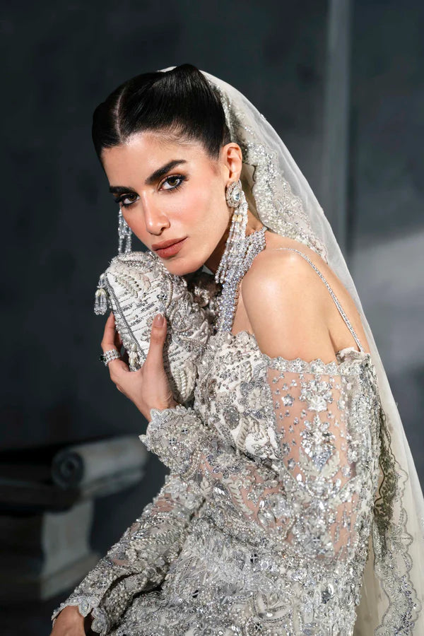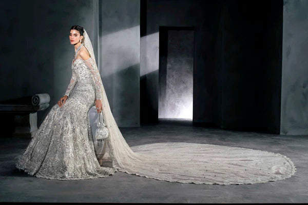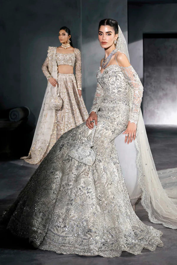 Make a breathtaking entrance in this ice-silver bridal lehenga by Akbar Aslam, where contemporary drama meets traditional artistry. The off-shoulder bodice with delicate straps is intricately hand-embellished with crystals, beads, and silver threadwork that flows seamlessly into a voluminous, fully flared skirt. A sheer net dupatta with ornate borders adds ethereal movement, while the coordinated embellished pouch completes the refined silhouette. Perfect for the bride who seeks a modern fairytale look with timeless bridal elegance.
