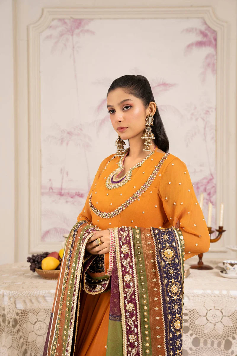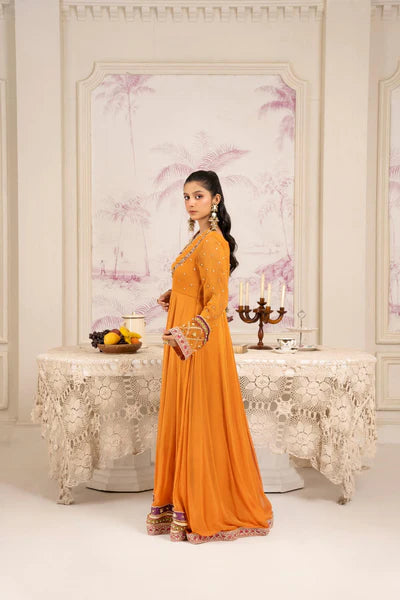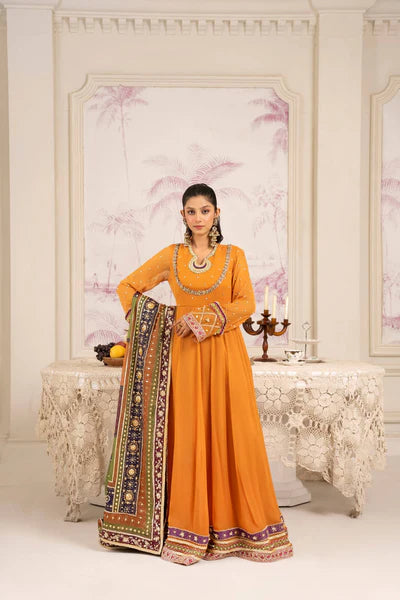 A Timeless Expression Of Craftsmanship, This Mustard Ensemble Features Exquisite Block Printing And Hand Embellishment, Merging Heritage Artistry With Refined Sophistication. The Flowy Silhouette In Sheer Fabric Drapes Beautifully, Adorned With Intricate Motifs And Delicate Gota And Resham Detailing. The Design Is Further Elevated With A Richly Embroidered Border, Accentuating The Traditional Charm While Maintaining A Modern Grace. Perfect For Festive Luncheons, Mehndi Events, Or Intimate Soirées, This Piece Embodies Understated Luxury And Effortless Poise.