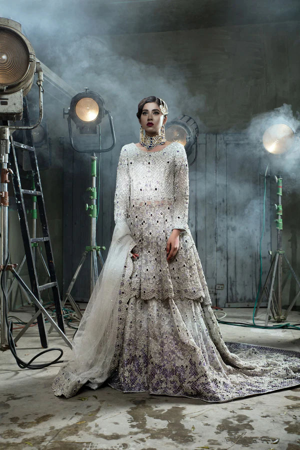The striking silver hand worked bridal attire exemplifies craft, tradition and creativity. The rich art on the pastel silhouette pays homage to the traditional bride. Finely tailored peplum shirt and scalloped-edged dupatta fall in the lap of luxury. Dabka, Swarovski, cutwork and silver hand embroidery express the epitome of bridal elegance.