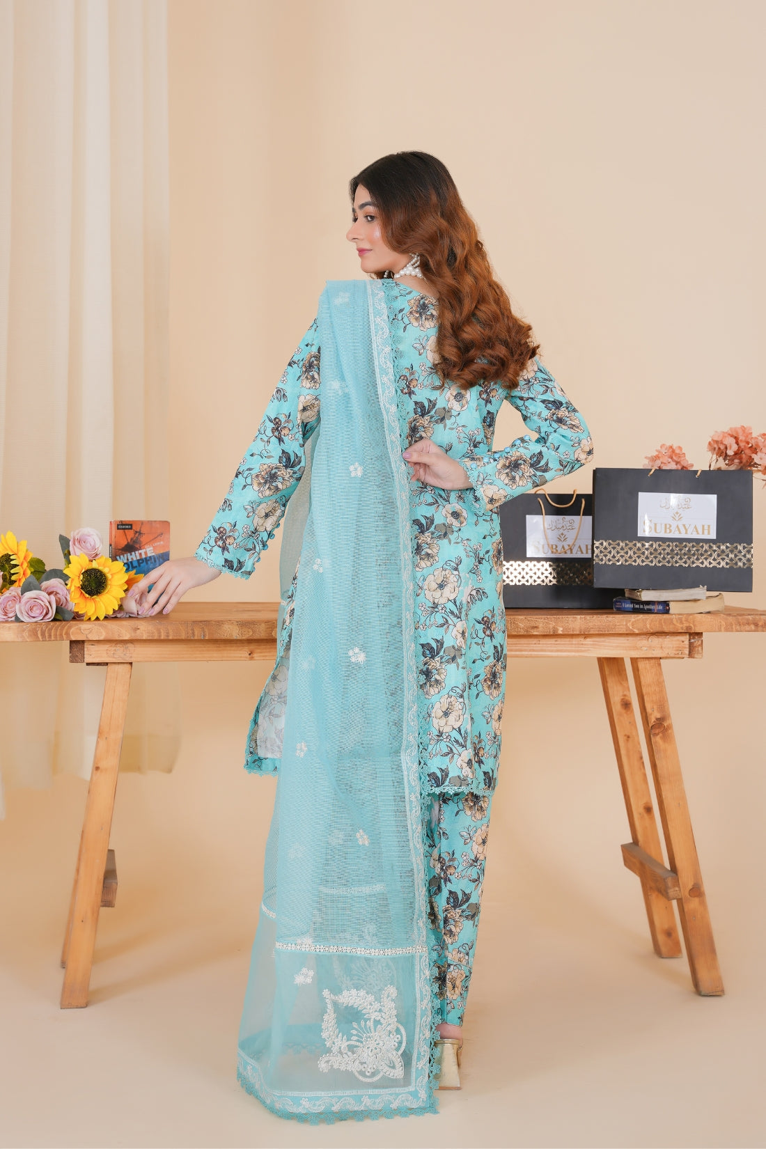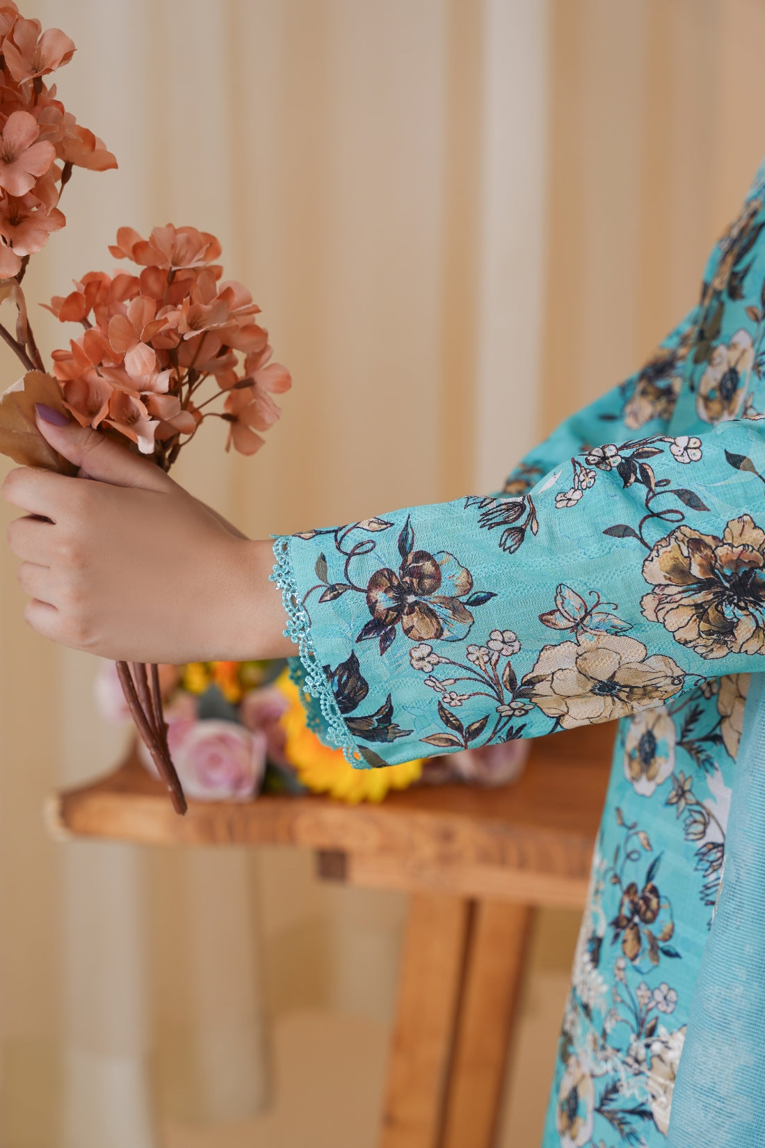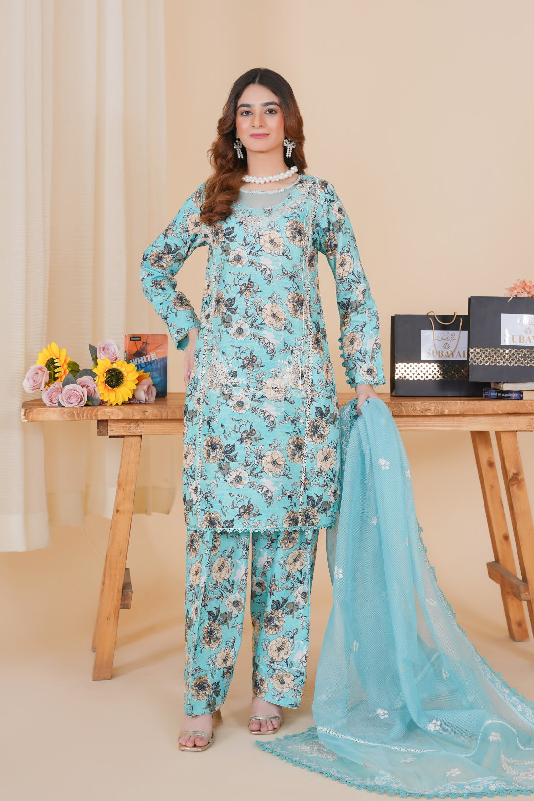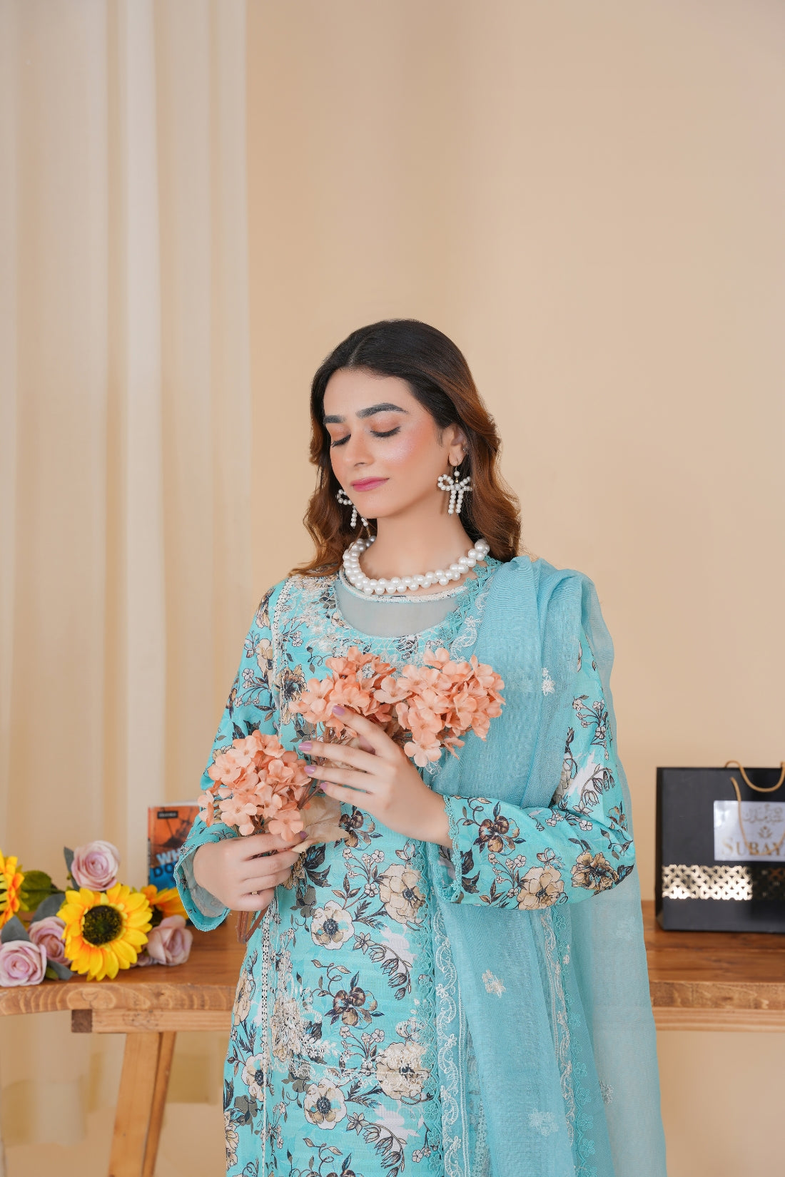 This printed lawn suit is designed with exquisite embroidery and elegant detailing, perfect for a refined look. The ensemble includes: