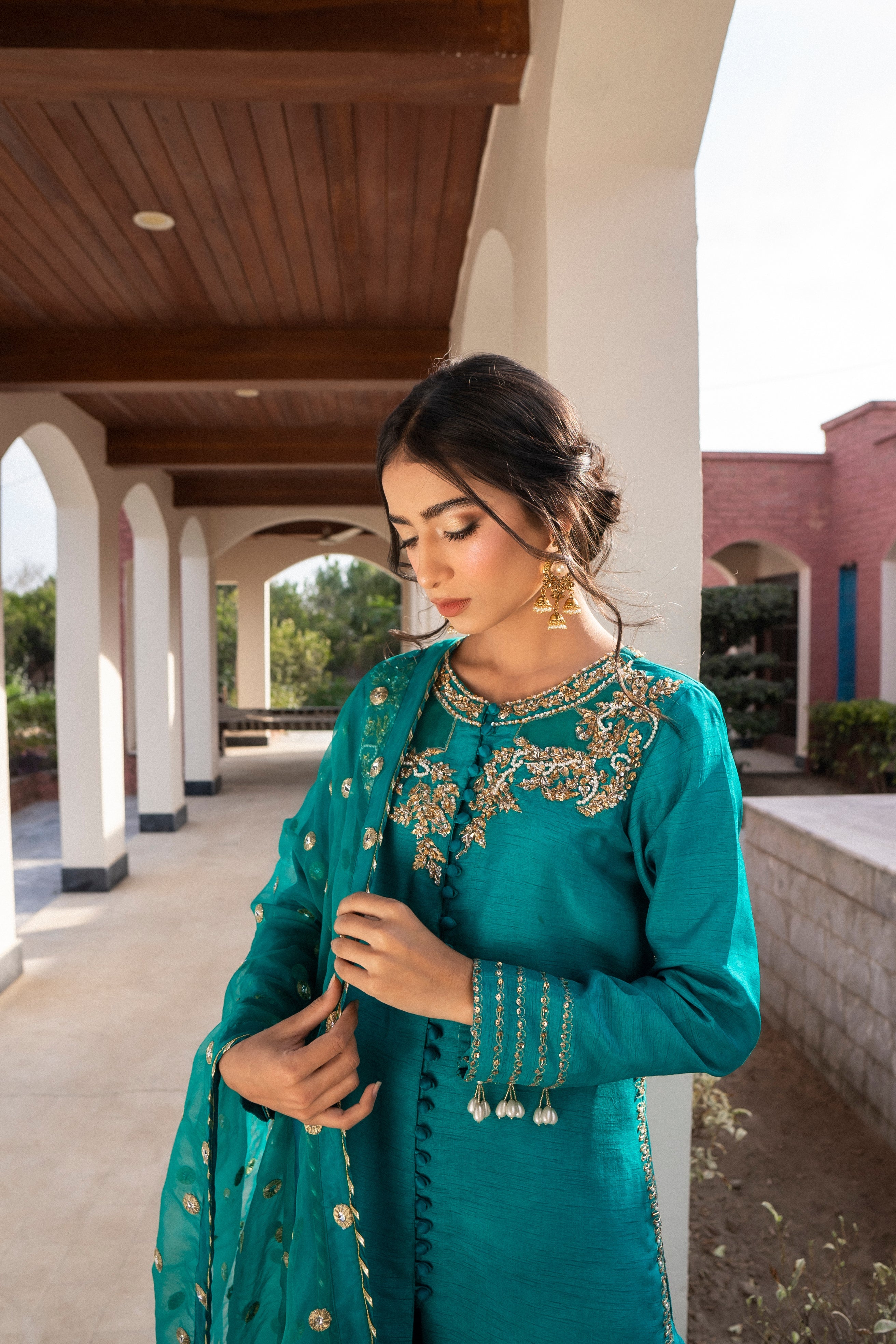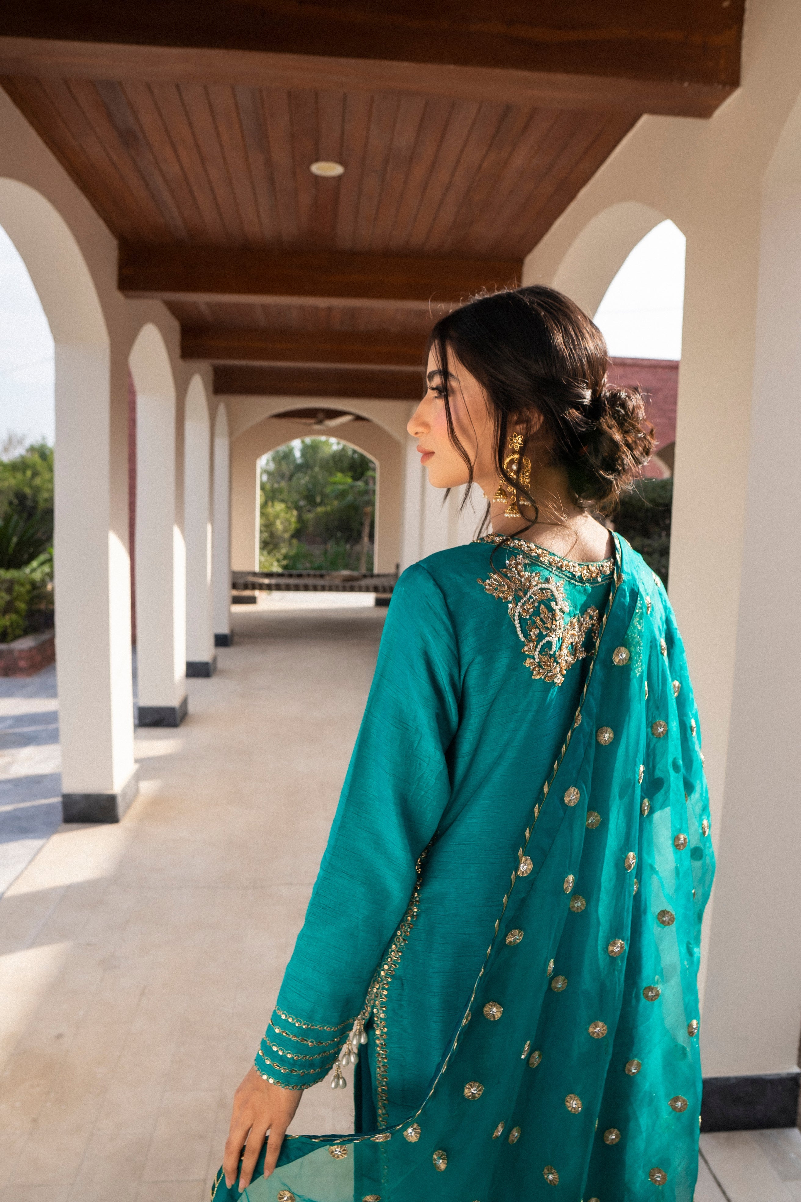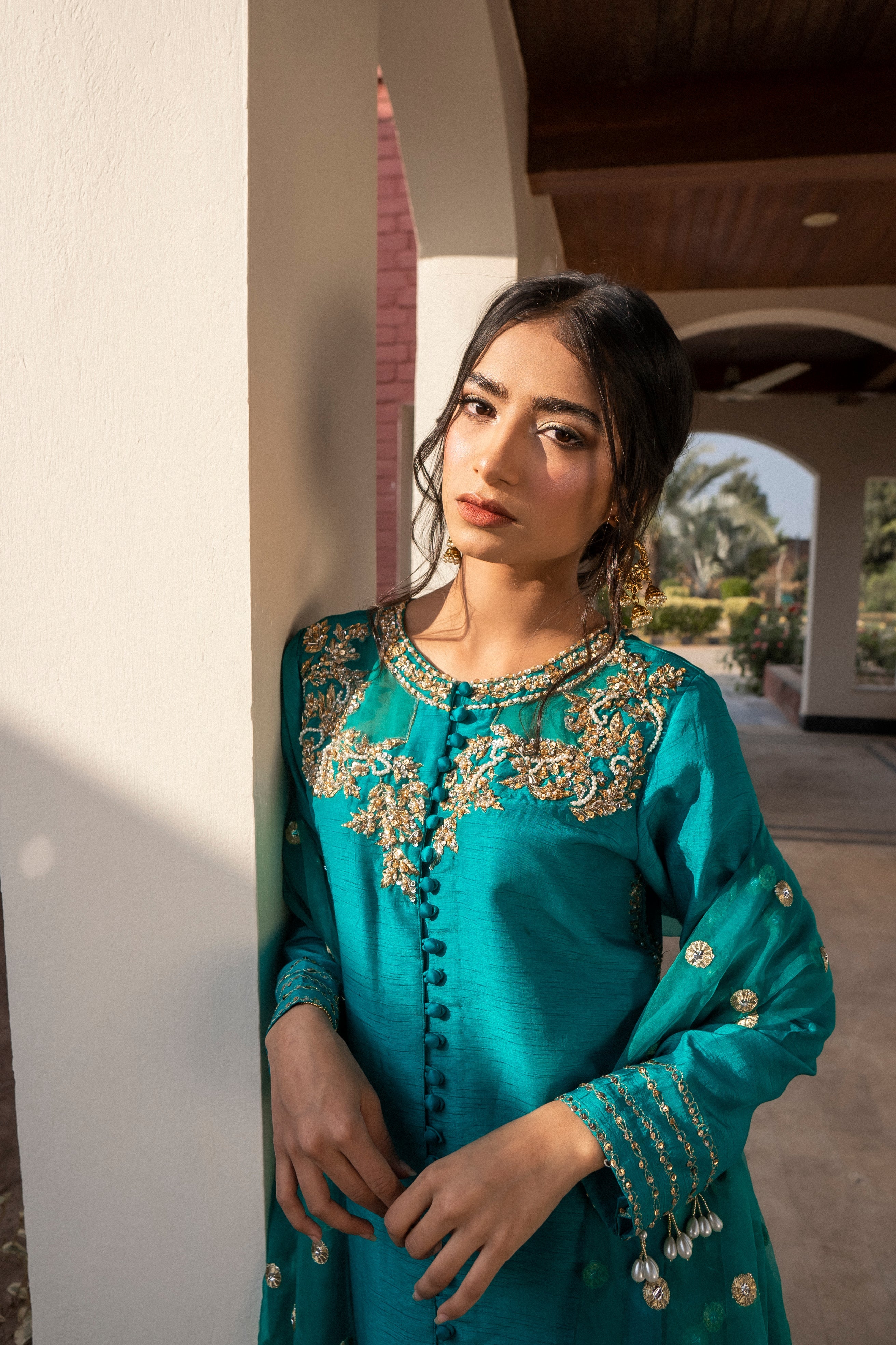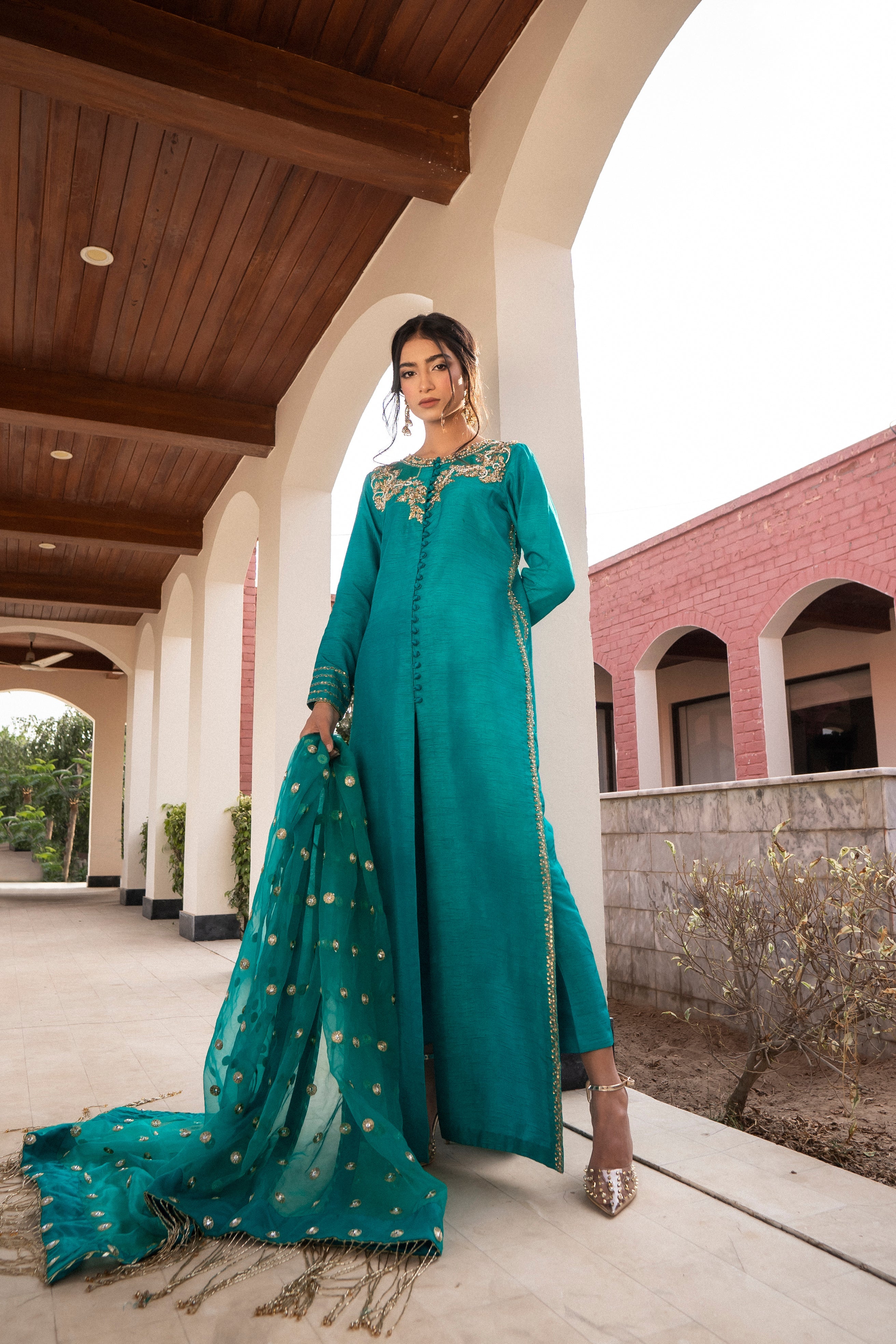 Korean silk traditional shirt with trouser,embalished with golden hand work on the neckline Paird with embroidered orgenza dupatta finished with hangings of small beads.