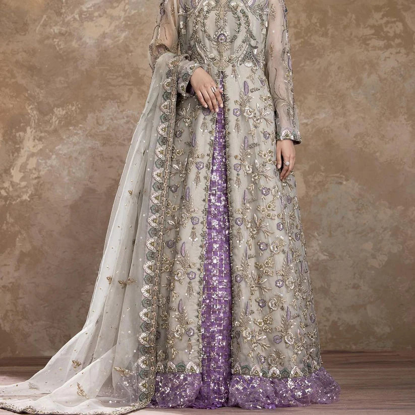 Beautifully designed and contrasted, our bridal attire here is one of its kind with intricate running pattern in antique and move contract of embroidery, paired with a double layered skirt…