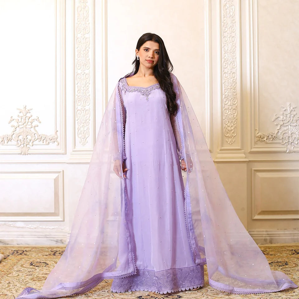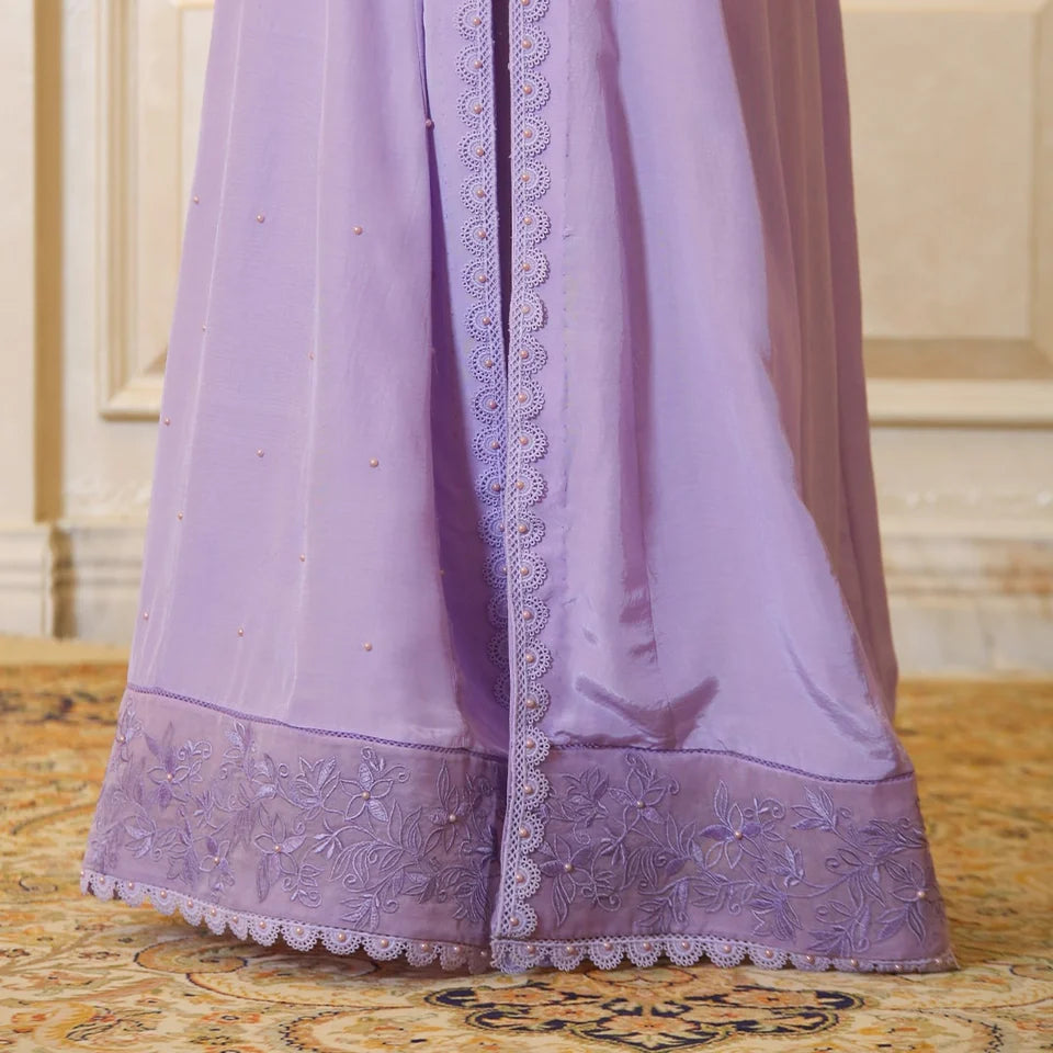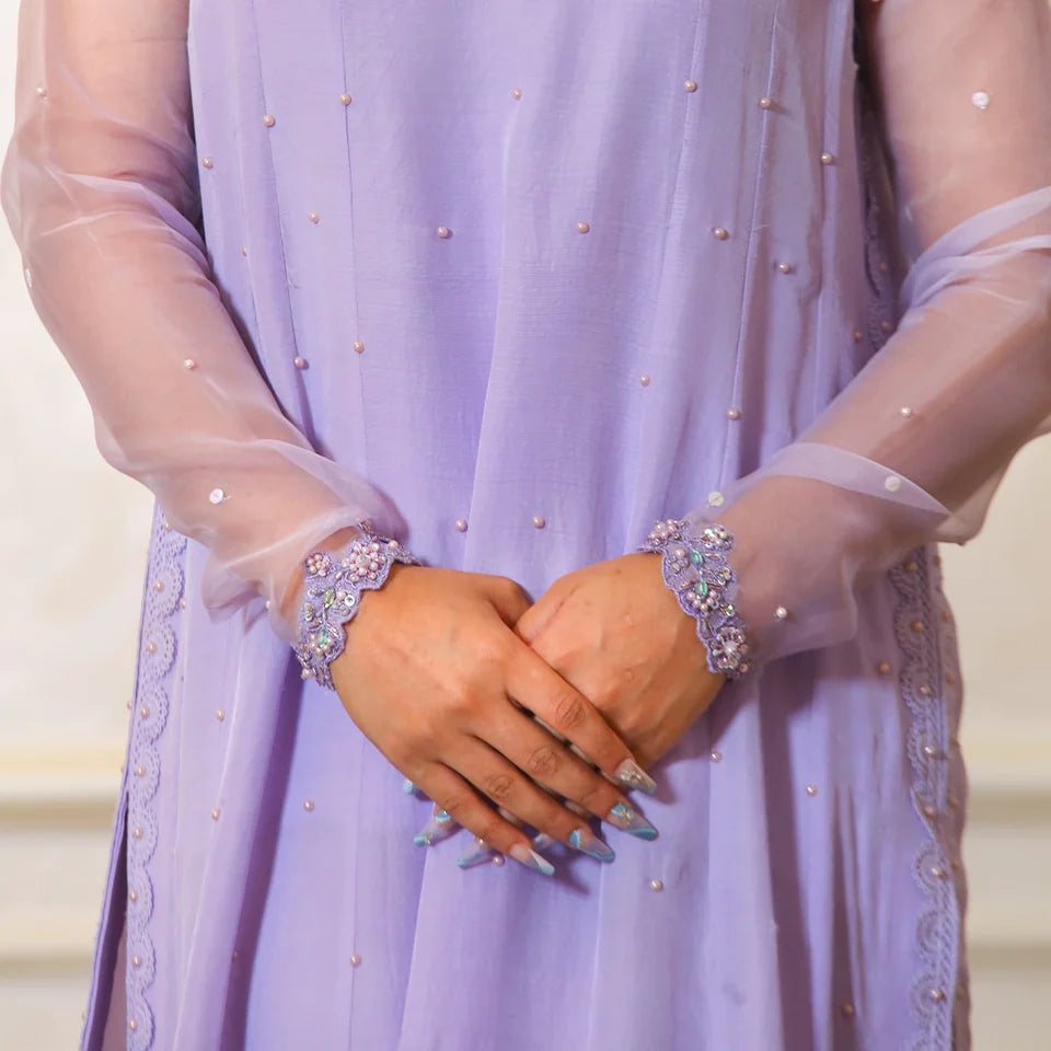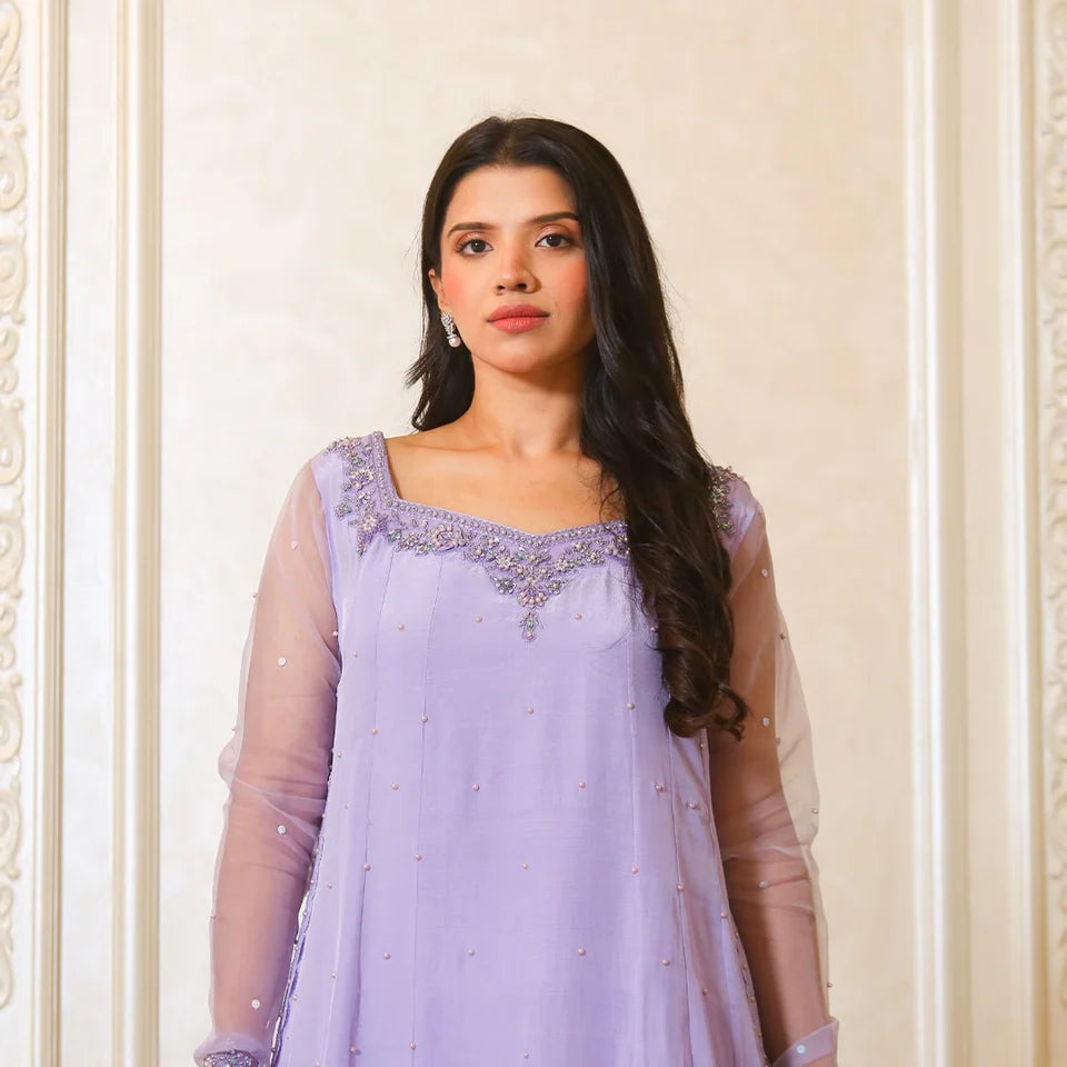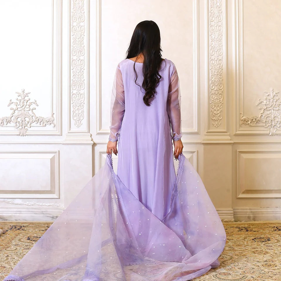 Nooré is as pastel kalidaars in lilac silk features a hand-embroidered floral neckline with silver and pearls, organza sleeves with embellished borders, and an embroidered daaman. The hand-embellished organza dupatta, dyed in soft pastels hues, completes the elegant look.