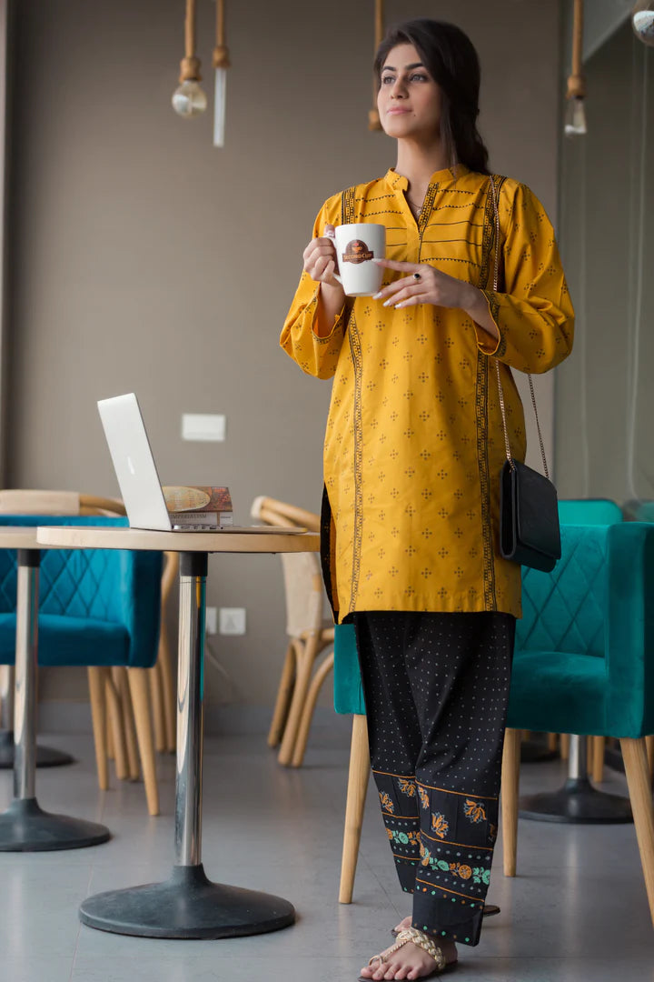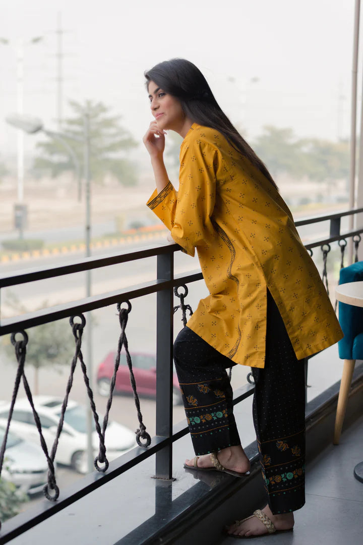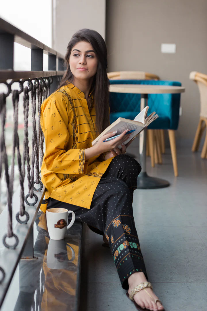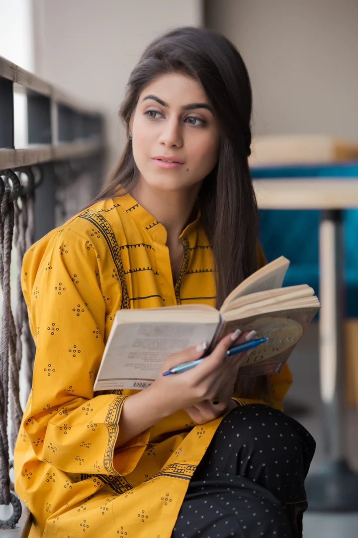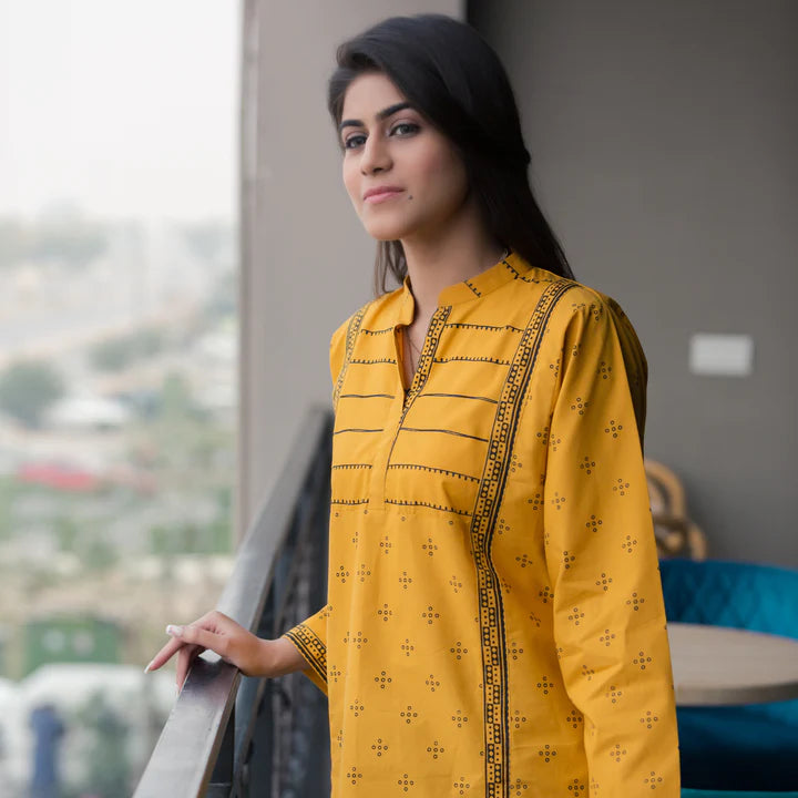 Winters chill is in the air, shine in our new fave chromatic combo of mustard and black giving major statement vibes. It is inspired by the richness of Ajrakh prints and color palette. It represents the magical revival of cultural aesthetics through intricate stitching details with the blend of traditional block print on shalwaar. Add this unique dress to your wardrobe which defines the understated sophistication of simple silhouette…!
