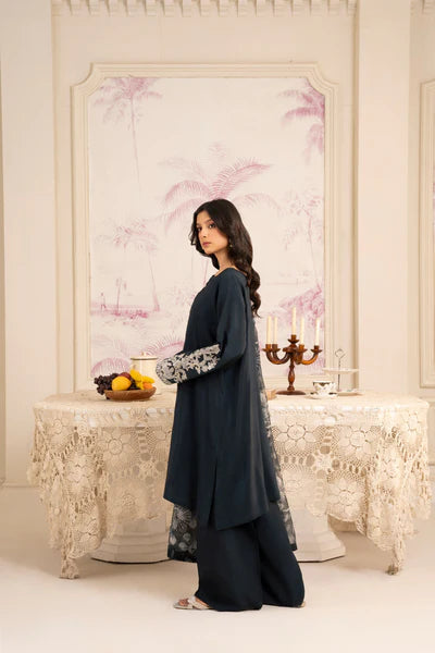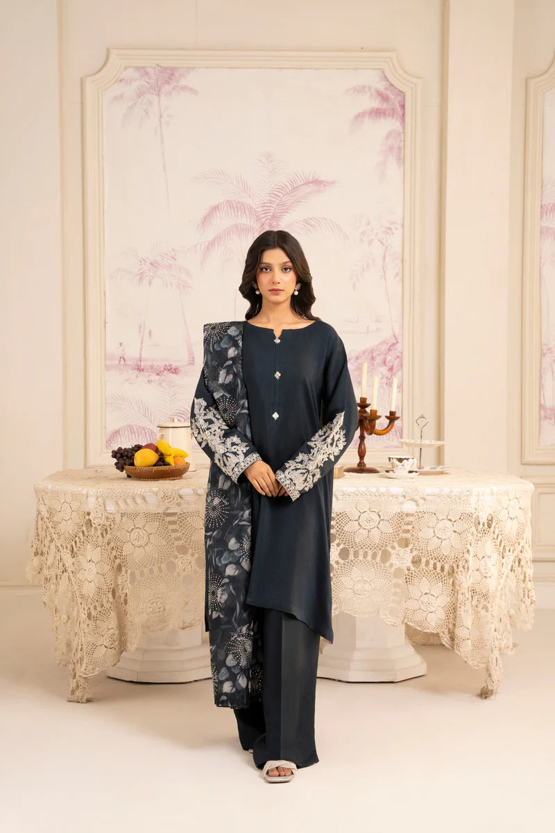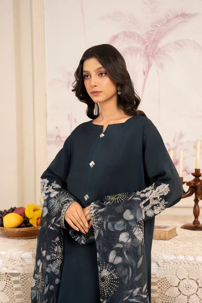 A captivating deep Green outfit that embodies grace with a modern edge. The shirt, crafted from smooth Raw silk, is adorned with refined Embroidery along the sleeves, offering a perfect balance of grace and modernity. Paired with straight Korean silk trousers and a printed organza dupatta enhanced with Swarovski Embellishments, this ensemble is an ideal choice for formal gatherings and elegant evening wear.