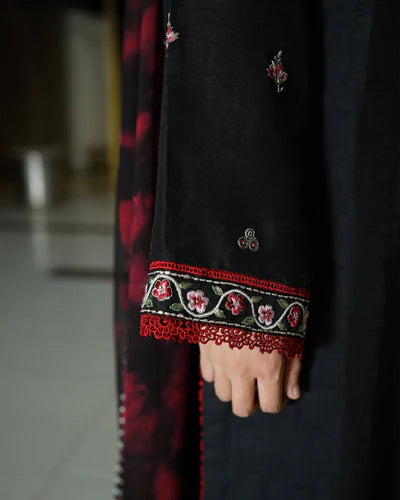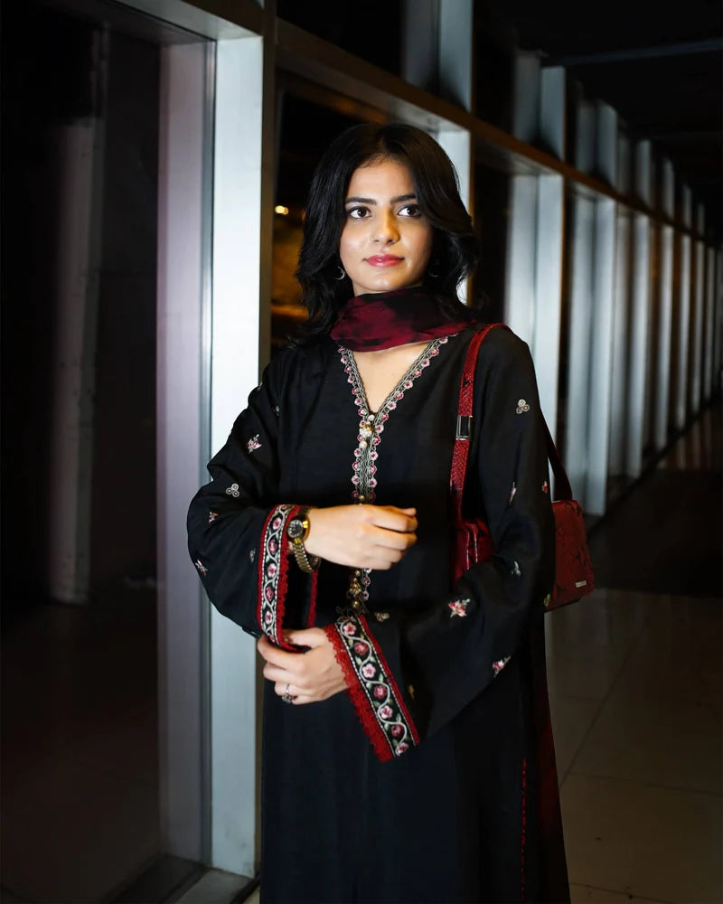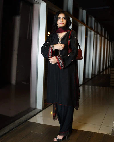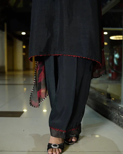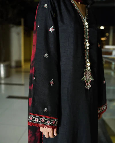 A contemporary black silk shirt with embroidered detailing, paired with classic raw silk trousers. The look is elevated by a chiffon tie-and-dye dupatta in maroon and black, creating a refined yet modern silhouette.