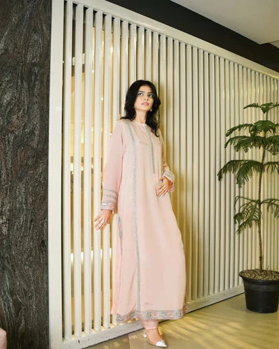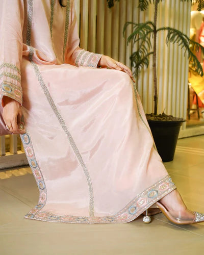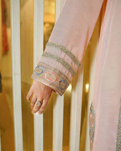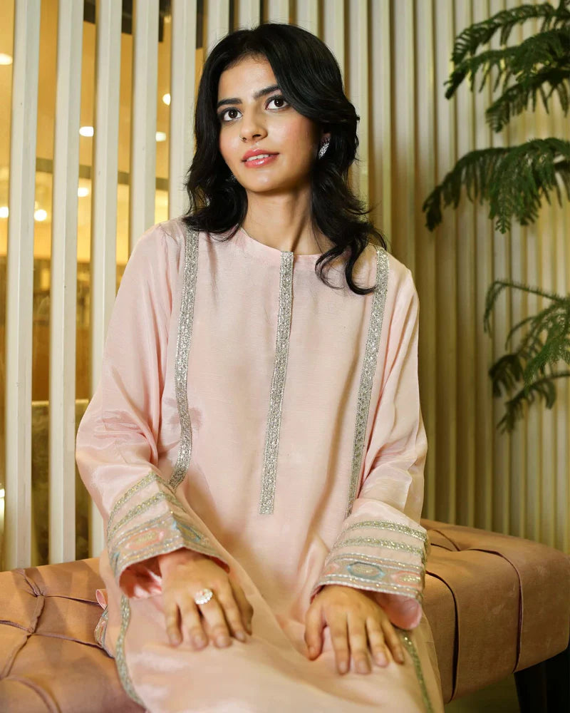 A soft blush pink raw silk outfit adorned with silver embroidered lines and a multicolored hem border. Paired with dyed raw silk trousers, it offers a graceful look for both day gatherings and evening occasions.