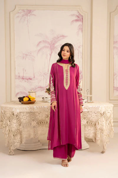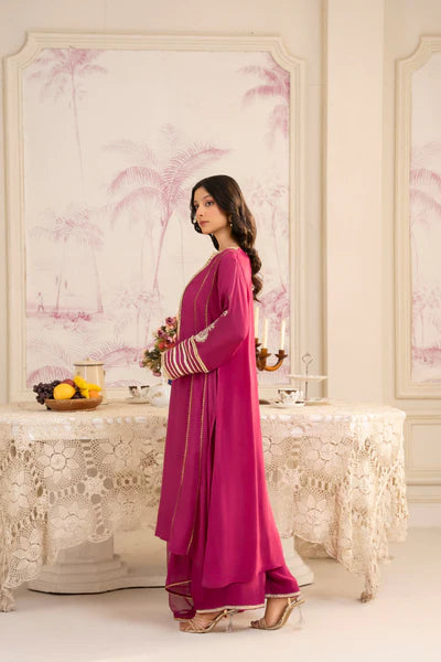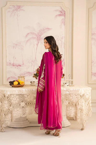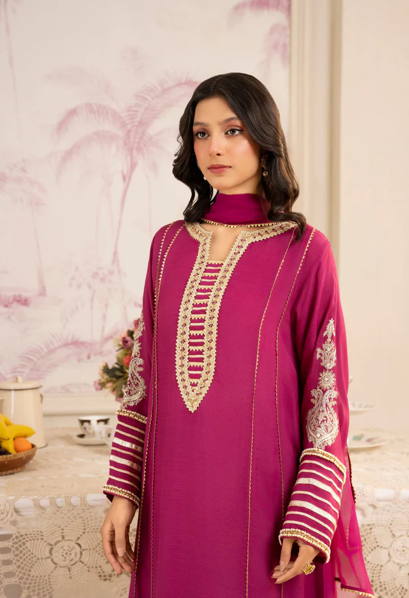 This striking fuchsia outfit is a celebration of bold elegance. The intricately embroidered raw silk shirt is paired with dyed raw silk trousers for a refined finish. The chiffon dupatta, adorned with delicate lace detailing, adds fluid grace to the look. A perfect pick for festive evenings or semi-formal gatherings.
