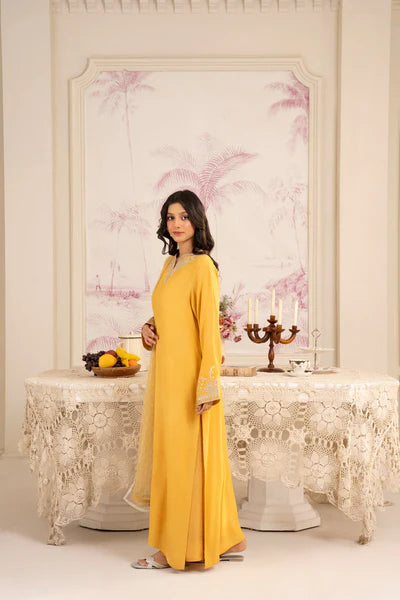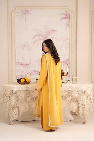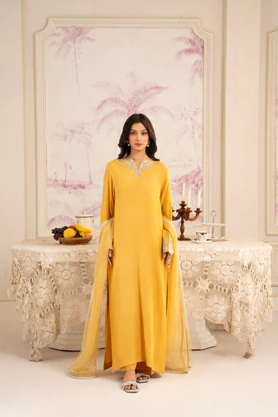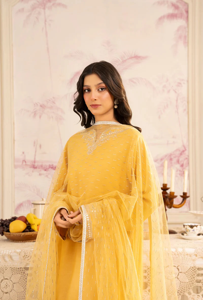 Radiate warmth and elegance in this ensemble that embodies sunshine and grace. The raw silk shirt features delicate embroidery, complemented by matching trousers. The Swarovski-embellished net dupatta elevates the outfit, making it a graceful choice for daytime festivities or evening soirées.