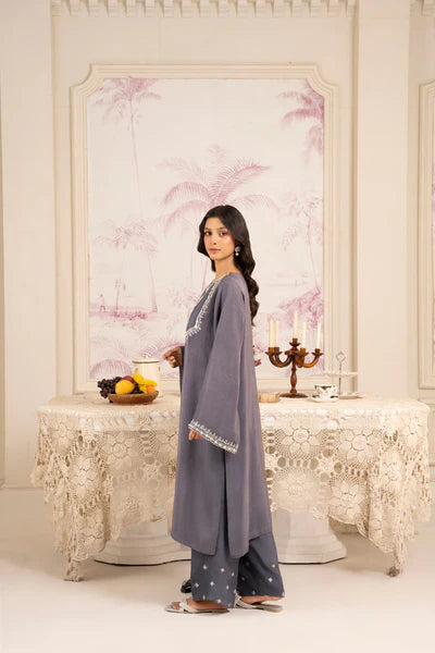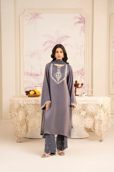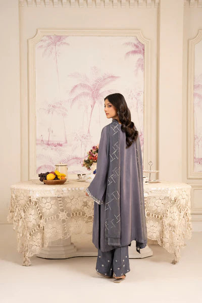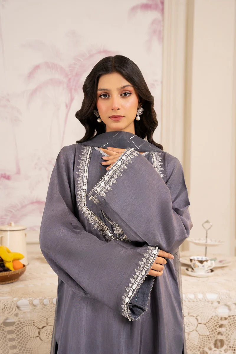 A slate-grey outfit inspired by the serenity of moonlight. The Hand Embellished and Embroidered raw silk shirt is adorned with intricate silver threadwork, paired with matching Embroidered trousers. The Swarovski-Embellished Net dupatta adds a regal shimmer, perfect for formal evenings and celebratory dinners.