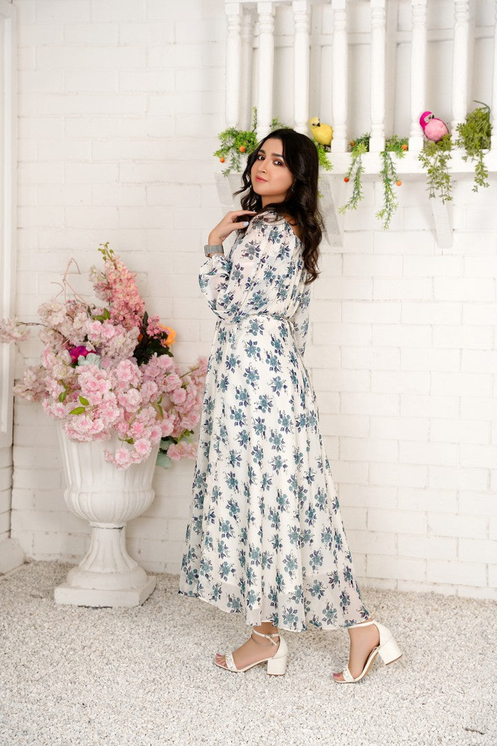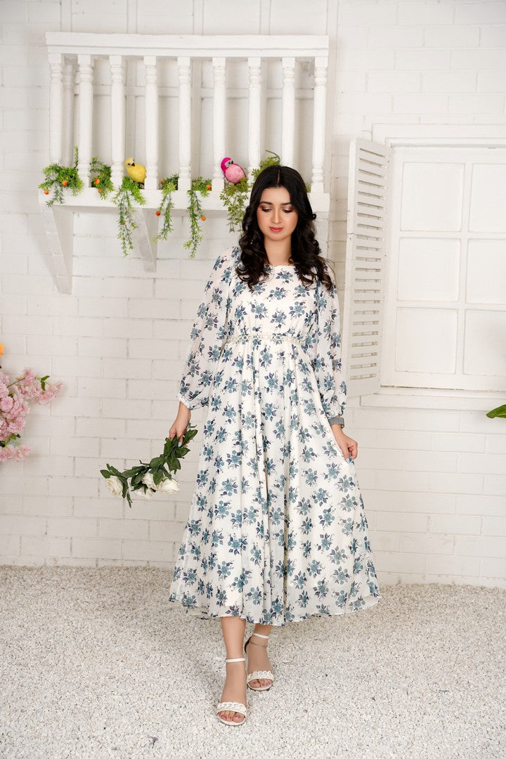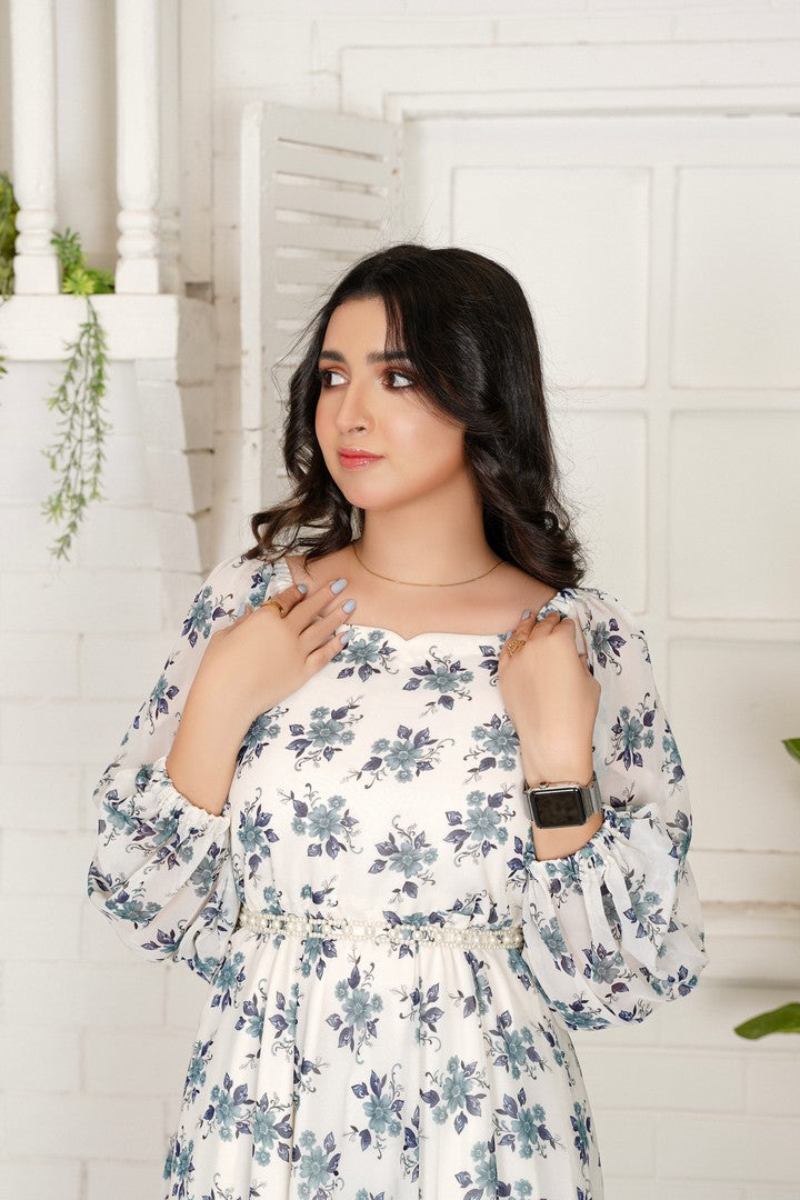 A mesmerizing frock featuring an off-white colored base adorned with lively flowers. The handcrafted belt, embellished with exquisite white pearls, adds a touch of elegance to this enchanting ensemble. Share the beauty of “Petal Grace” with the world