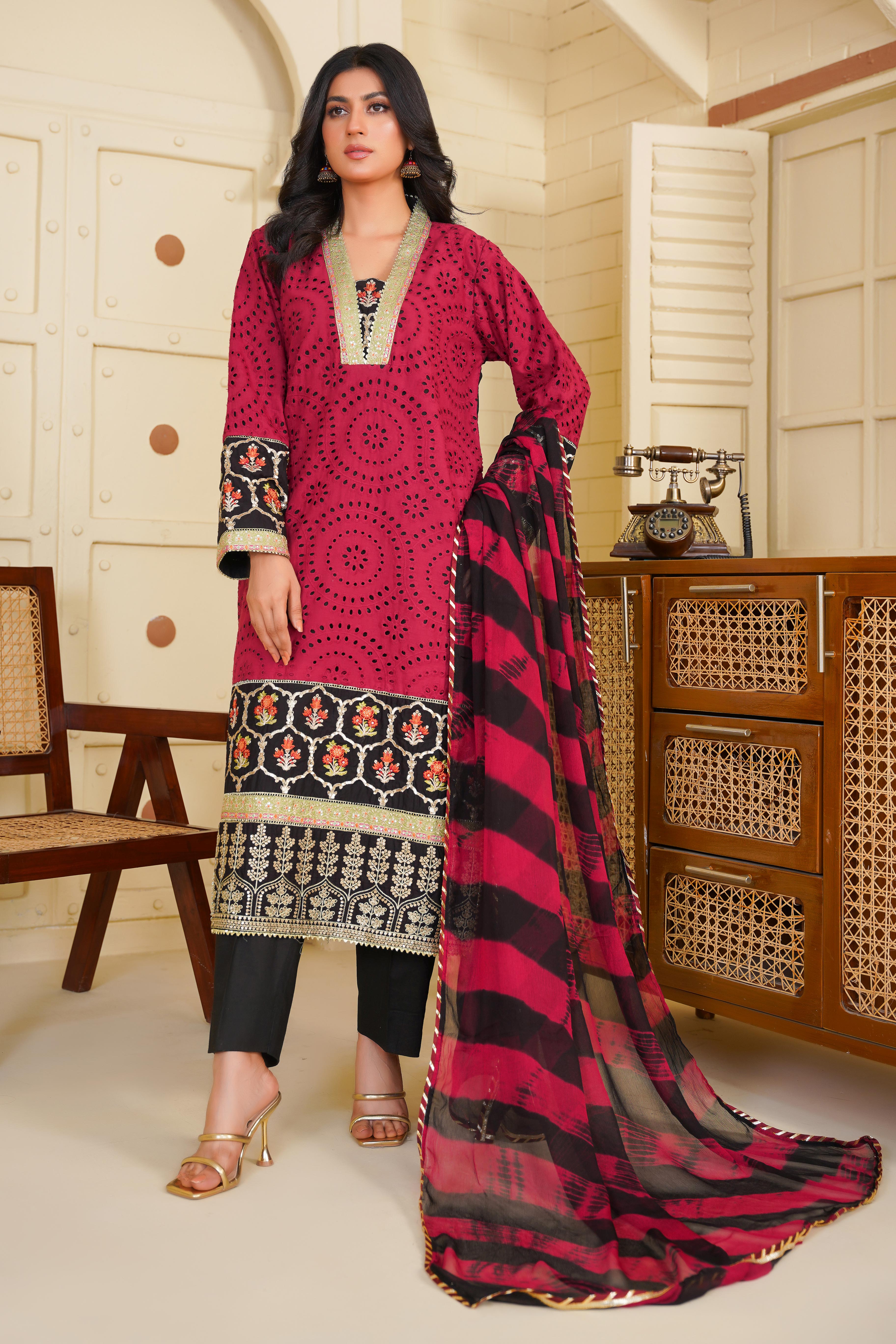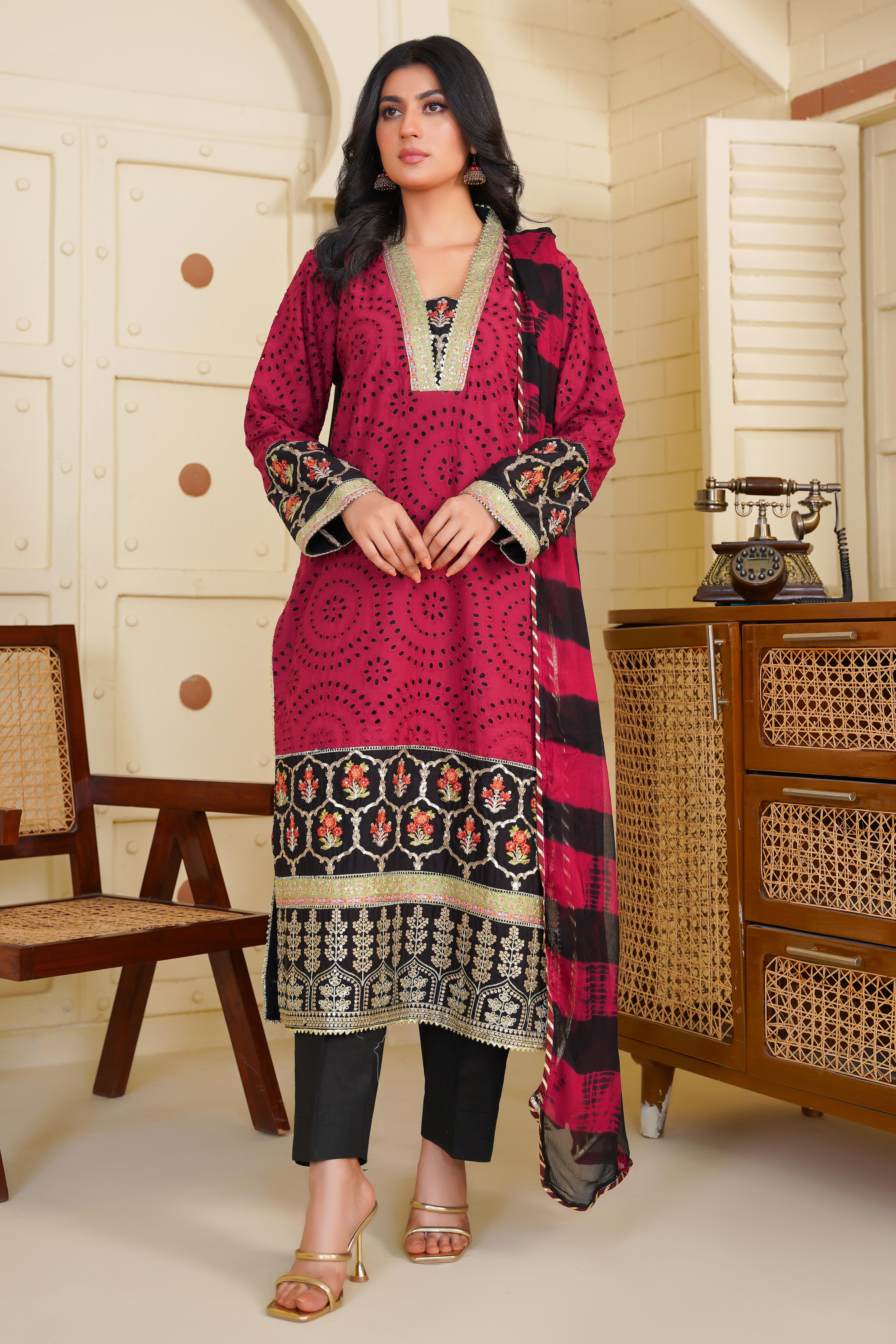 Paired with a gracefully flowing tie-and-dye dupatta in black and maroon, this outfit exudes effortless charm. A matching black trouser completes the look, offering a refined and graceful finish.