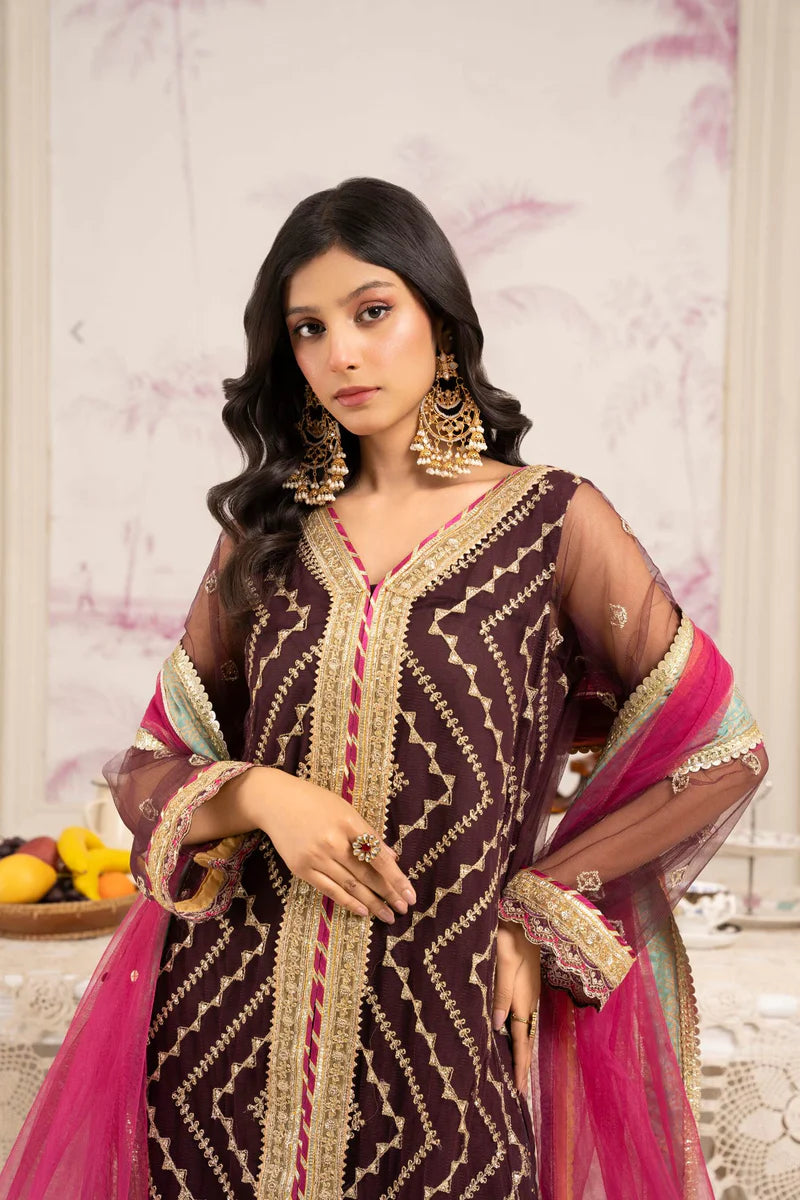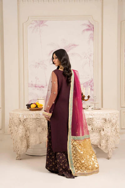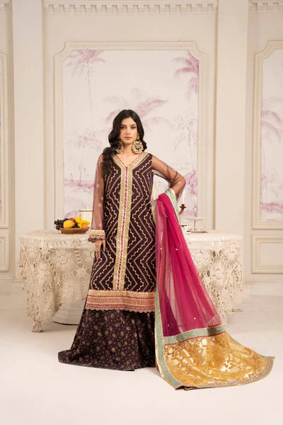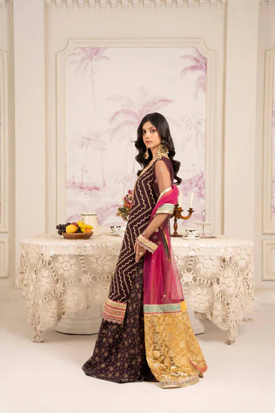 A Luxurious Fusion Of Tradition And Modern Charm, This Deep Plum Ensemble Features An Embroidered Net Shirt Adorned With Intricate Zari And Sequin Detailing That Glimmers With Every Movement. The Printed Raw Silk Sharara Adds A Contemporary Flair, Creating A Striking Balance Of Texture And Elegance. The Outfit Is Beautifully Paired With A Net And Organza Jamawar Dupatta, Embellished With Sequins And A Lavish Gold Border, Exuding Opulence And Refinement. Perfect For Festive Soirées And Wedding Celebrations, This Design Embodies Timeless Grace And Statement-Making Allure.