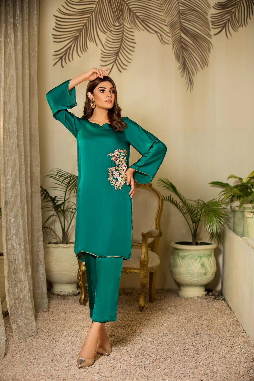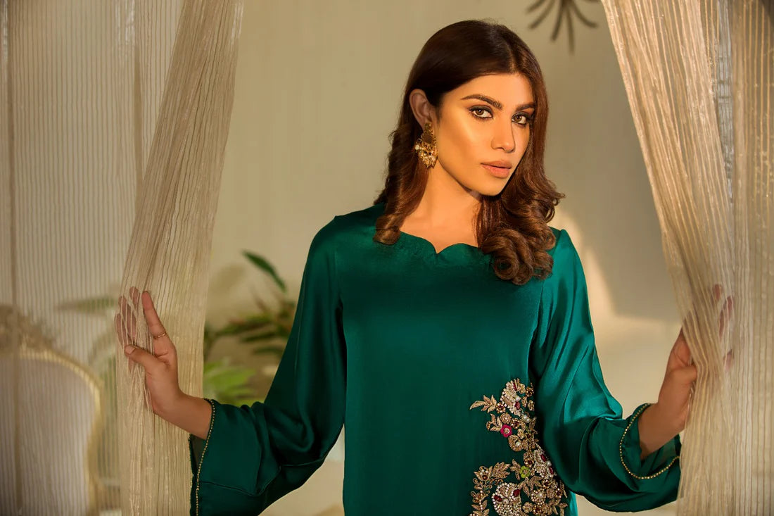 A girl doesn’t need a million-dollar couture gown. Sometimes an elegant ethnic attire is all that’s needed. Pop ethnic is a lustrous deep green dress with an enthralling 3 dimensional Adda and pearl work on the right. This hand-embellished shirt is a perfect go for ethnic attire, paired with the modest shamoz silk straight pants.
