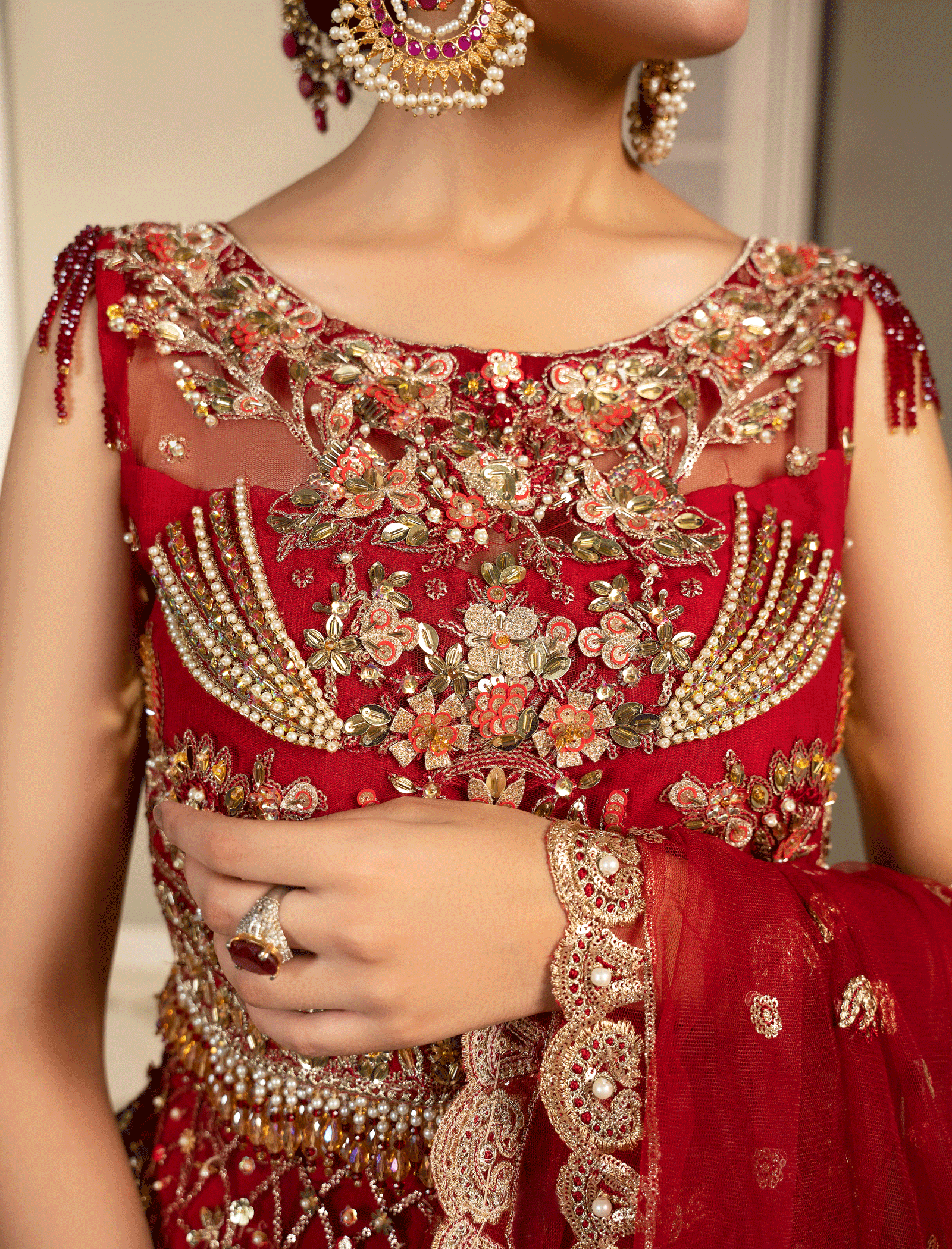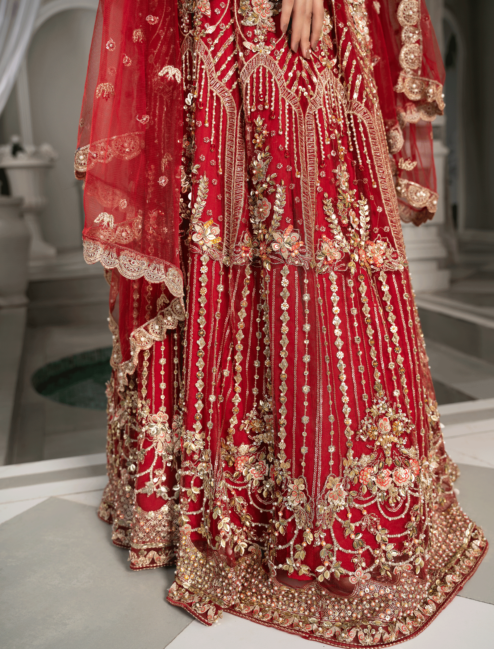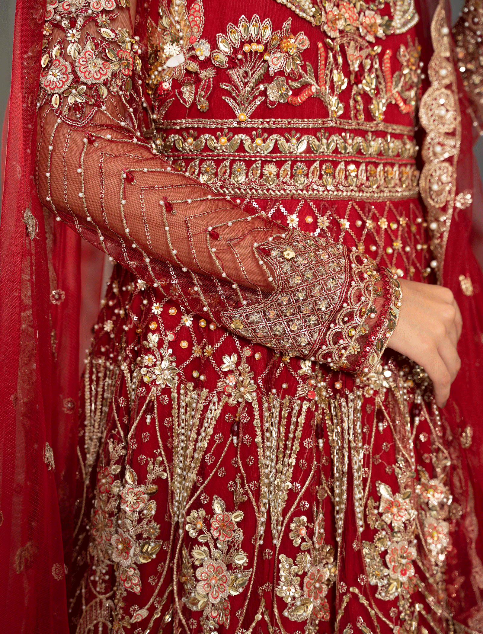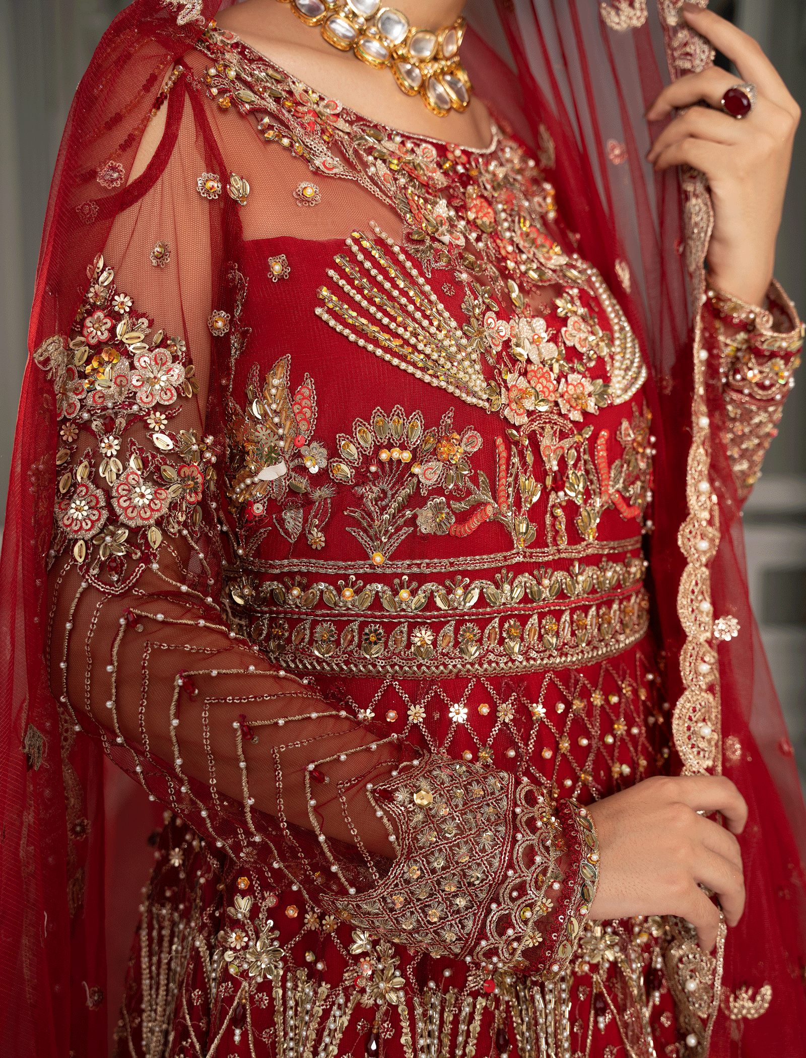 The choli is hand-embroidered and enhanced with zari pati work, crystal, and sequin and pearls work Paired with a Fully embellished paneled lehenga made of Red net with a lighter back. Dopatta with embellished borders on all sides and a cluster spray in the middle. stitching style options are available, lehnga and choli or maxi dress with Dopatta.