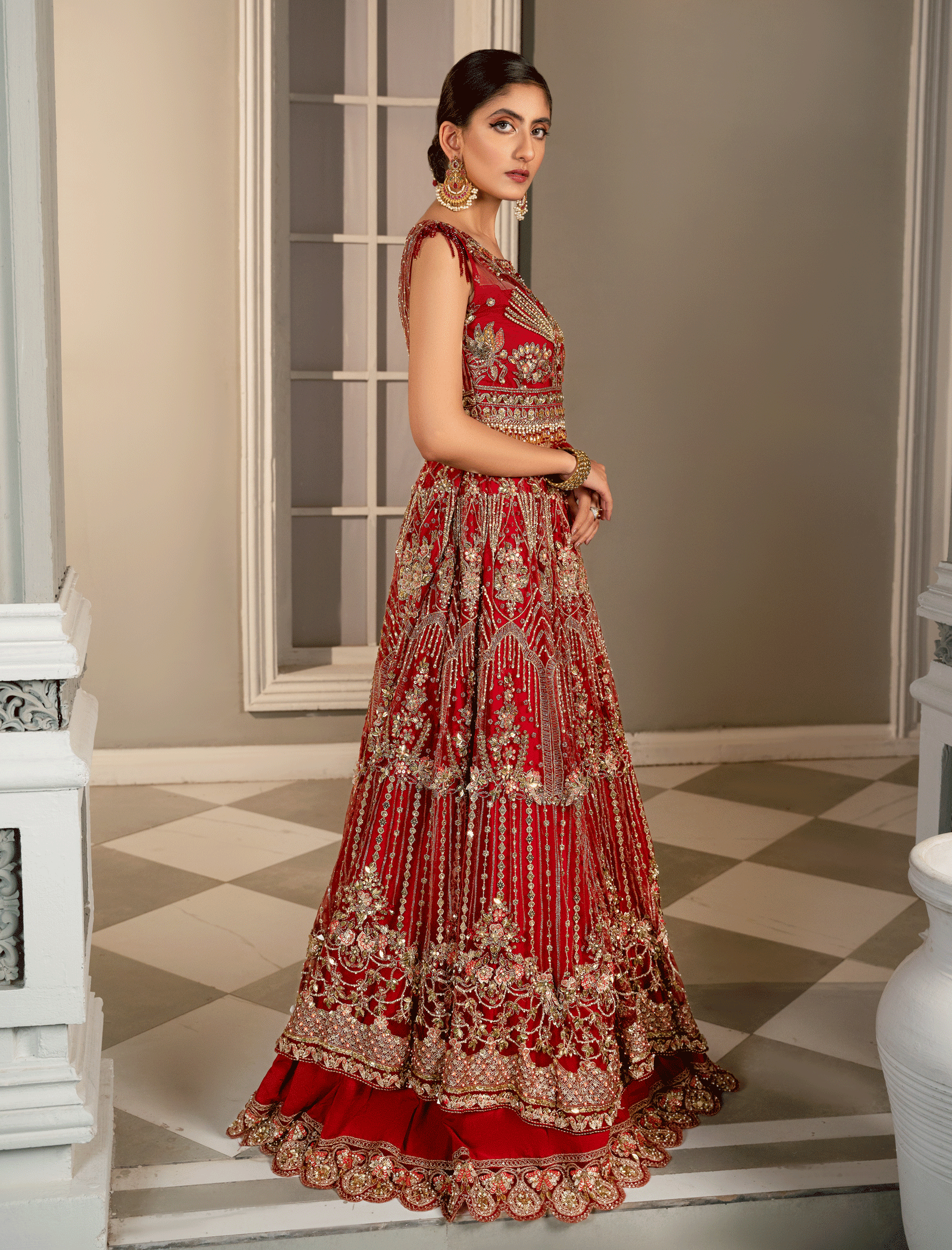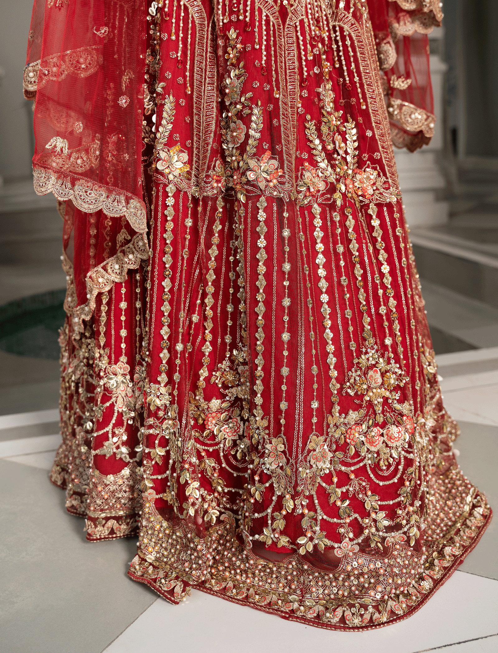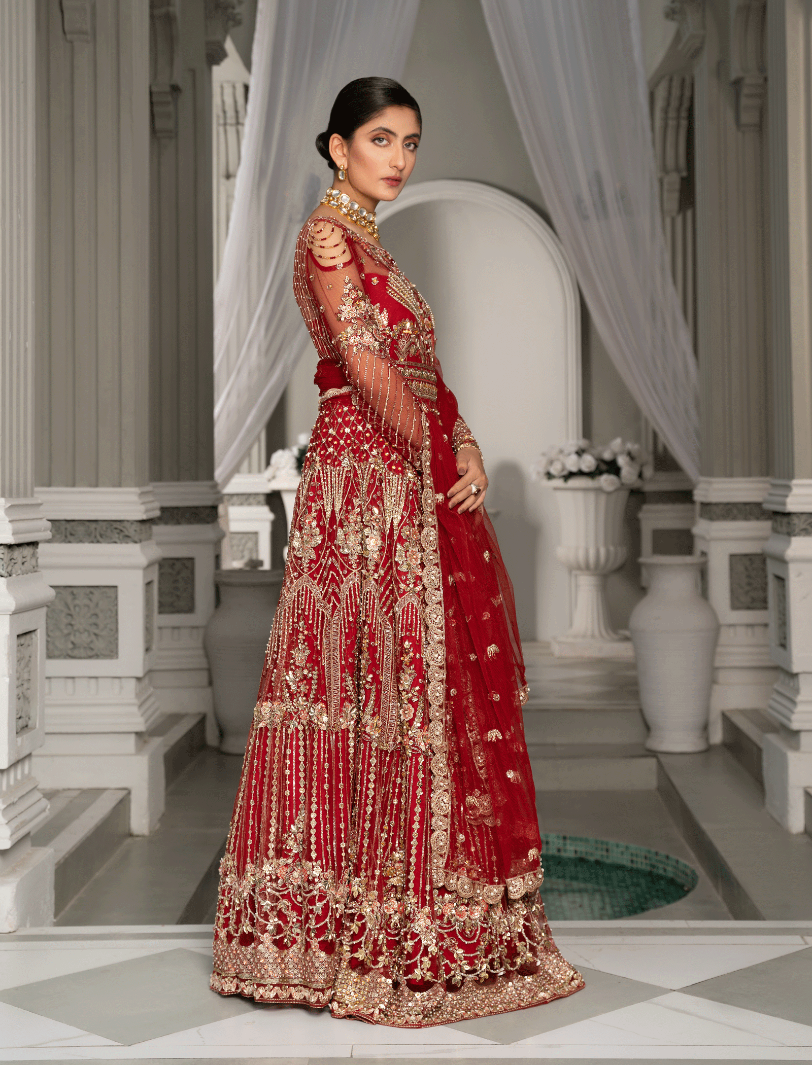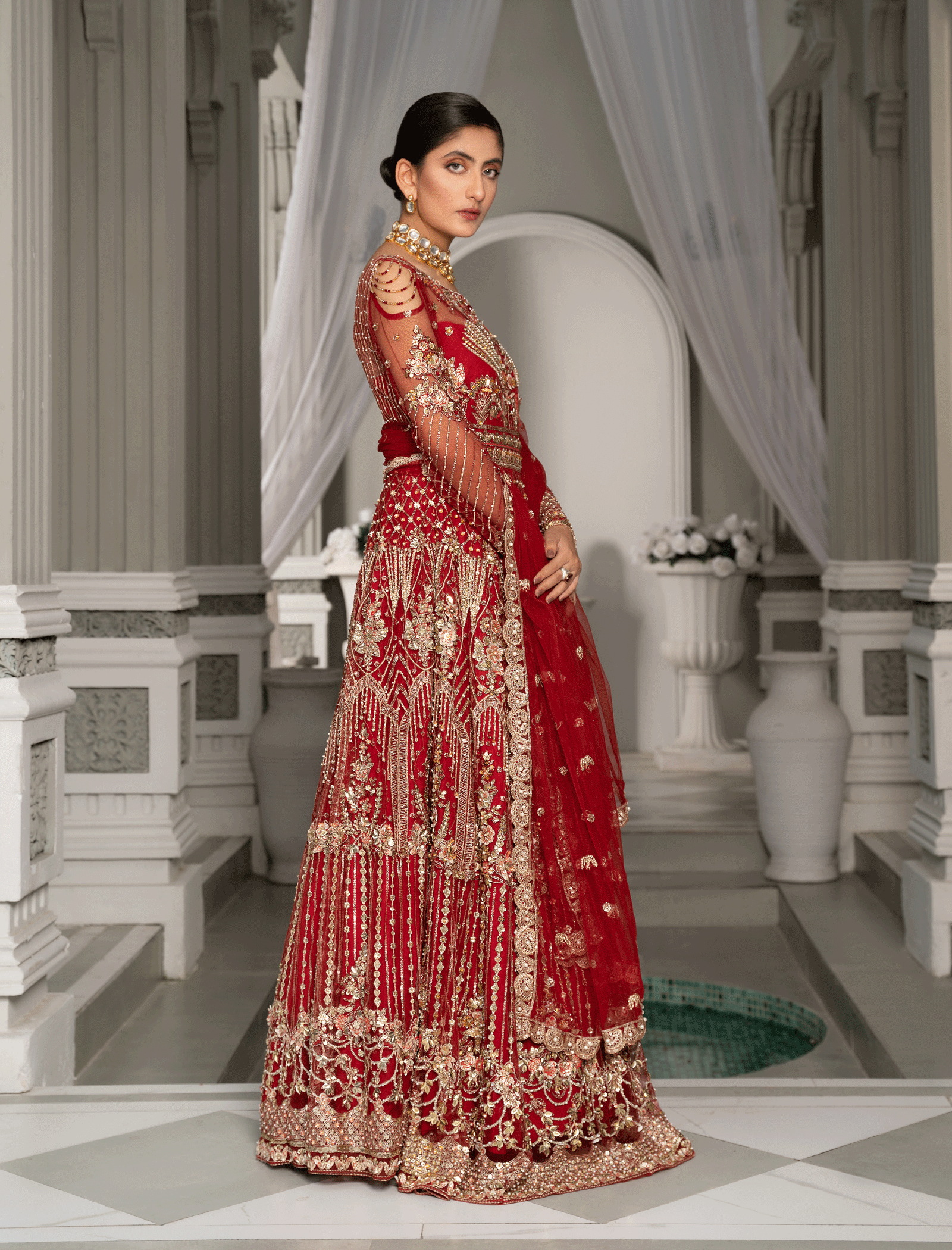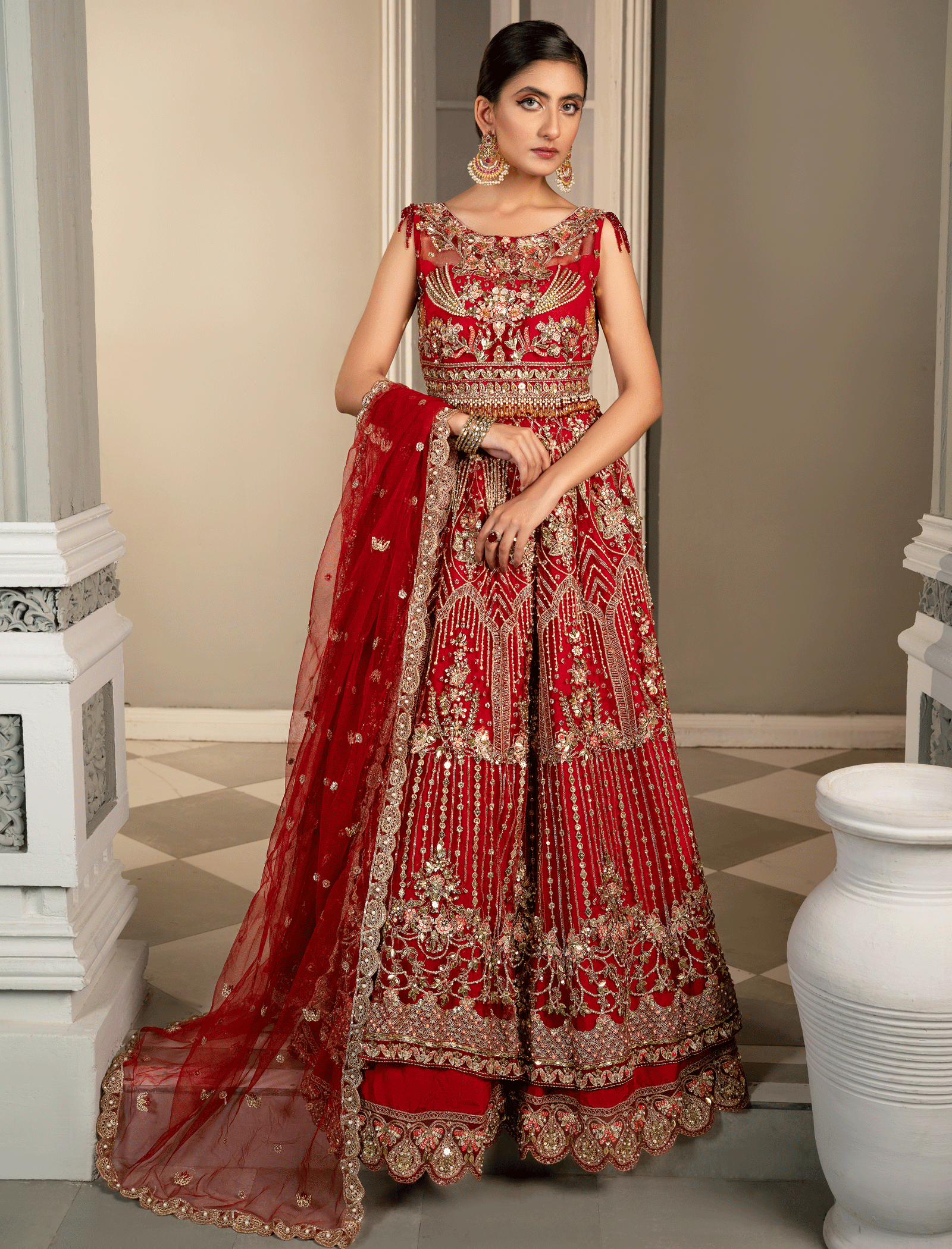 The choli is hand-embroidered and enhanced with zari pati work, crystal, and sequin and pearls work Paired with a Fully embellished paneled lehenga made of Red net with a lighter back. Dopatta with embellished borders on all sides and a cluster spray in the middle. stitching style options are available, lehnga and choli or maxi dress with Dopatta.