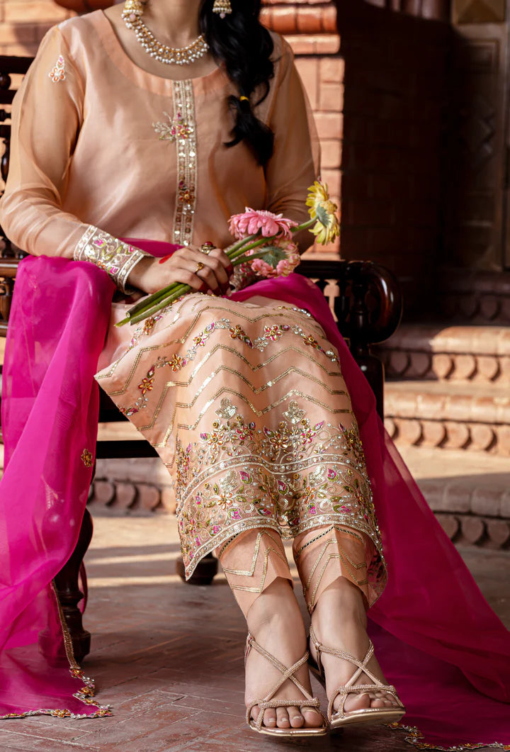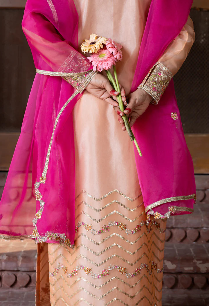 Embrace a touch of springtime whimsy with this captivating peach dress. The long, straight-cut Organza shirt drapes beautifully, offering a light and airy feel. The front and back damaan boasts intricate embroidery, adding a touch of elegance and drawing the eye. The matching peach trousers, crafted from smooth Raw Silk, create a clean and modern silhouette. The star of the show, however, is the flowing Organza dupatta in a bold hot pink. This unexpected pop of color injects a playful energy into the outfit, making it perfect for a stylish statement. For ultimate comfort, a soft Katan silk lining ensures a smooth layer against your skin, allowing the beautiful outer fabrics to take center stage. This versatile dress can be dressed up or down depending on the occasion, making it a perfect choice for day or evening events.