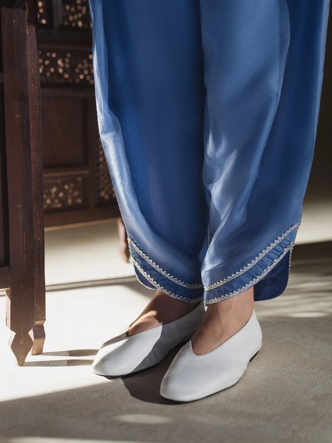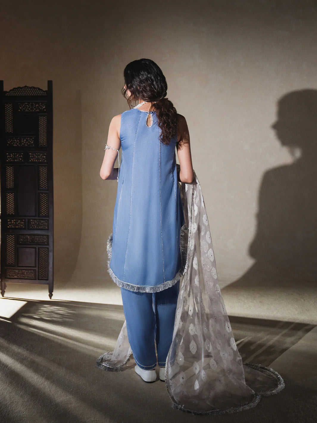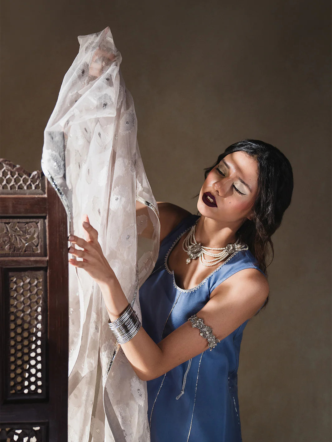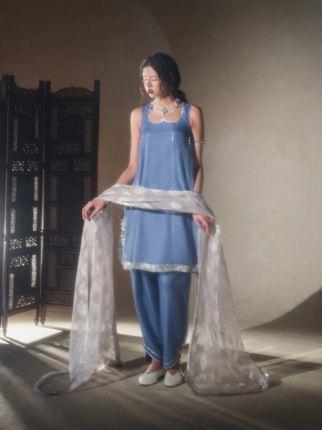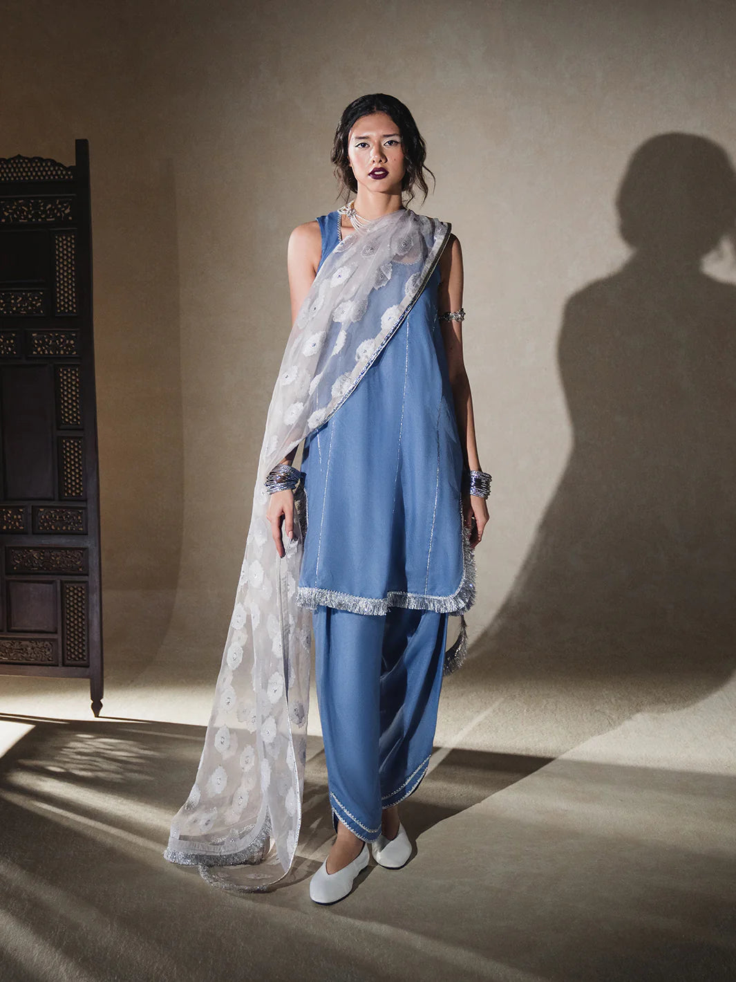 A periwinkle blue tarizdar organza kameez with a delicately stitched invisible inner lining, featuring an inverted dil wala gala and finished with chandni kiran and champa gota at the hem. Paired with a matching organza narrow shalwar invisibly stitched lining, neatly detailed with silver kinari at the painchas for a clean, graceful finish. The look is brought together with a surmayi zari organza dupatta, adorned with inverted heart-shaped pallu motifs and trimmed with chandni kiran — light, glistening, and full of charm.