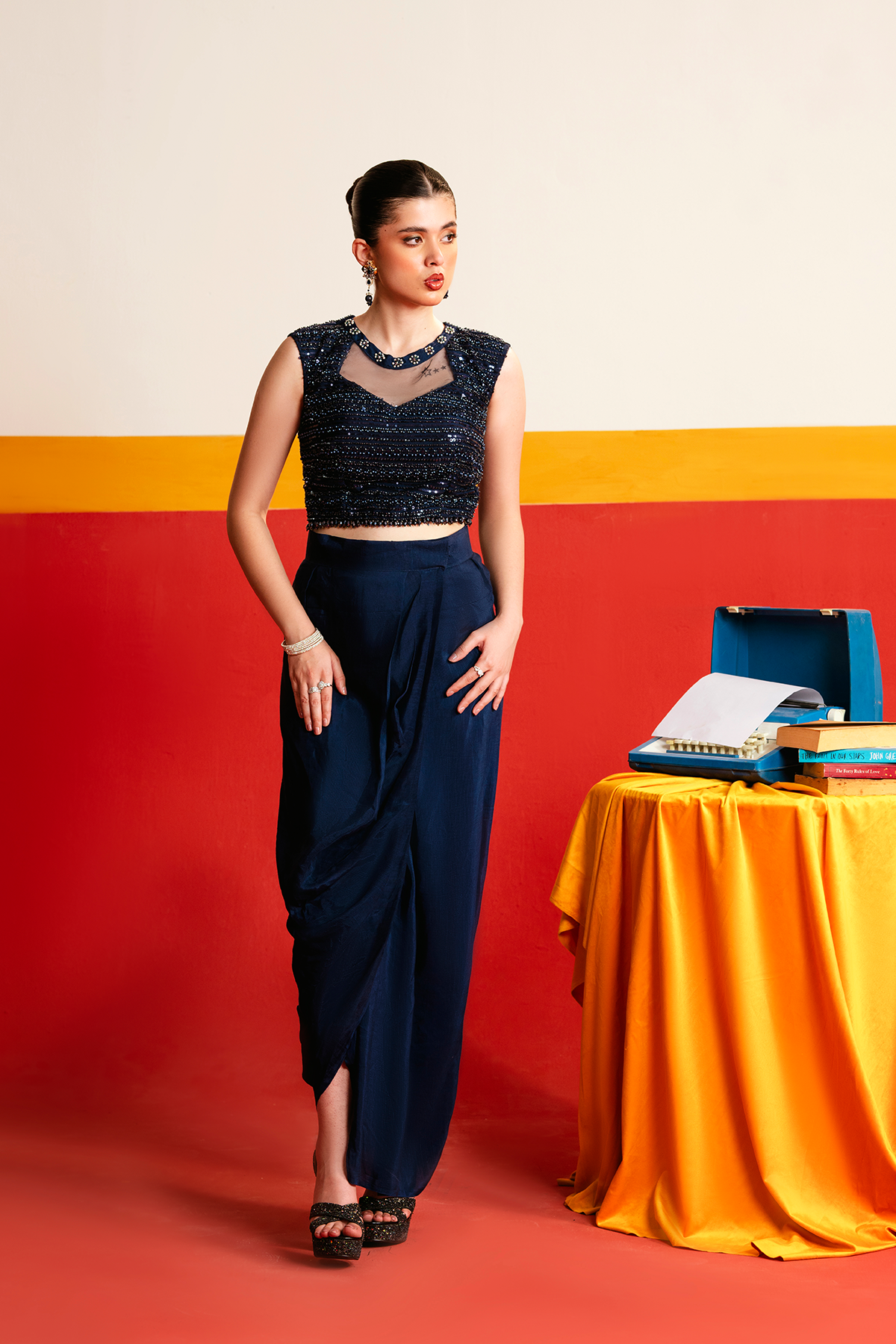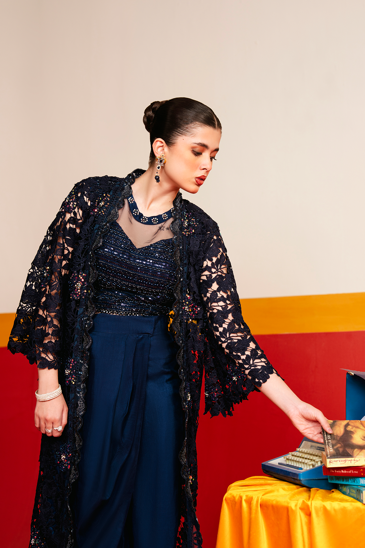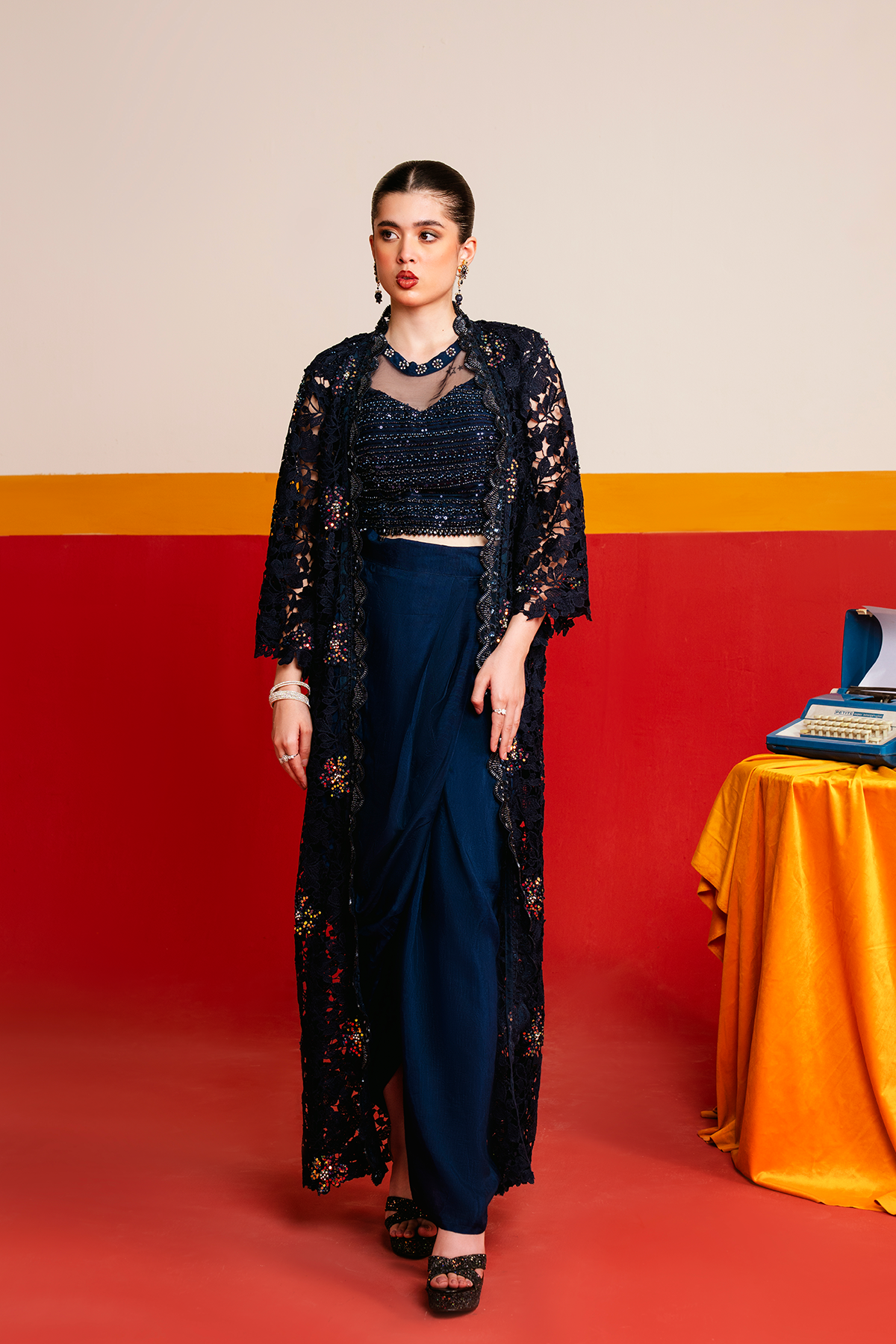 In serene sapphire blue, this ensemble emanates elegance. A flowing skirt and delicate blouse pair seamlessly with an ornate, embellished overcoat, evoking luxury and allure.