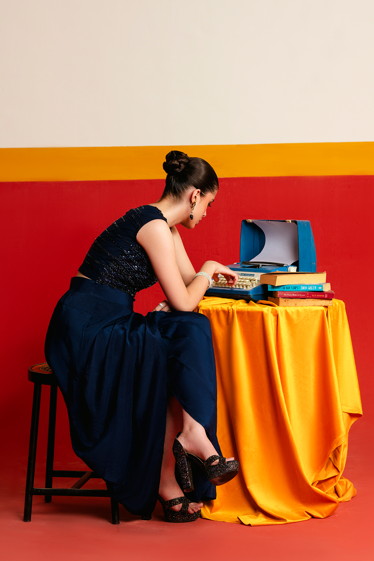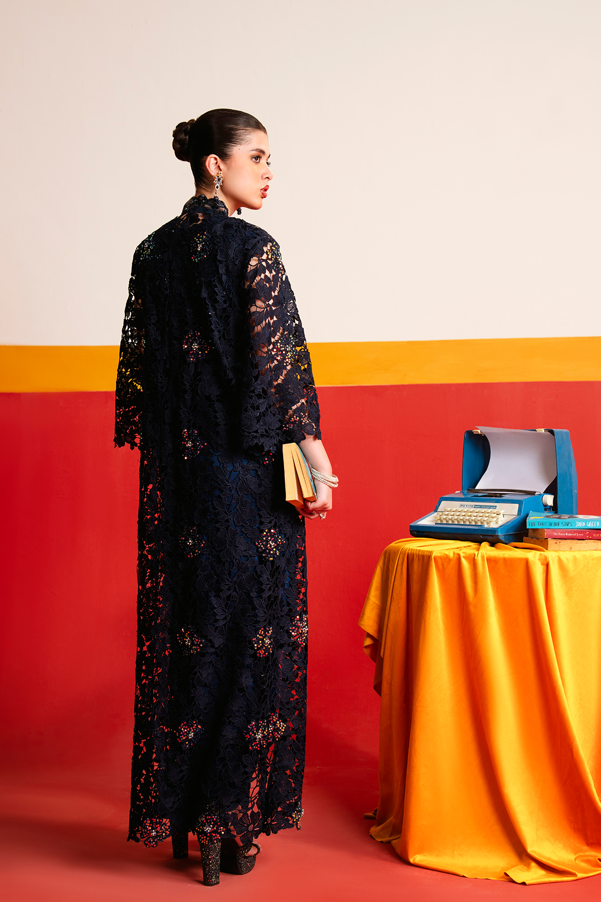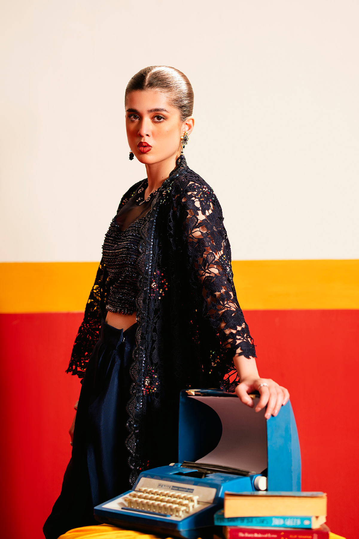 In serene sapphire blue, this ensemble emanates elegance. A flowing skirt and delicate blouse pair seamlessly with an ornate, embellished overcoat, evoking luxury and allure.