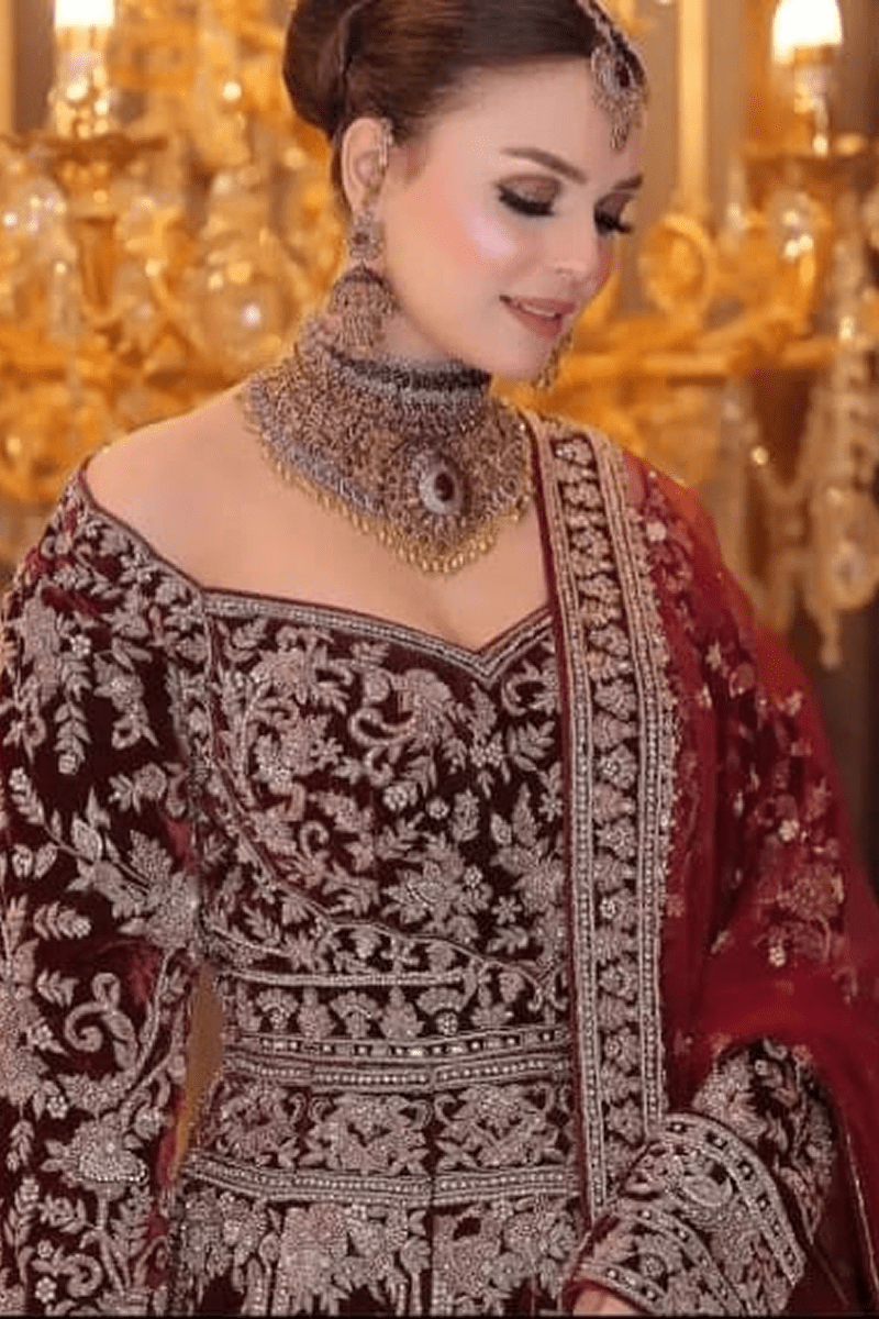 Lehenga: Reddish Maroon lehenga with a grand 120-inch flare, elegantly finished with a rich golden dabka work.