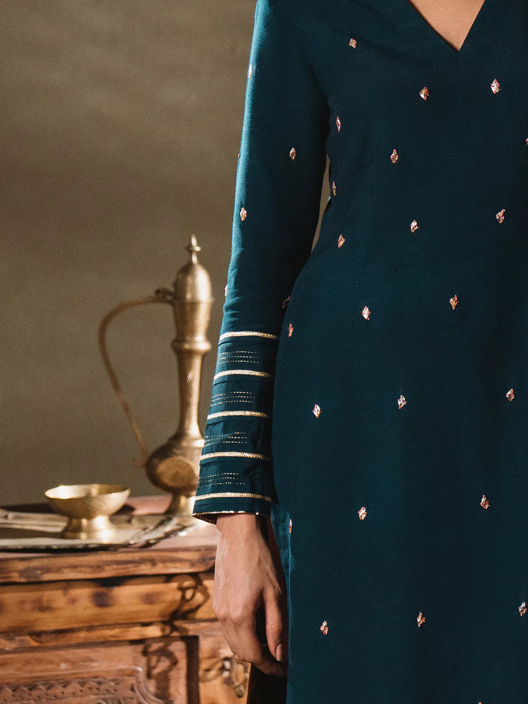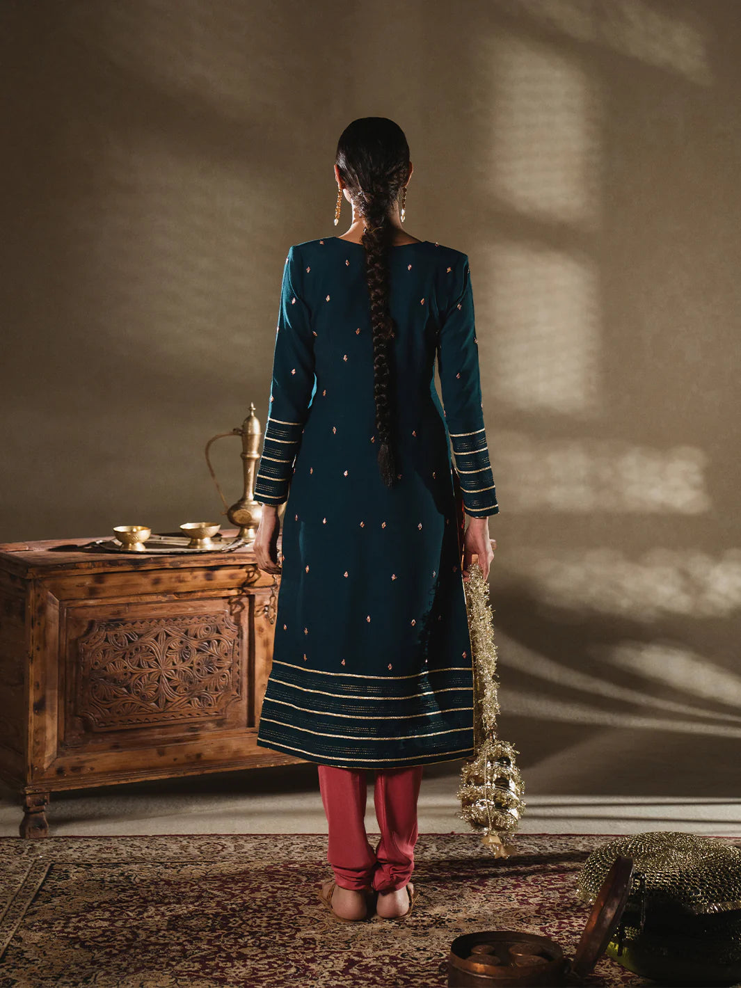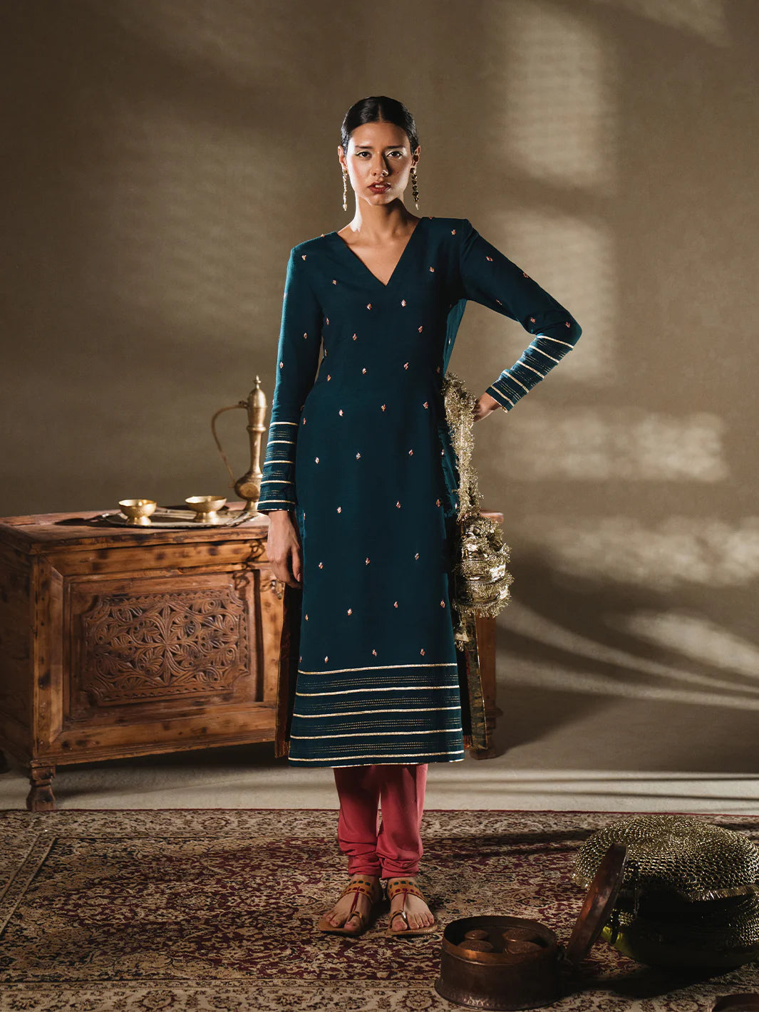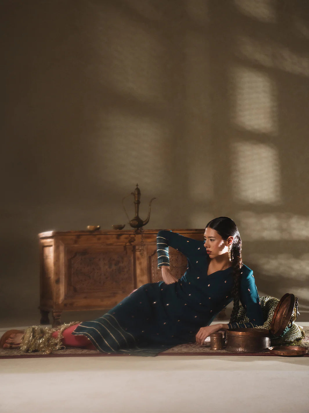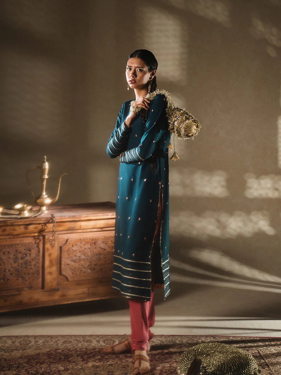 A long Shadabi Neelum kameez in raw silk, structured with subtle shoulder pads. The body is adorned with a barfi aakaar chann crafted from tamba gota patti and embroidered gulabi resham. The daman and sleeve cuffs are finished with intricately stitched horizontal sunehri tilla taanka, gota kinari, and soft pleating — a nod to traditional craftsmanship, lined with chaura lappa for a subtle inner shimmer.