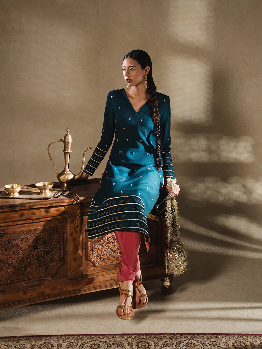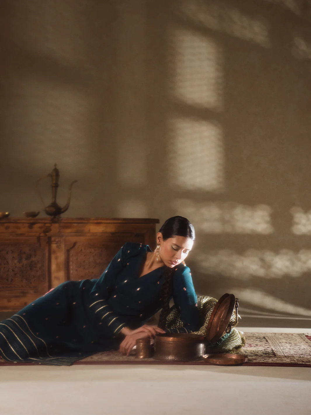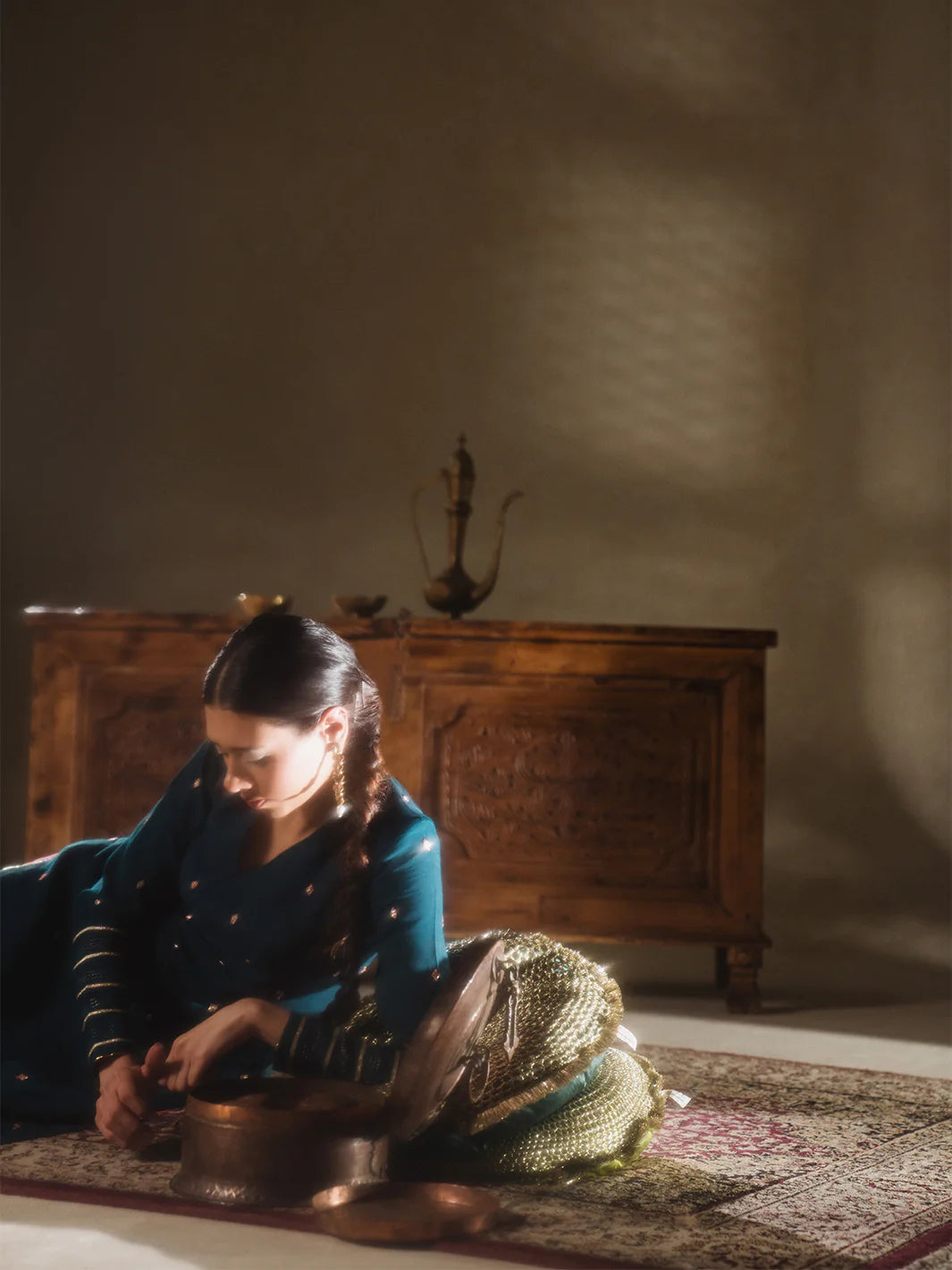 A Shadabi Neelum raw silk kameez, embroidered in a barfi aakaar chann of tamba gota patti and gulabi resham — delicate, detailed, and rich with movement. The daman and sleeves are intricately finished with horizontal sunehri tilla taanka, fine pleats, and traditional gota kinari, all tied together by a chaura lappa stitched on the inside. Paired with a contrasting Gul-e-Nari grip chooridar, Rewa brings together rich textures and timeless techniques — festive, feminine, and quietly powerful.